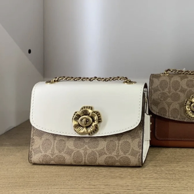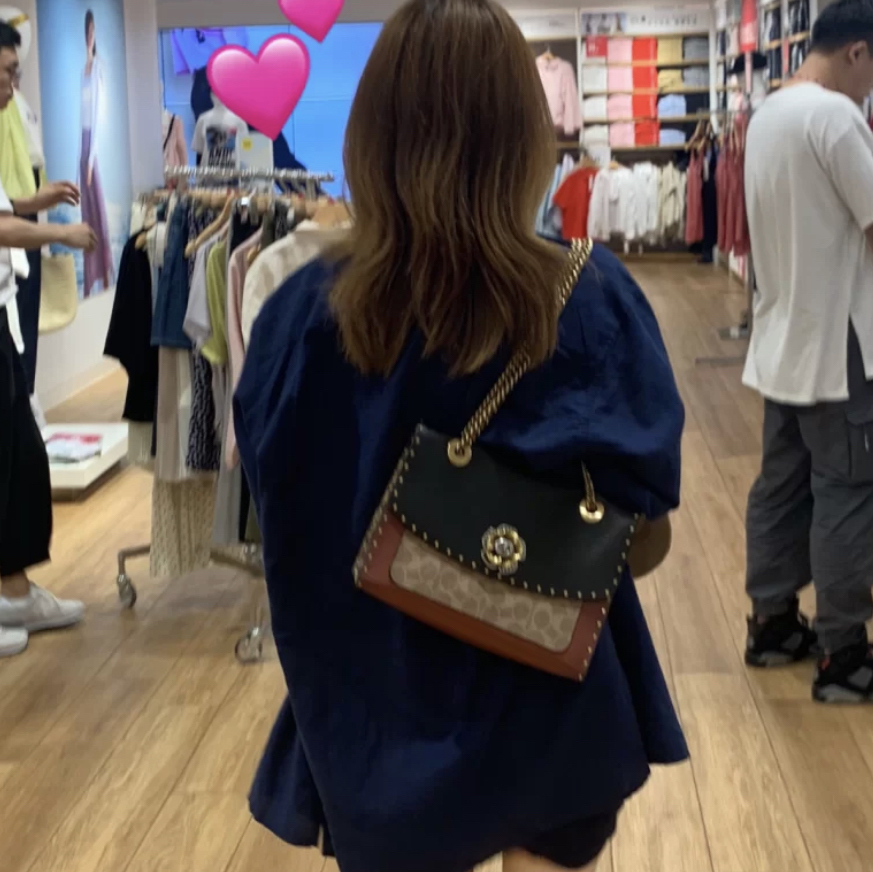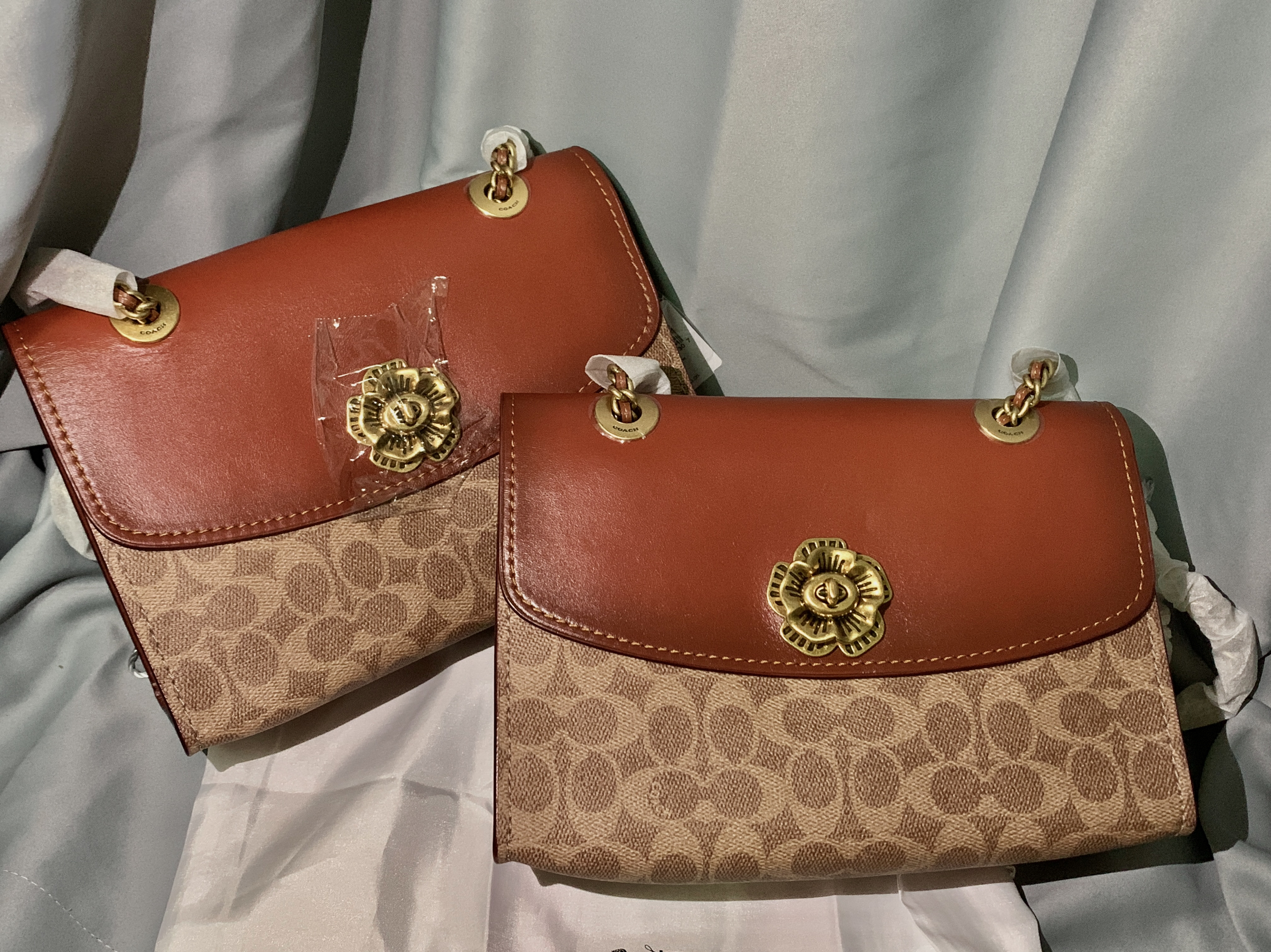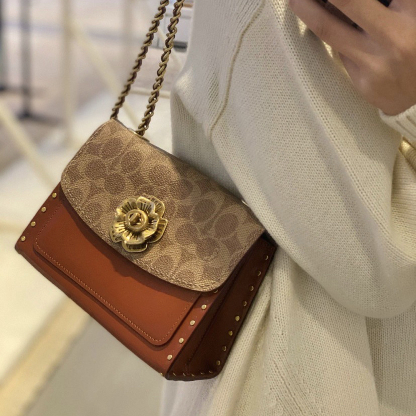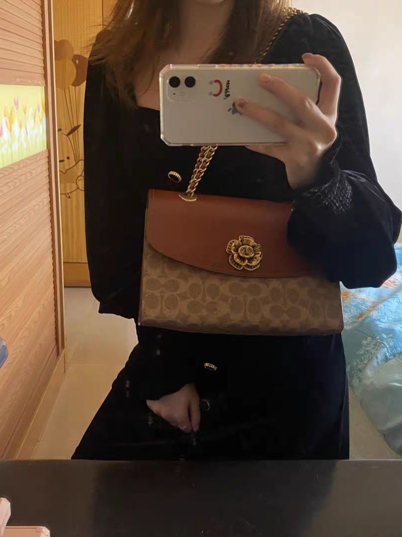 本篇笔记关联了Coach Parker 26 中号 山茶花老花印花涂层侧面蛇纹铆钉边饰帆布配皮饰边单肩手提链条包斜挎包 黑拼红棕色等商品,为用户提供真实的使用体验和购买参考。