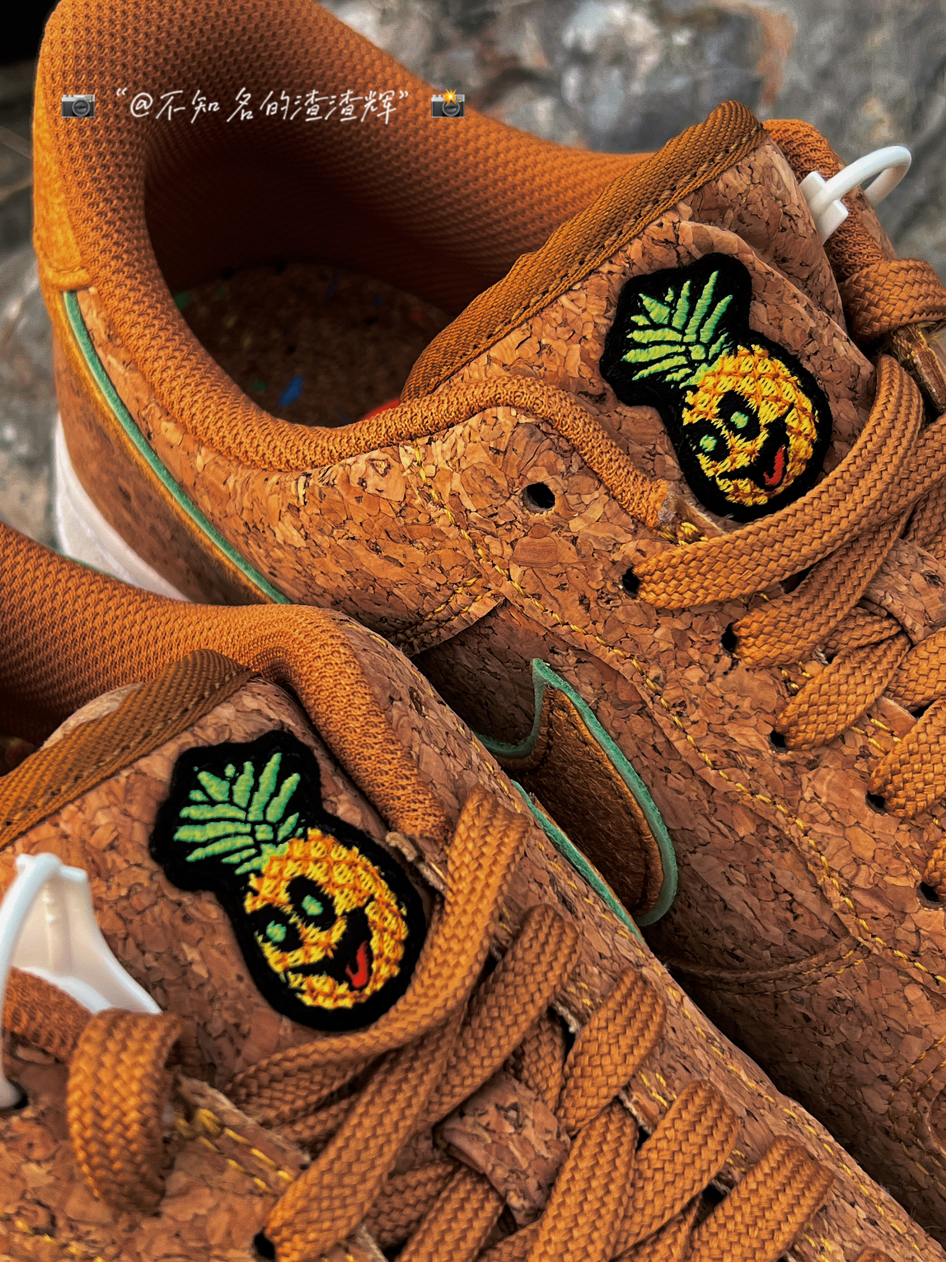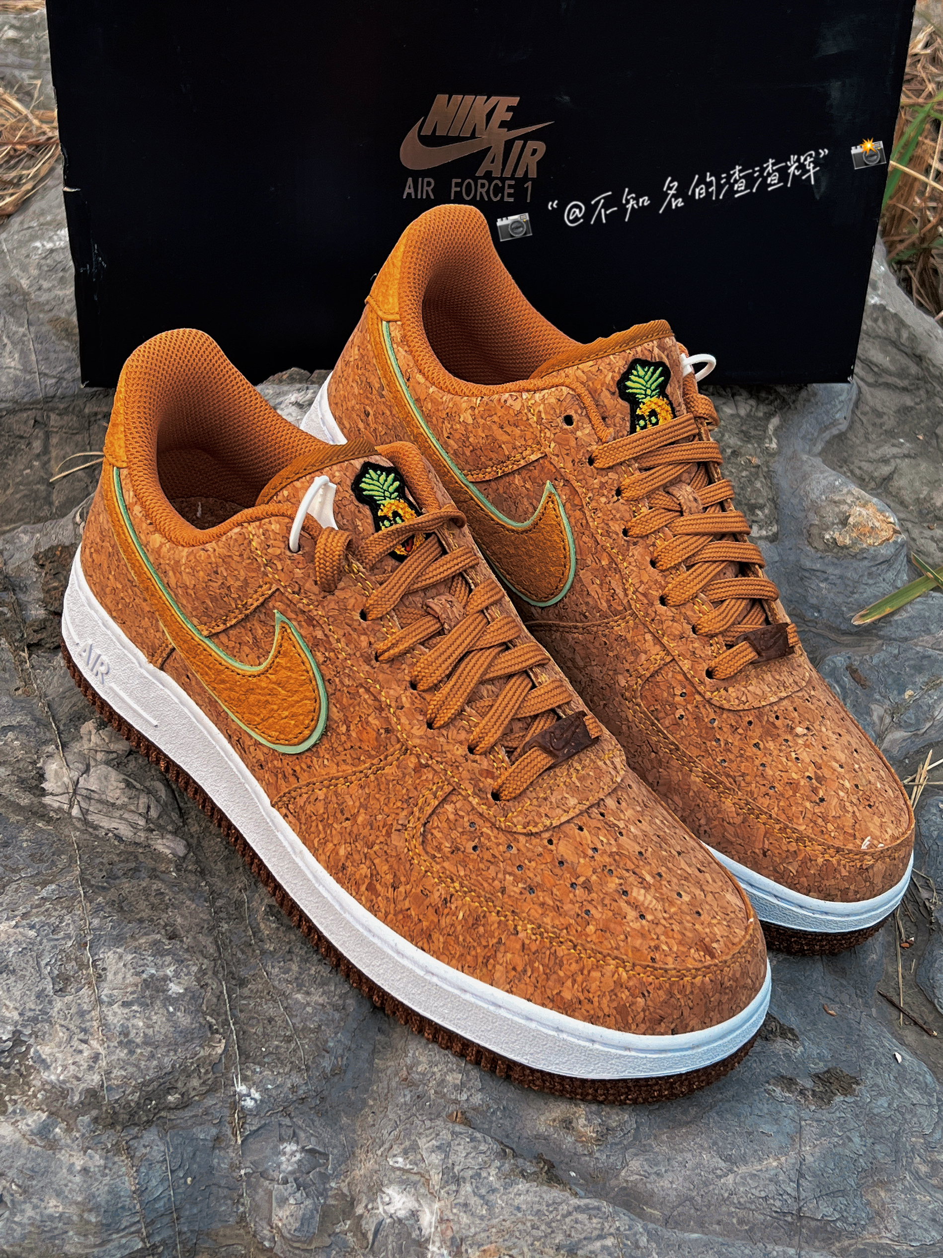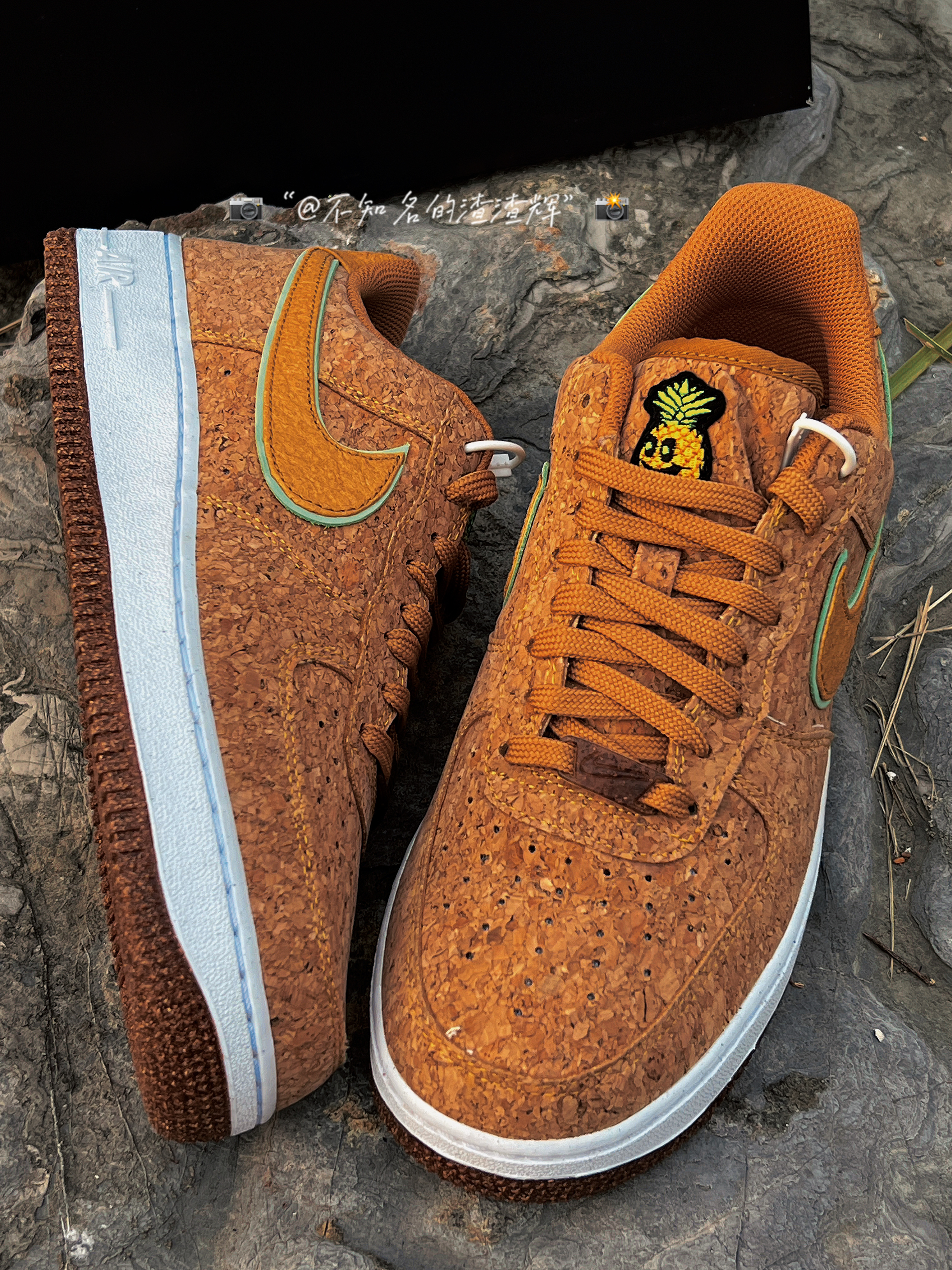 🍍:Nike Air Force 1”07 Low “Pineapple Cork”软木塞 菠萝 棕色 🍍:这双鞋子采用了回收软木鞋面,Swoosh采用了浅绿色和黄色双层叠加设计,鞋舌有着菠萝🍍印花,白色中底依旧干净整洁,外底的话采用了“软木塞”独特设计风格,中底采用了Air Sole 缓震气垫,脚感依旧越踩越舒适 🍍:不得不说看这双鞋子眼多少有点花,有密集恐惧症的朋友应该不会喜欢吧 🍍:尺...