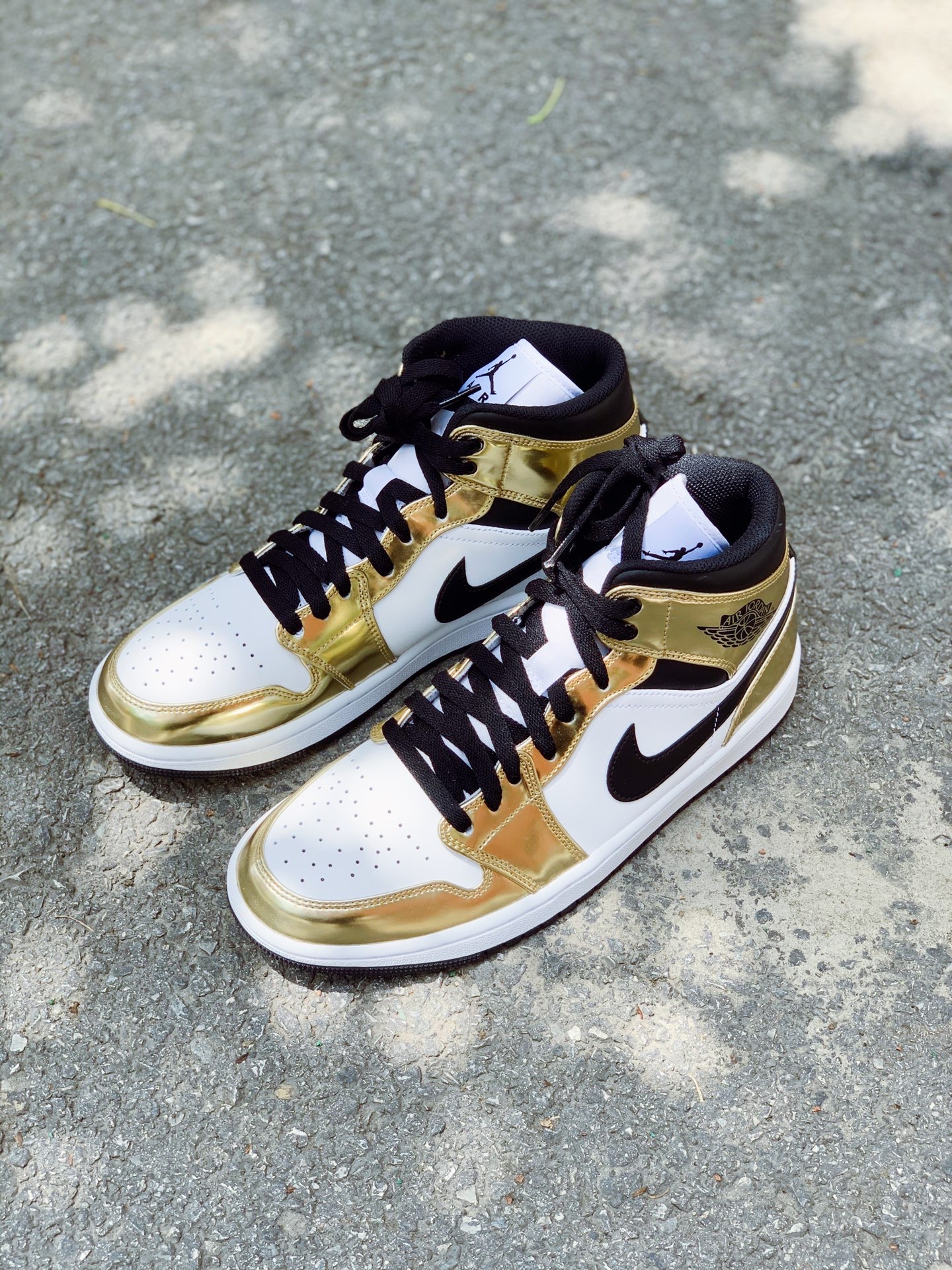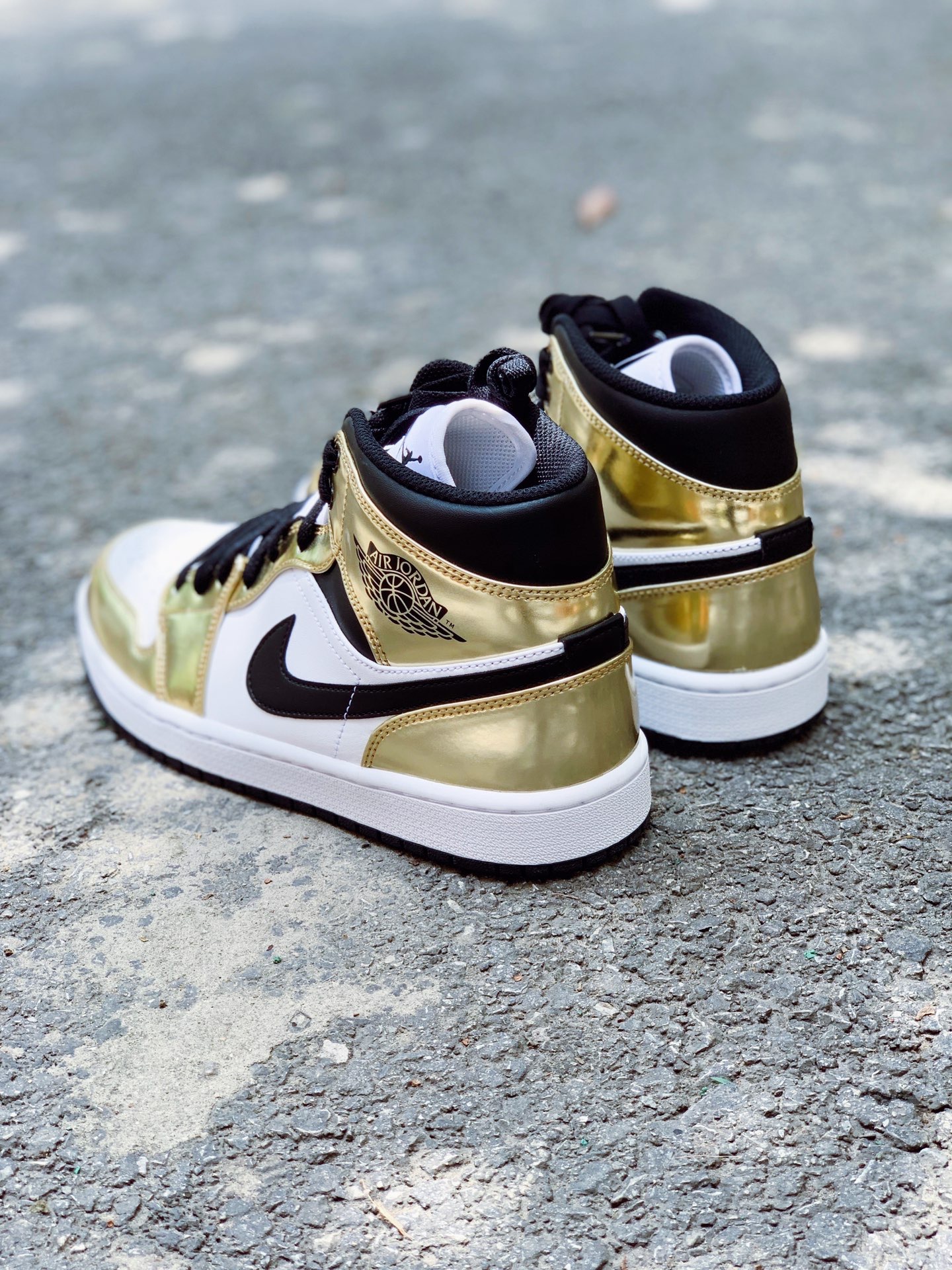 👟:Air Jordan 1 mid 液态金 👉🏻:这是一双辨识度极高的球鞋,电镀的金色看起来异常的亮眼。搭配整体的黑白两色,穿上就会让你身价不菲了起来😎。另外这双鞋和白丝绸撕掉丝绸面后的样子颇为相似,作为一双平替是不是也挺不错的? 🗣:相较于此前的价格,现在性价比蛮高的,无论收藏还是自穿都是十分不错的选择。