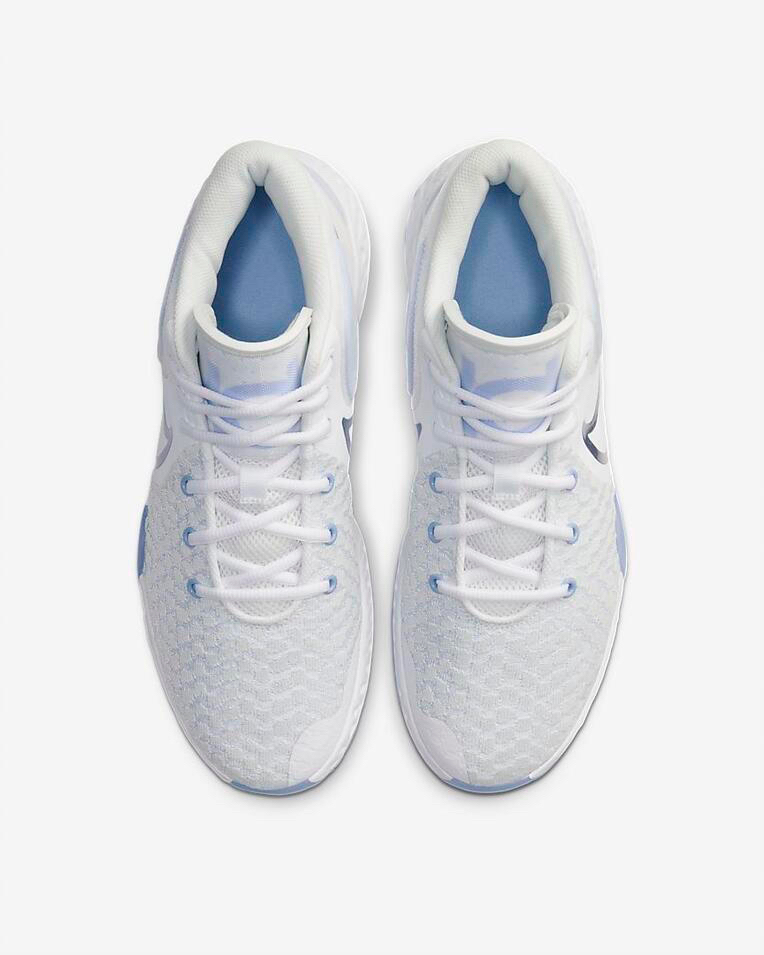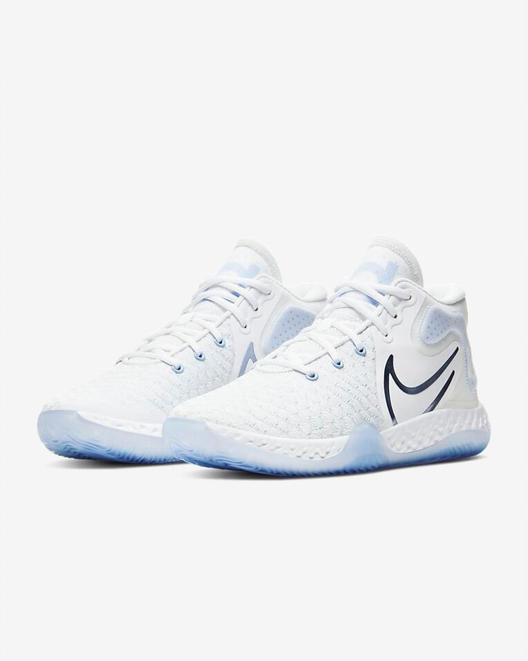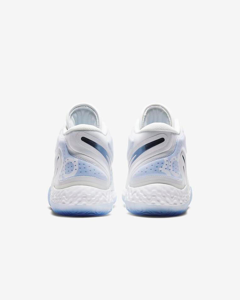 这双Nike KD Trey 5 VIII的鞋面部分,采用了白色作为球鞋的基础配色,在球鞋的外底、后掌和鞋舌外部,Nike以蓝色进行点缀,使得这双球鞋整体看起来有一种“白中泛蓝”的视觉感受,球鞋整体的颜值相当不错。 这双Nike KD Trey 5 VIII的后跟部位,Nike做了一个TPU模块设计,目的在于增强球鞋后跟部位的包裹性能。 这双Nike KD Trey 5 VIII的鞋面部分,大...