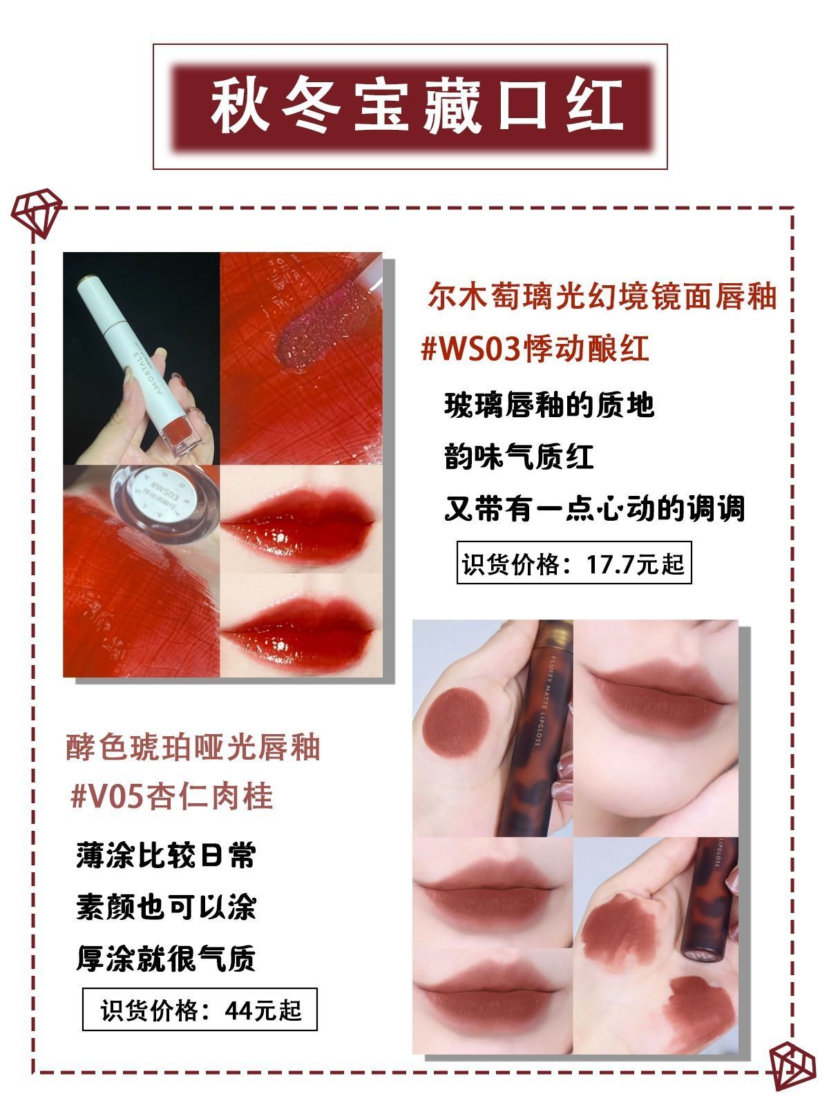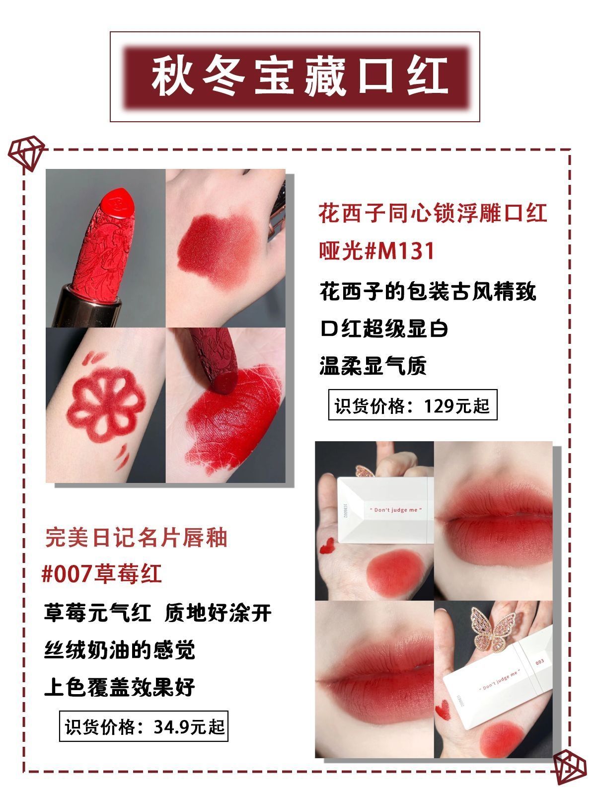 " 🌿🍀秋冬来临之际,不仅要换穿搭,还要换一下我们的口红色号呀,这些李佳琦推荐的宝藏口红单品平价又百搭!快码住!抓紧收藏! 🌿1.花西子同心锁口红浮雕雕花哑光唇膏 #M131 识货价格:129元起 推荐理由:花西子的外包装古风精致,口红超级显白,温柔显气质,保湿不拔干,上唇无感,特别轻薄顺滑,糯软的触感,丝绒质地 🌿2.完美日记 名片唇釉 4g、#007草莓红 识货价格:34.9元起 推荐...