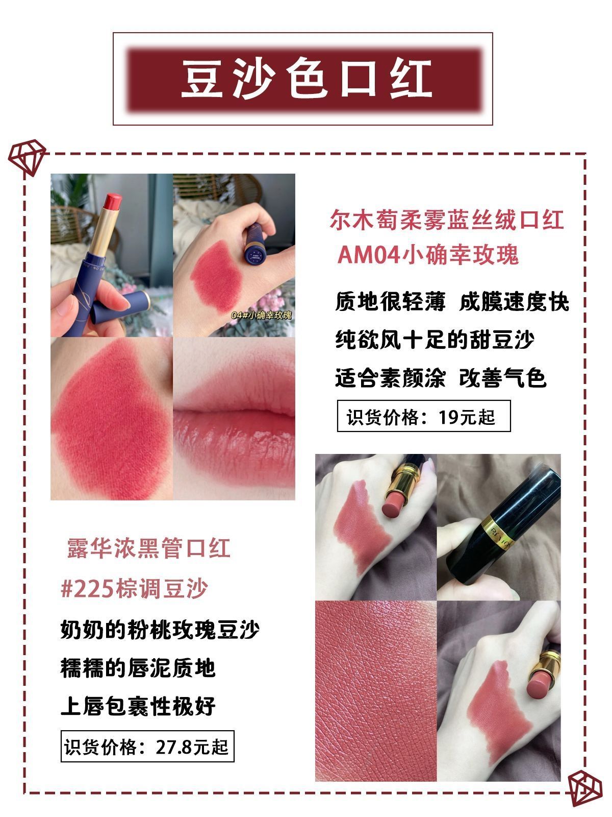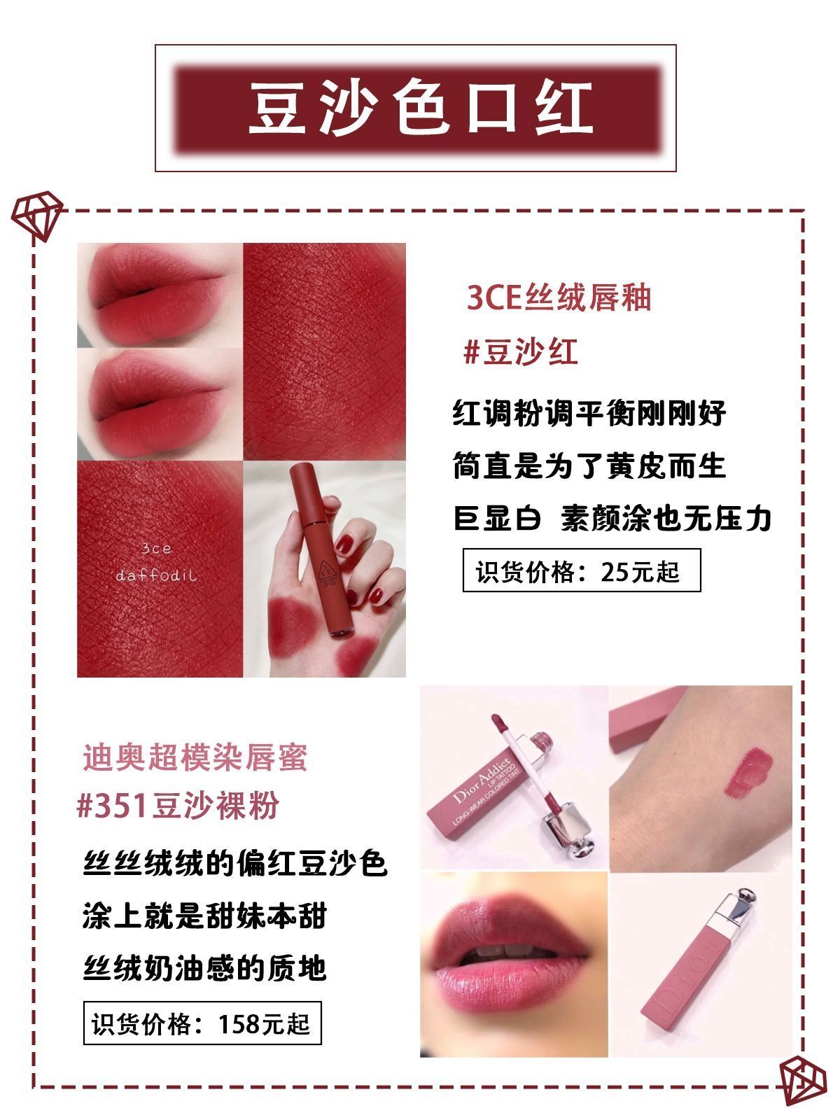 🌷🌸我总觉得豆沙色是甜妹该有的颜色,不仅显气色,还很温柔甜美,这些宝藏豆沙色口红合集可是我精挑细选!快来看看有没有你心动的颜色! 🌼1.3CE丝绒唇釉 #豆沙红 识货价格:25元起 推荐理由: 红调橘调粉调平衡得刚刚好,简直是为了黄皮而生,巨显白 素颜涂也无压力 🌼2. 迪奥超模染唇蜜口红 #351豆沙裸粉 识货价格:158元起 推荐理由: 丝丝绒绒的偏红豆沙色,涂上就是甜妹本甜,奶油豆...