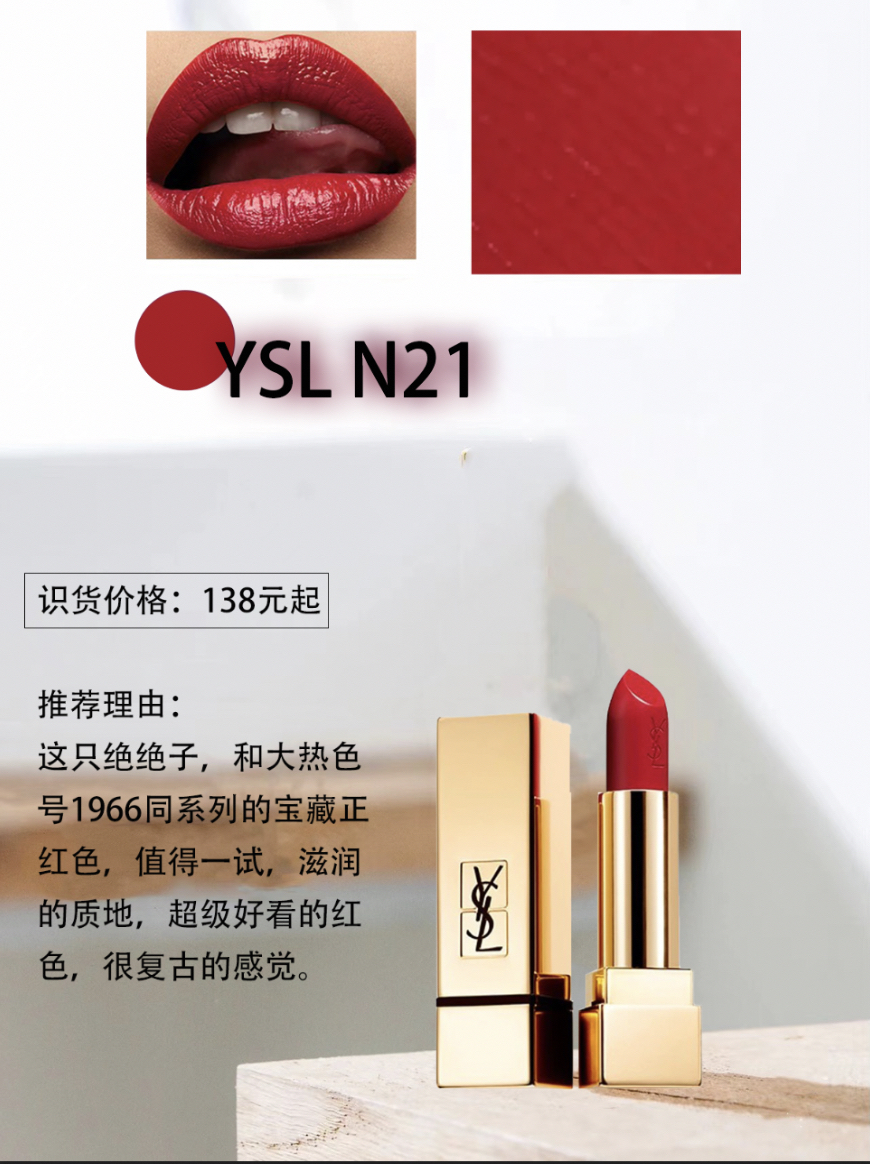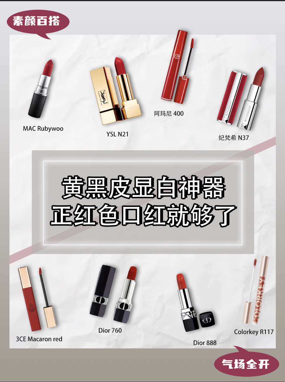 🔥黄黑皮的妹子们有福了,特意为大家整理了黄黑皮显白神器合集,每一个都美到让人想再多看几眼,只能说正红色口红yyds 🌟MAC/魅可 全色号子弹头唇膏口红 3g #707RUBYWOO 识货价格:87.8元起 推荐理由:要说显白,正红真的盲选不会出错,这一支有一些蓝调的正红,很经典,黄黑皮的妹子们买起来 🌟YSL/圣罗兰 方管口红 3.8g N21 识货价格:138元起 推荐理由:这只绝绝子,和...