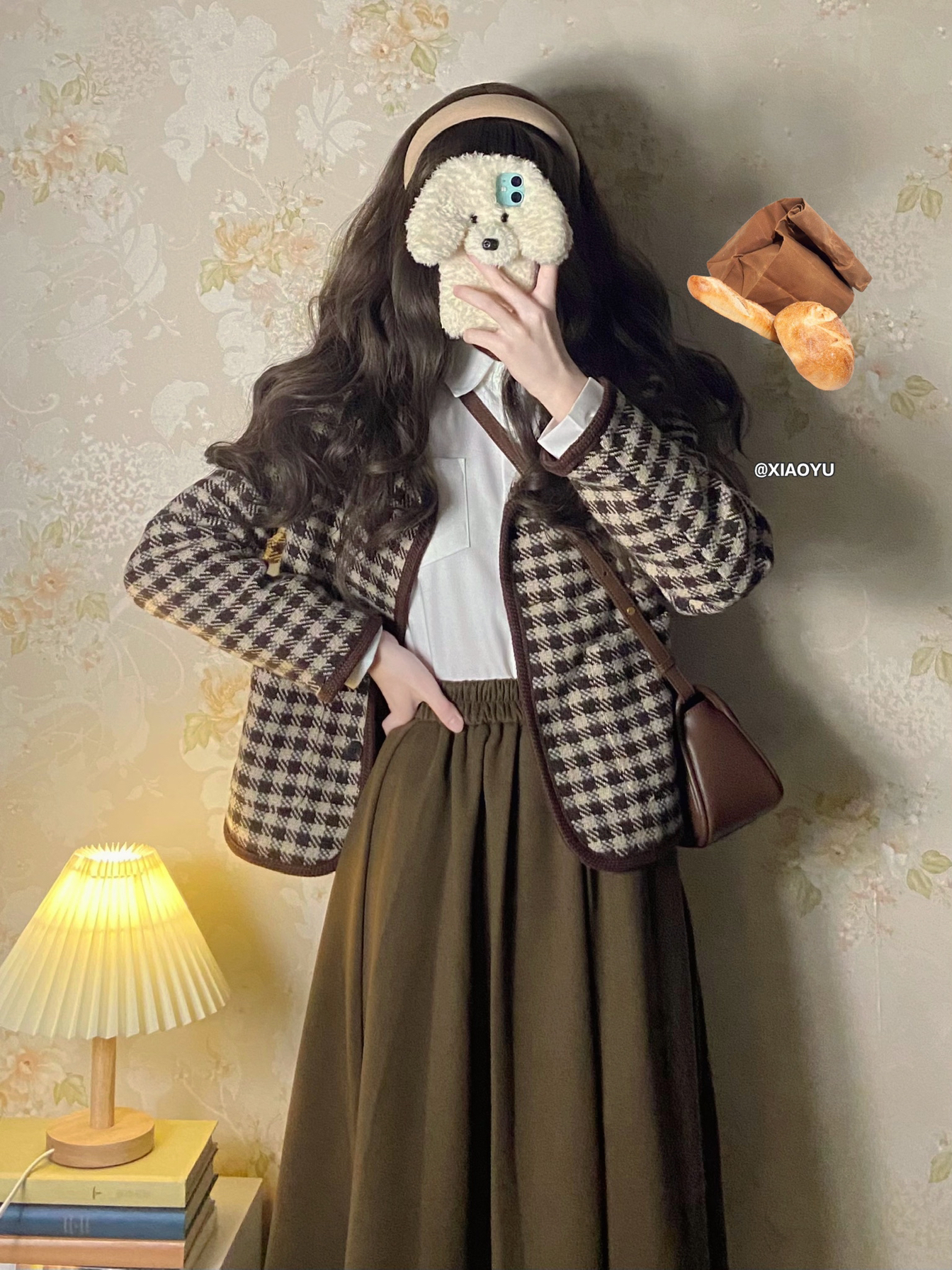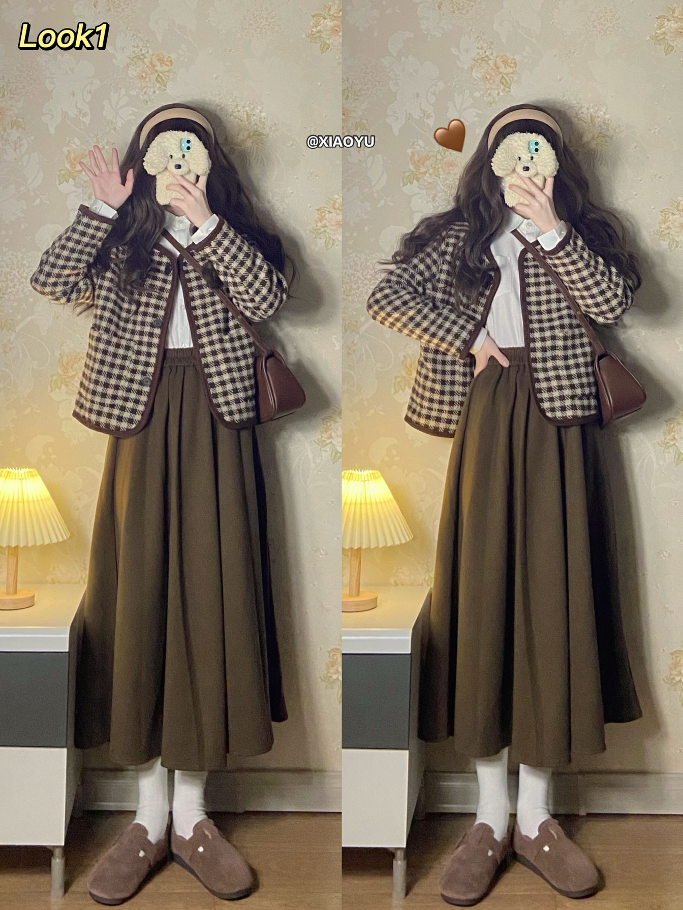 宝贝们晚上好~ 低饱和度的色系真的太温柔了☺️ 🏷净身高160 体重39kg(这篇穿鞋164) - 🌰Look1 ▪️短款棕色千鸟格外套:AmiGirl(s码)💰238 ▪️棕色毛呢长款半身裙:嘉嘉 独家定制大码女装(s码)💰78 ▪️卡其色宽边发箍:pdd婧岳饰品 💰3 ▪️棕色加绒毛毛雪地鞋:喵唔的天空 非喵呜的天空 💰143 💬这一套很有秋冬的氛围感 短款的格子外套很显高 78块钱的半身裙质...