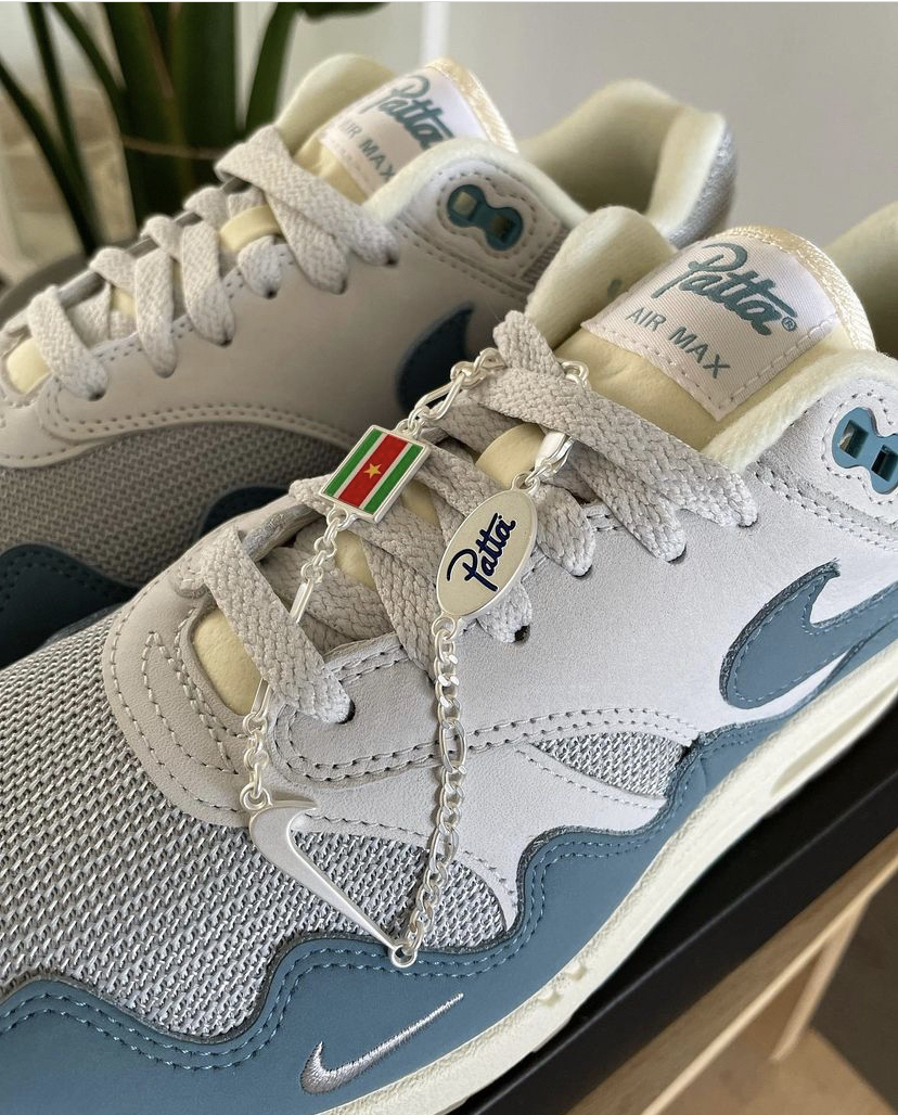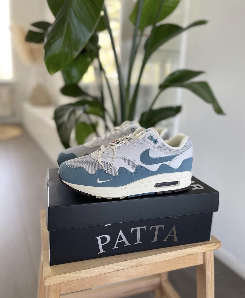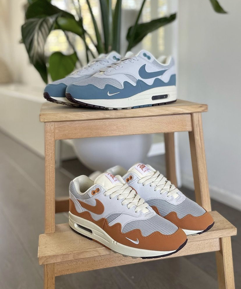 蓝色的 pattaxnike air max 1波浪蓝 棕色的 pattaxnike air max 1棕色 这2双鞋最为标志的就是鞋面的波浪形护边设计 鞋子以air max 1为蓝本打造完成,经典的鞋型加上patta复古潮流的设计,让这双鞋在日常的生活中出场率非常高 后期搭配上卫裤,工装裤之类的都非常合适