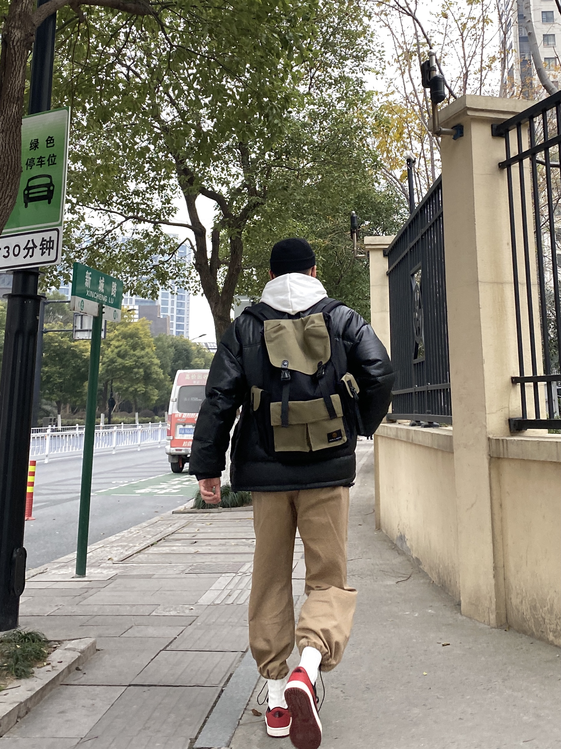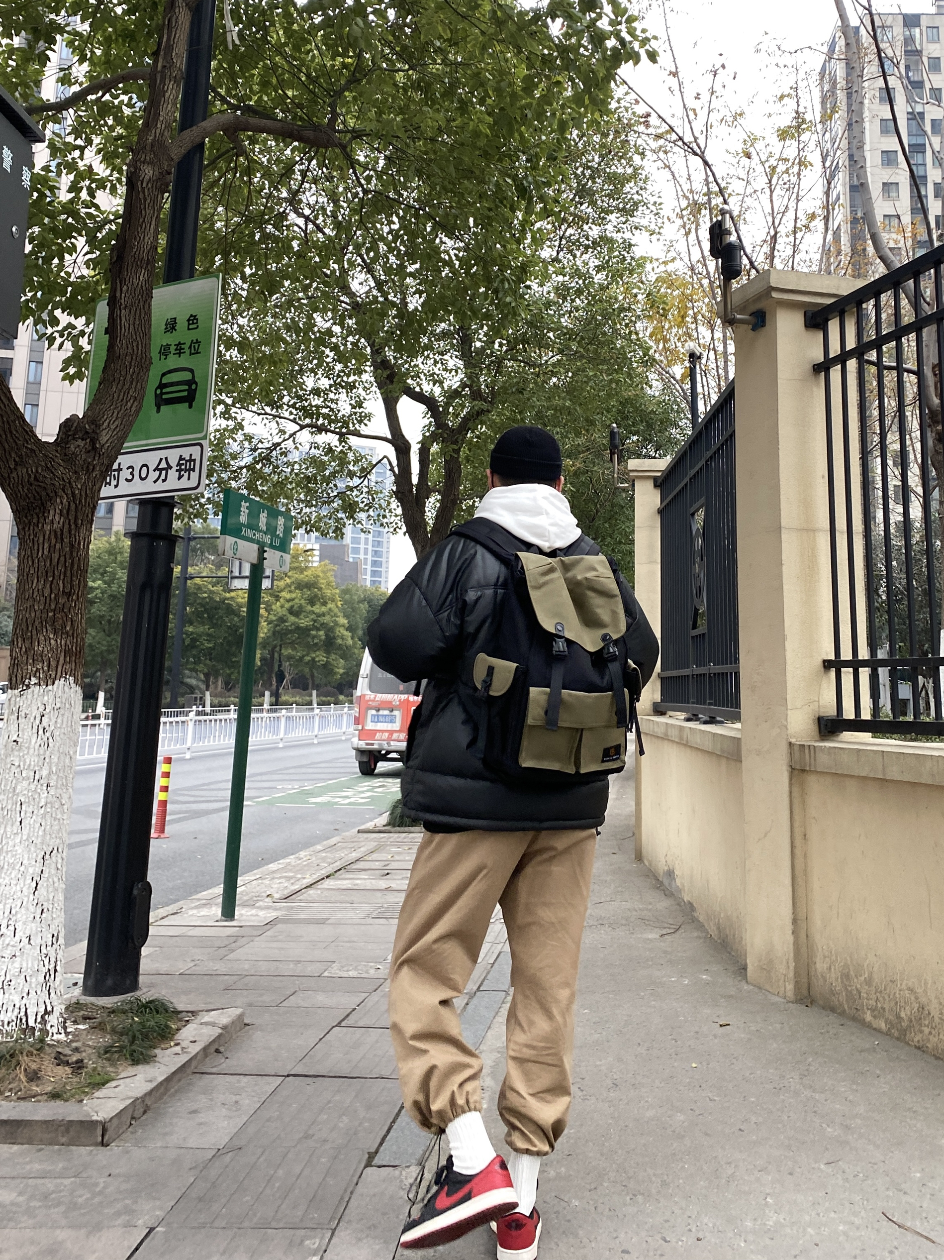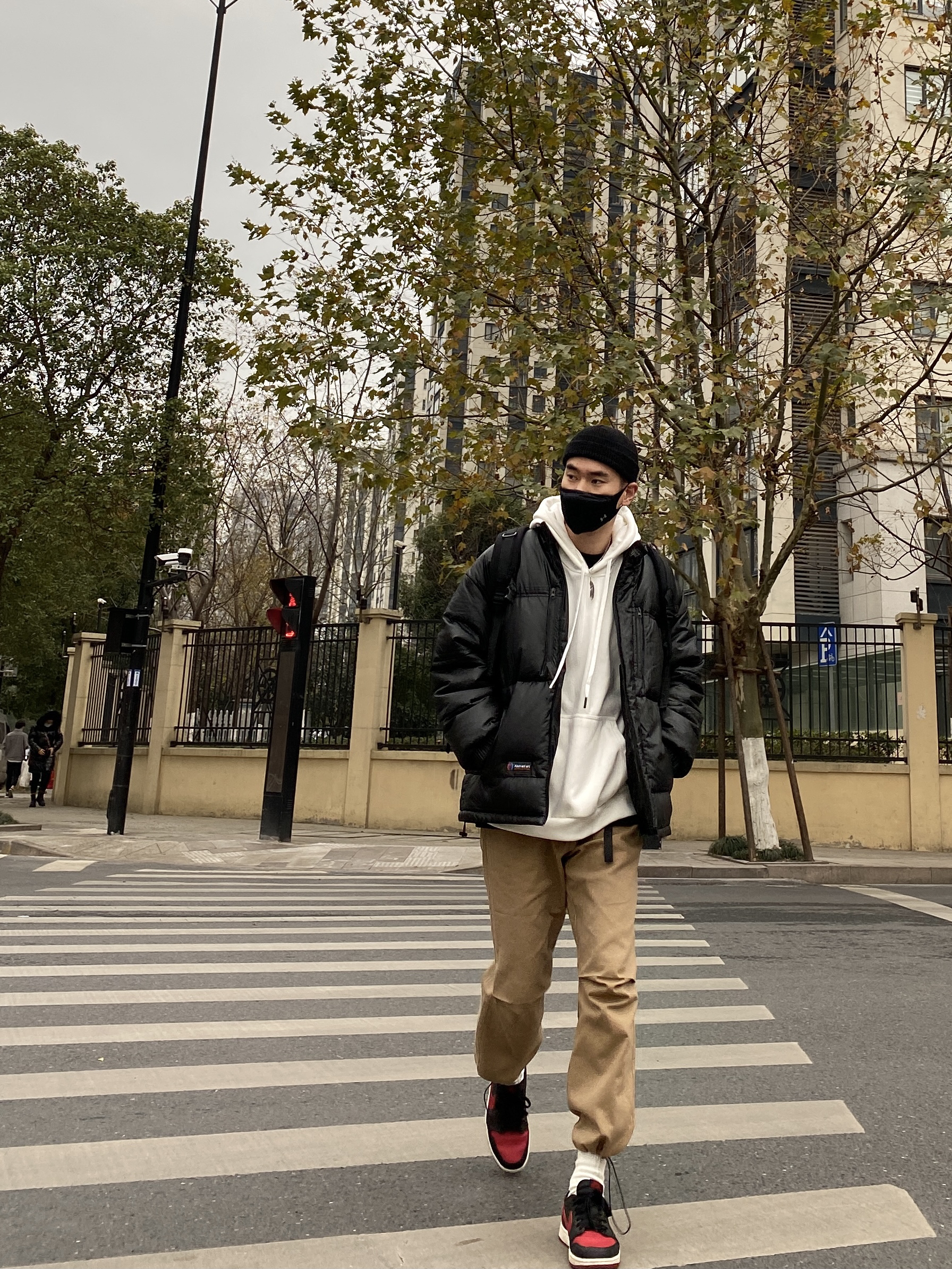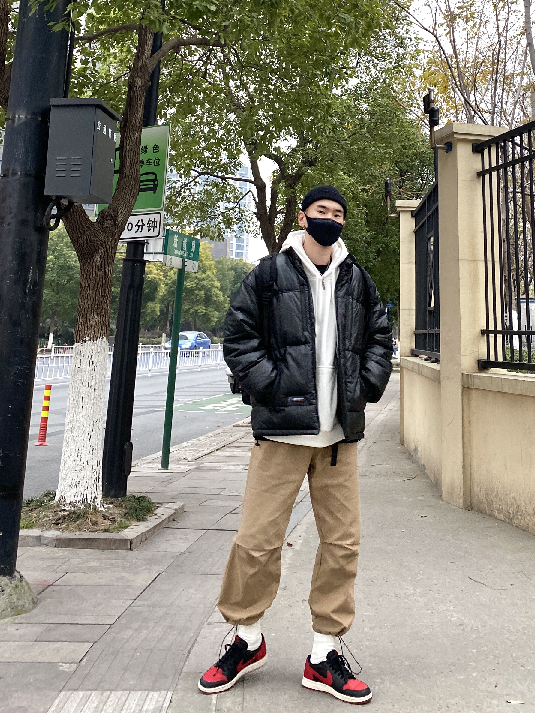 今天这套先用黑色圆领白T做打底,内搭穿一件白色加绒连帽卫衣,裤子选择不挑腿型的卡其色直筒束脚工装裤,鞋子上脚经典黑红配色的aj1,接着套上保暖的宽松阔版防风皮羽绒服,最后戴一顶黑色线帽,OK,出门看看搭配效果吧! - 今日穿搭 衣服裤子都来自:NICE LILI 鞋子:AJ1黑红