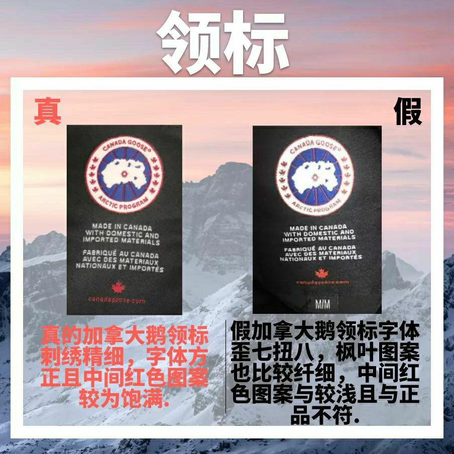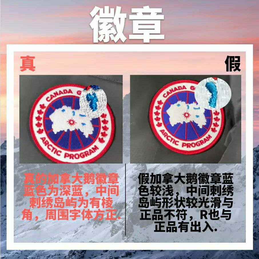 加拿大鹅因其高昂的价格和优秀的品质被誉为“羽绒服界的爱马仕”,同样像其他的优秀产品一样,加拿大鹅也被山寨和模仿,光徽章就有二十多种版本。应观众需求,本期正品君带来一期加拿大鹅的真假鉴别,来帮你避开消费路上的坑! ①徽章 ♥正品:真的加拿大鹅徽章蓝色为深蓝,中间刺绣岛屿为有棱角,周围字体方正。 ♠仿品:假加拿大鹅徽章蓝色较浅,中间刺绣岛屿形状较光滑与正品不符,R也与正品有出入。 ②领标 ♥正品:...