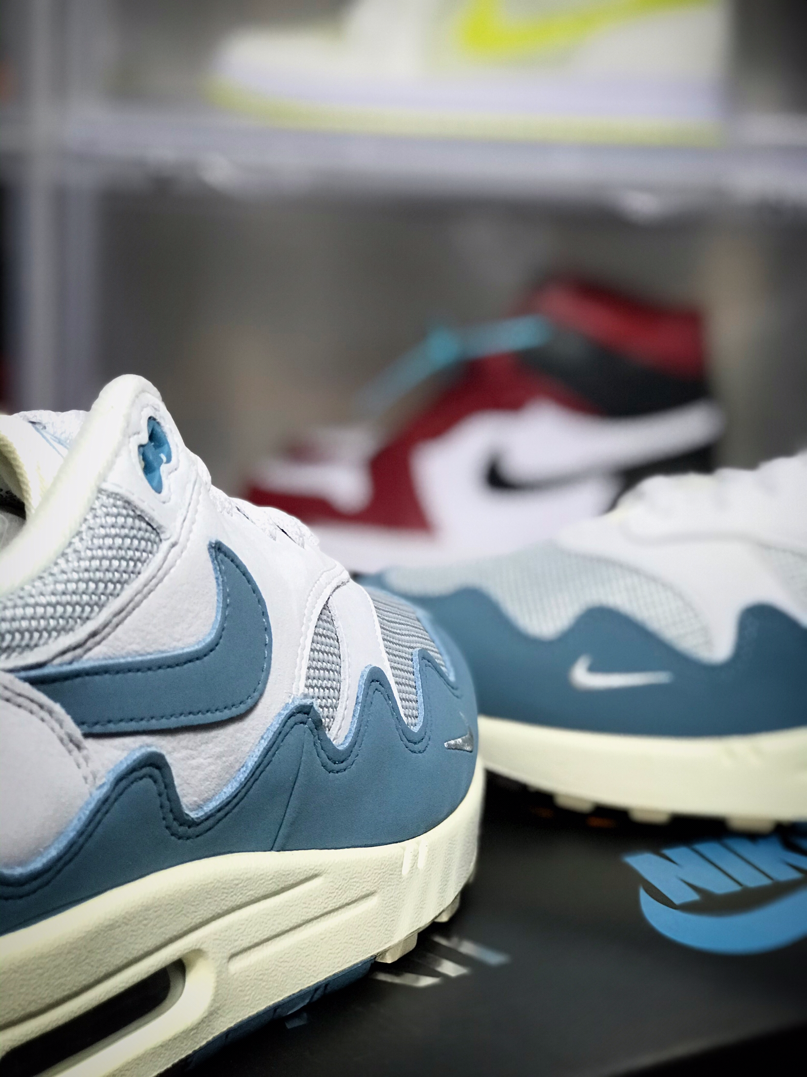 ——整体设计👟 荷兰阿姆斯特丹的球鞋店铺Patta再度携手Nike带来全新的联名款,整双鞋采用米白色呈现,部分水湖绿色,这次的双方联名在元年鞋款的基础上加入了新颖独特的元素,将鞋身的包围改成了蓝色的波浪纹设计,鞋头的银色Swoosh点缀,整体的复古质感非常强烈。 ——入手评析🌀 对比灰粽色的话我个人更喜欢这款灰蓝色,配色更有特色一些! ——码数建议🧦 正常码购买即可。
