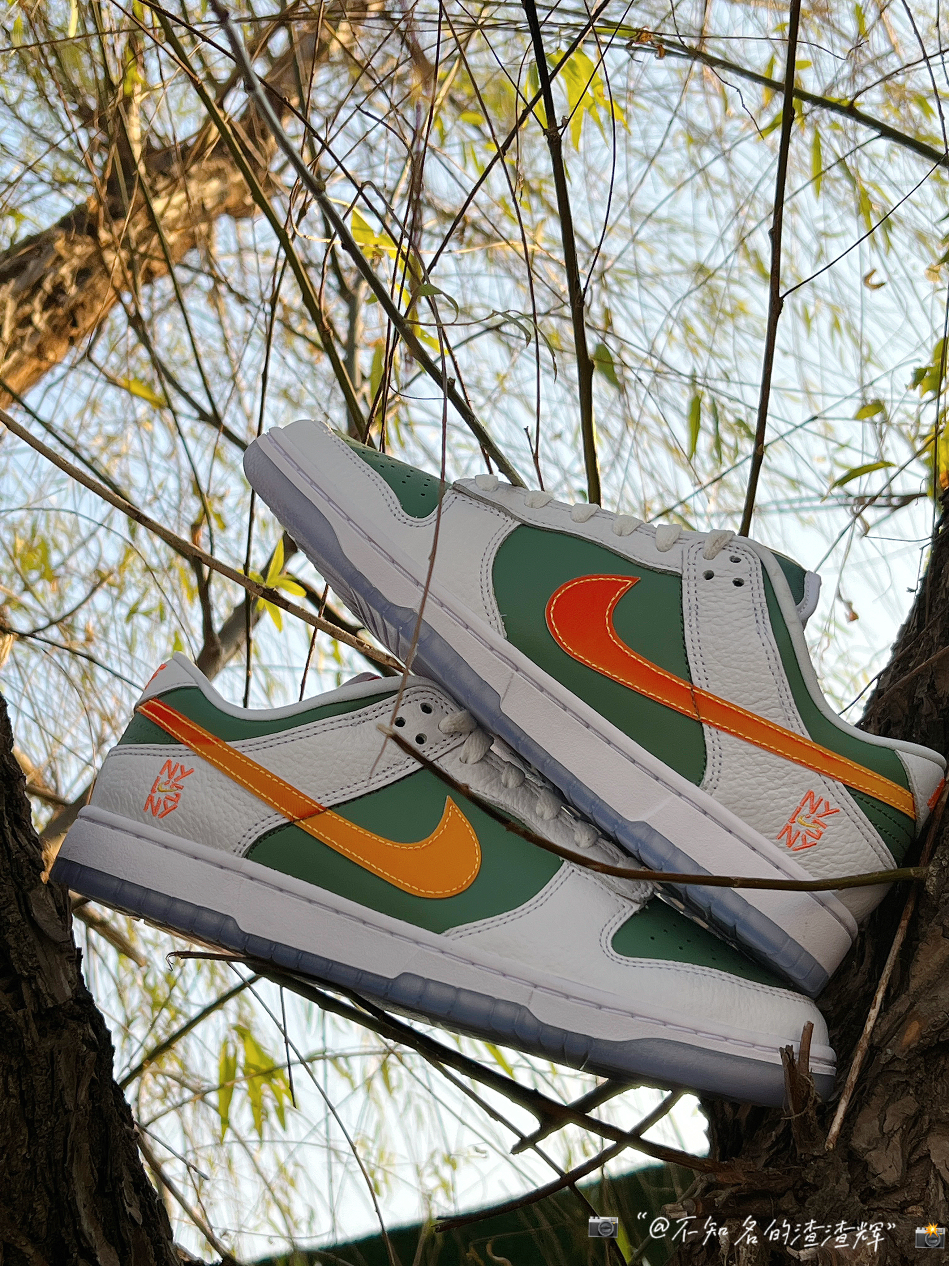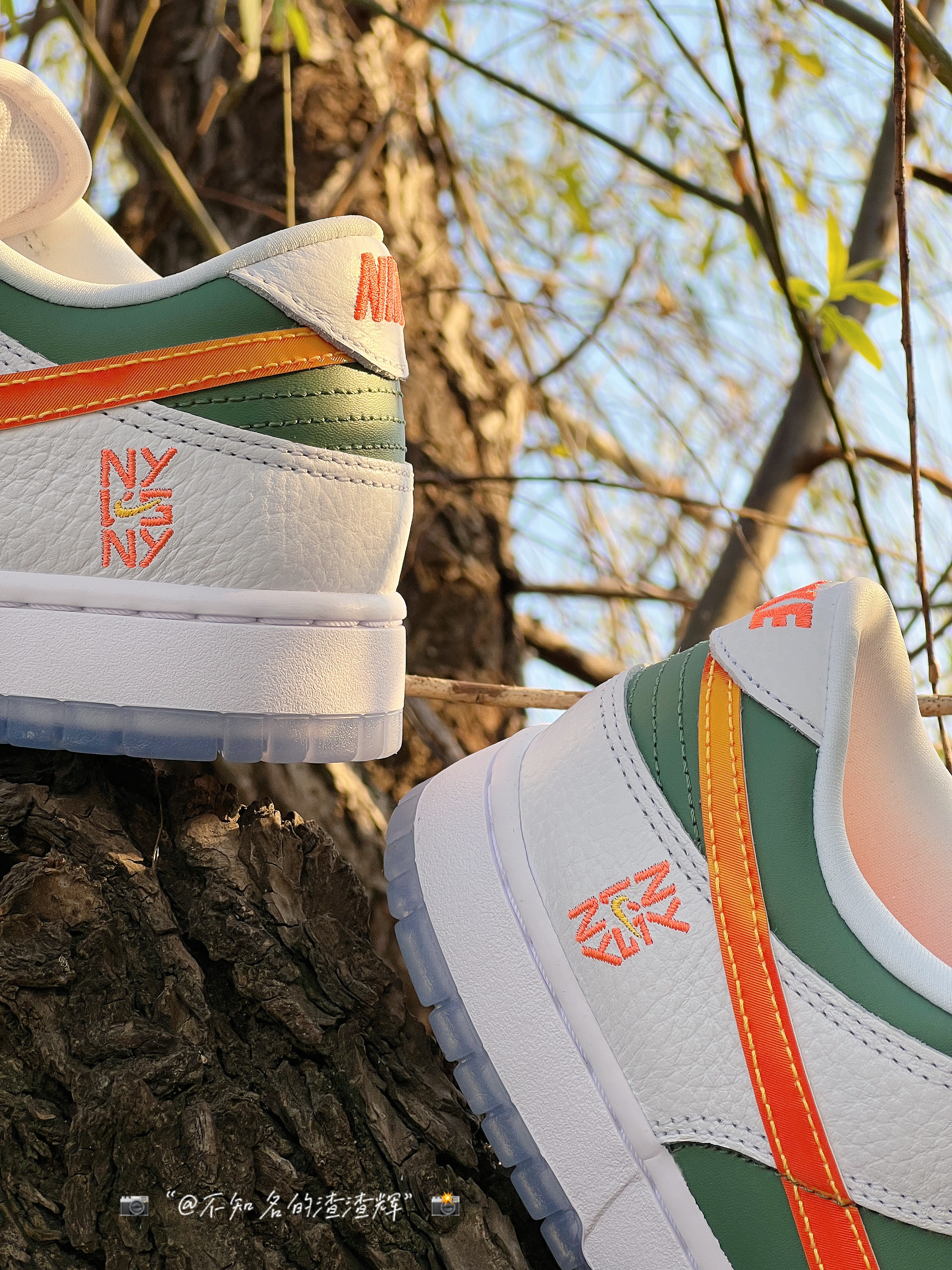 💫:Nike Dunk Low SE“NY vs NY”复古休闲板鞋 白绿橙 纽约街球 💫:这双鞋子鞋头、鞋带穿孔、后跟、中底都是采用白色,鞋面、鞋身、鞋舌都是采用绿色,橙色Swoosh加以点缀,鞋身采用优质皮革材质,质感还算不错,鞋子外侧后跟部位有着“NY vs NY”刺绣,整双鞋子最大的亮点就是外底,外底采用透明水晶材质,内部印有“纽约市中的篮球场名字”,设计风格超棒 💫:个人觉得颜值不...