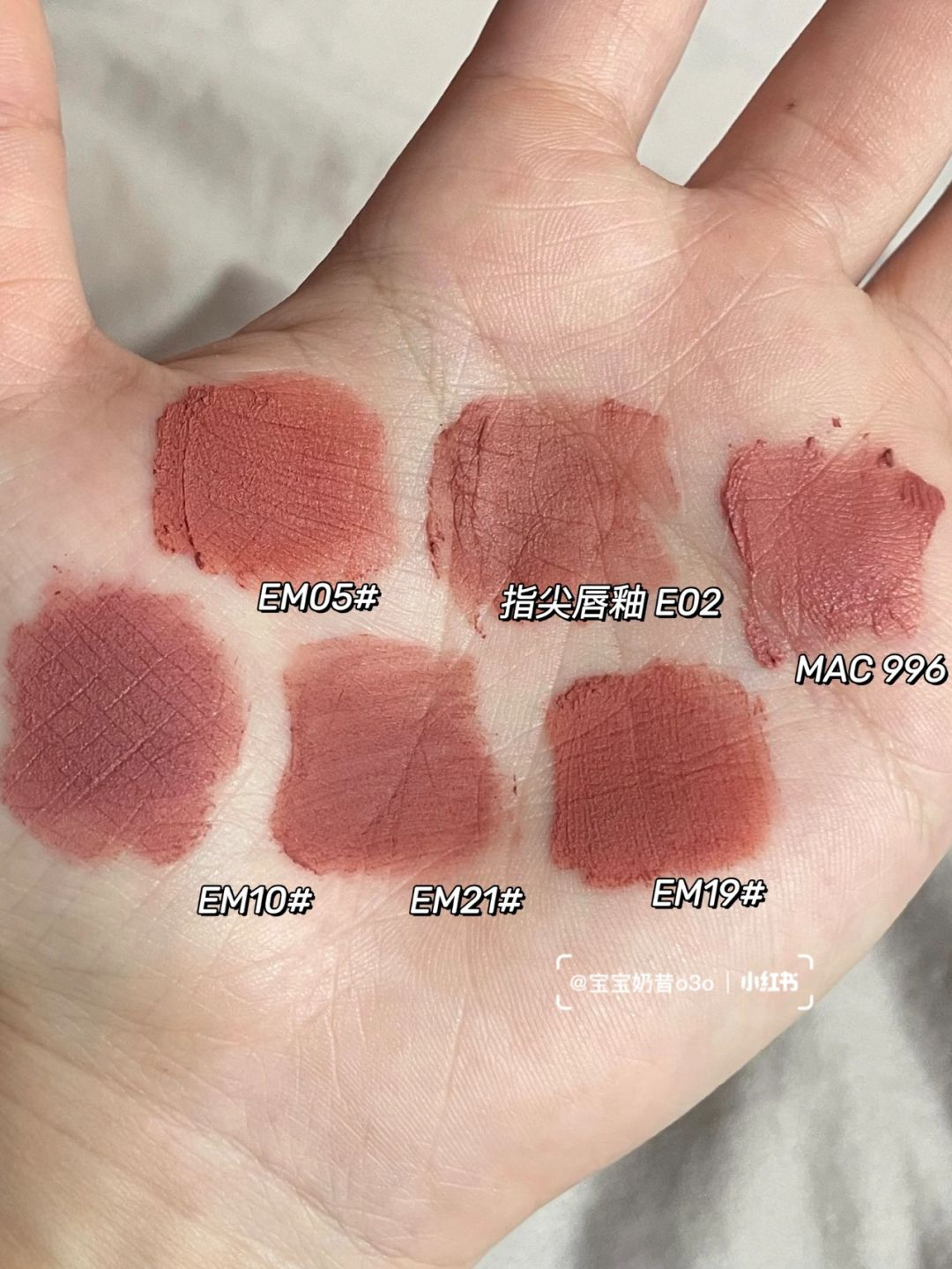 除了EM21# 偏深一点 其他基本都是奶咖/奶杏/裸咖这种 唇泥是into you印度油的 🈚️广 怕你们鬼打墙hhh试色一下 EM05 指尖唇釉E02🆕 MAC 996 Date-Maker EM10 EM21🆕 EM19🆕
