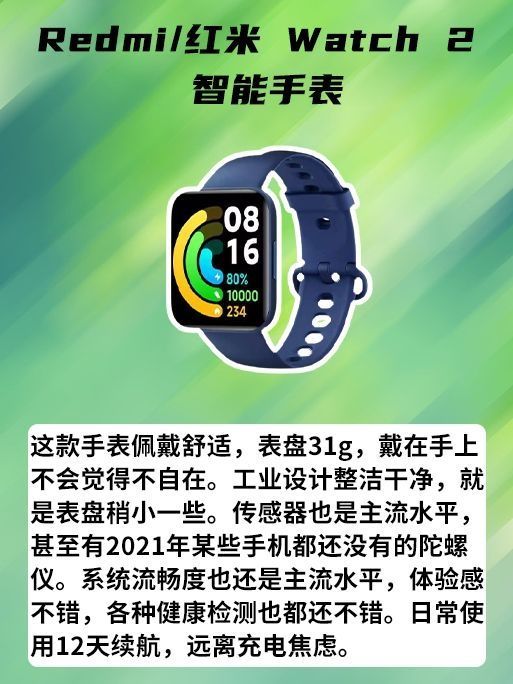 ✅手表是男人的门面之一,现在出了智能手表之后,更是生活的必备品之一。可以让你更好的检测自己的身体变化。不过现在很多智能手表的价格都比较贵,今天给大家推荐两款500元价位的智能手表。 ✅红米 Watch 2 智能手表 ✅特点:这款手表佩戴舒适,表盘31g,戴在手上不会觉得不自在。工业设计整洁干净,就是表盘稍小一些。传感器也是主流水平,甚至有2021年某些手机都还没有的陀螺仪。系统流畅度也还是主流水...