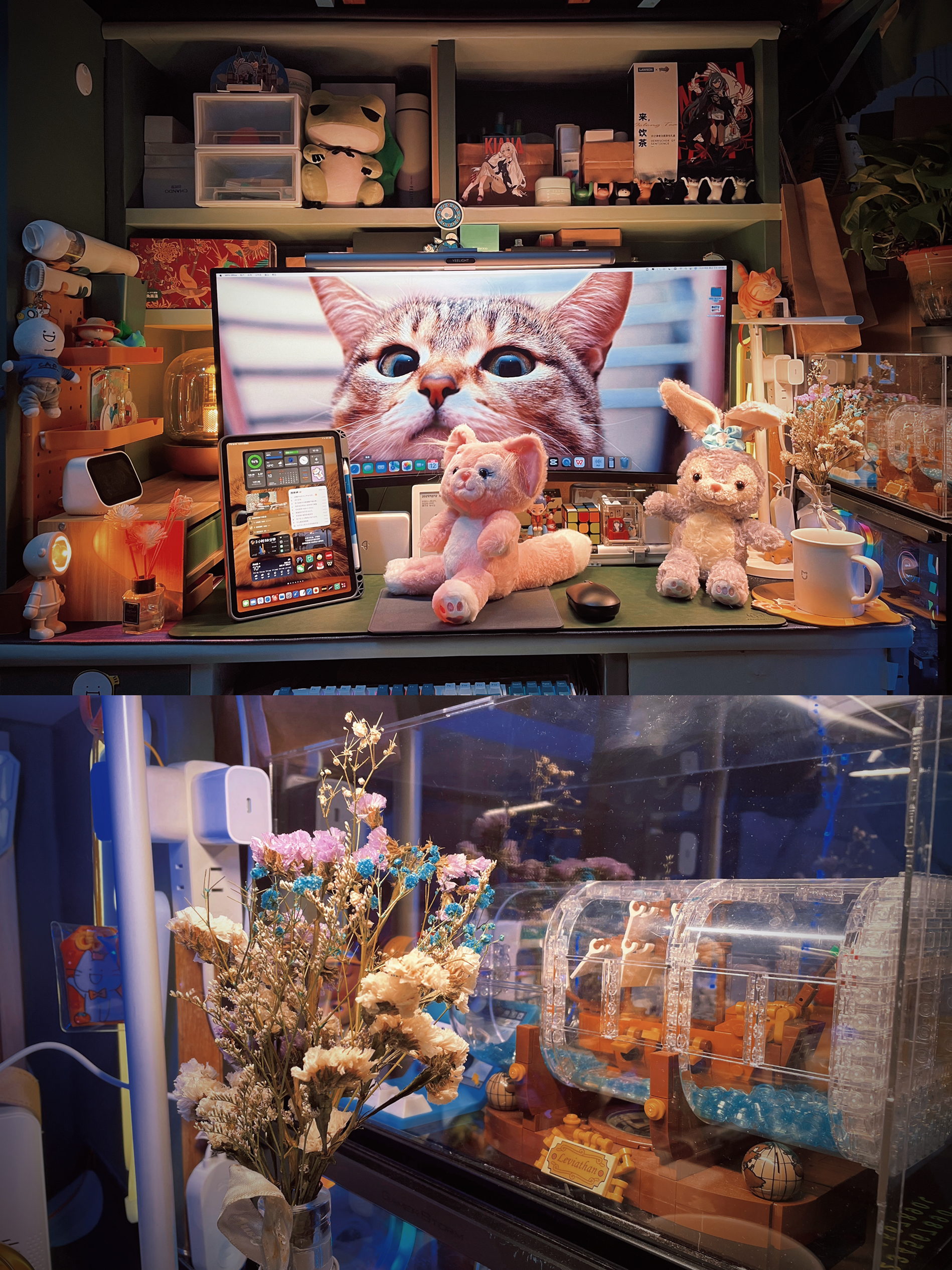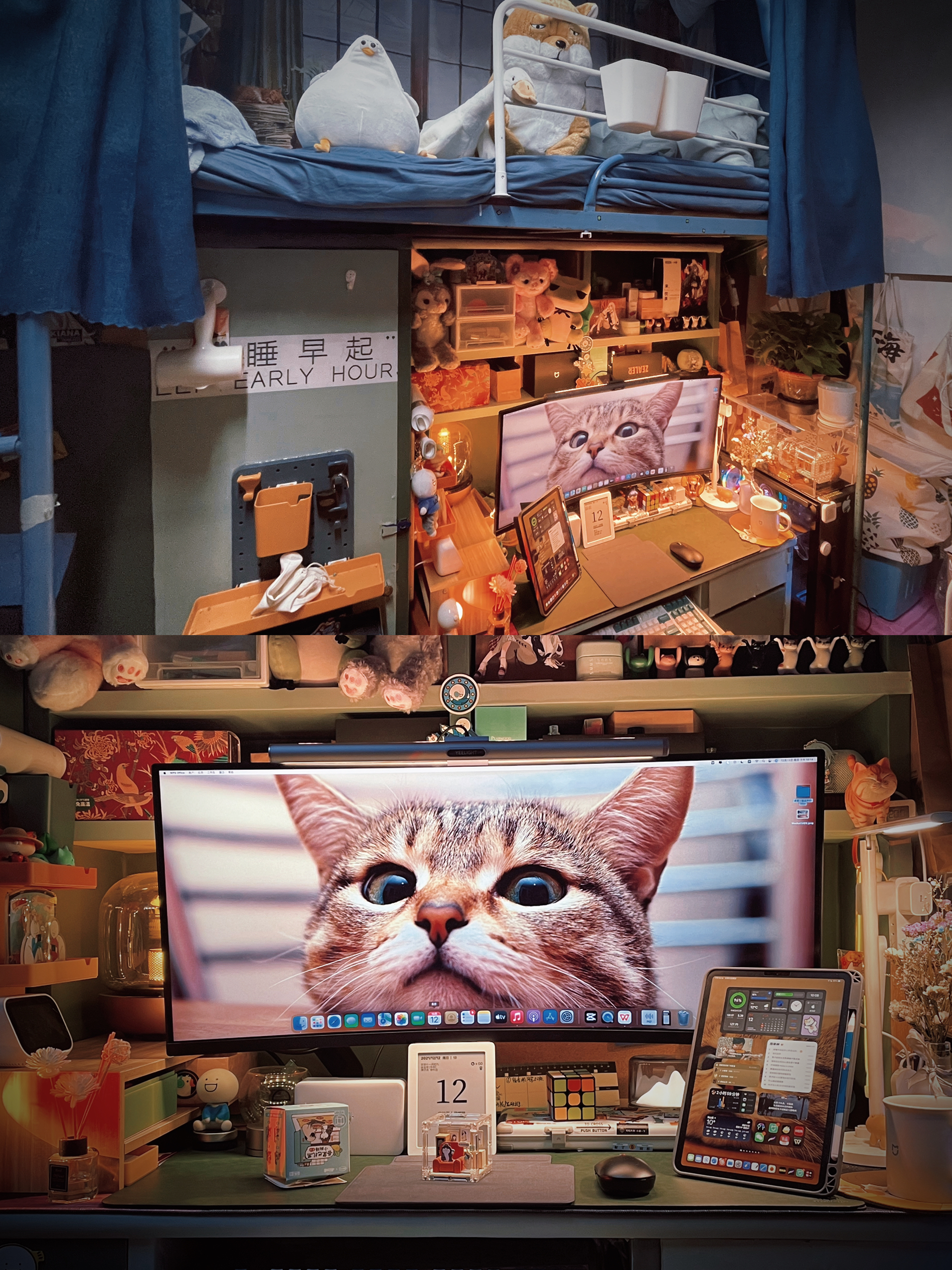 今天粗略统计了一下,截止双十二,我的桌面改造半年花了快1w,研究生收入不高但是消费挺高😅😂 . 🏷️武汉昨天突然降温,冬天应该终于来了在小窝里过冬也是蛮舒服的,今早上班都不想起床了 . 🏷️周末在寝室里花了一幅画,好久没有试过把iPad当画板的感觉了,新入手的iPad壳可以立在桌子上美滋滋~ 🛏️床上部分: . 》朋友送我的娃娃最近堆起一堆我快被挤下床了 》之前买的挂布至今依旧很喜欢 》床头挂个收...