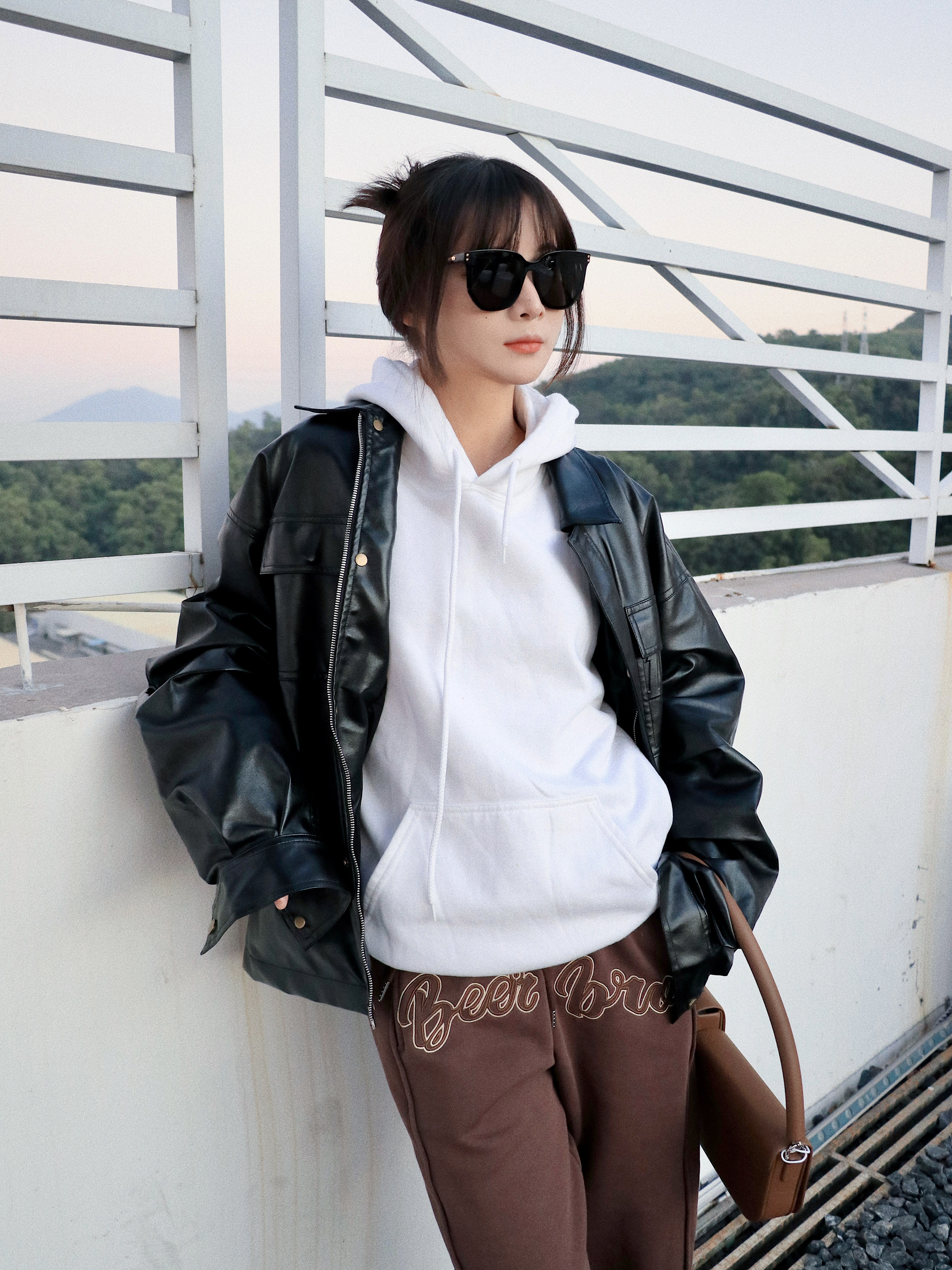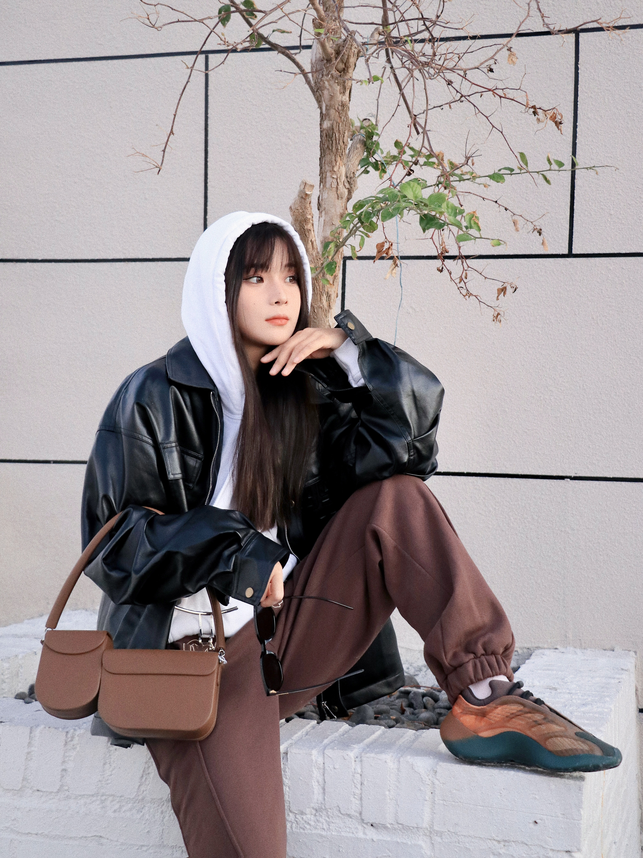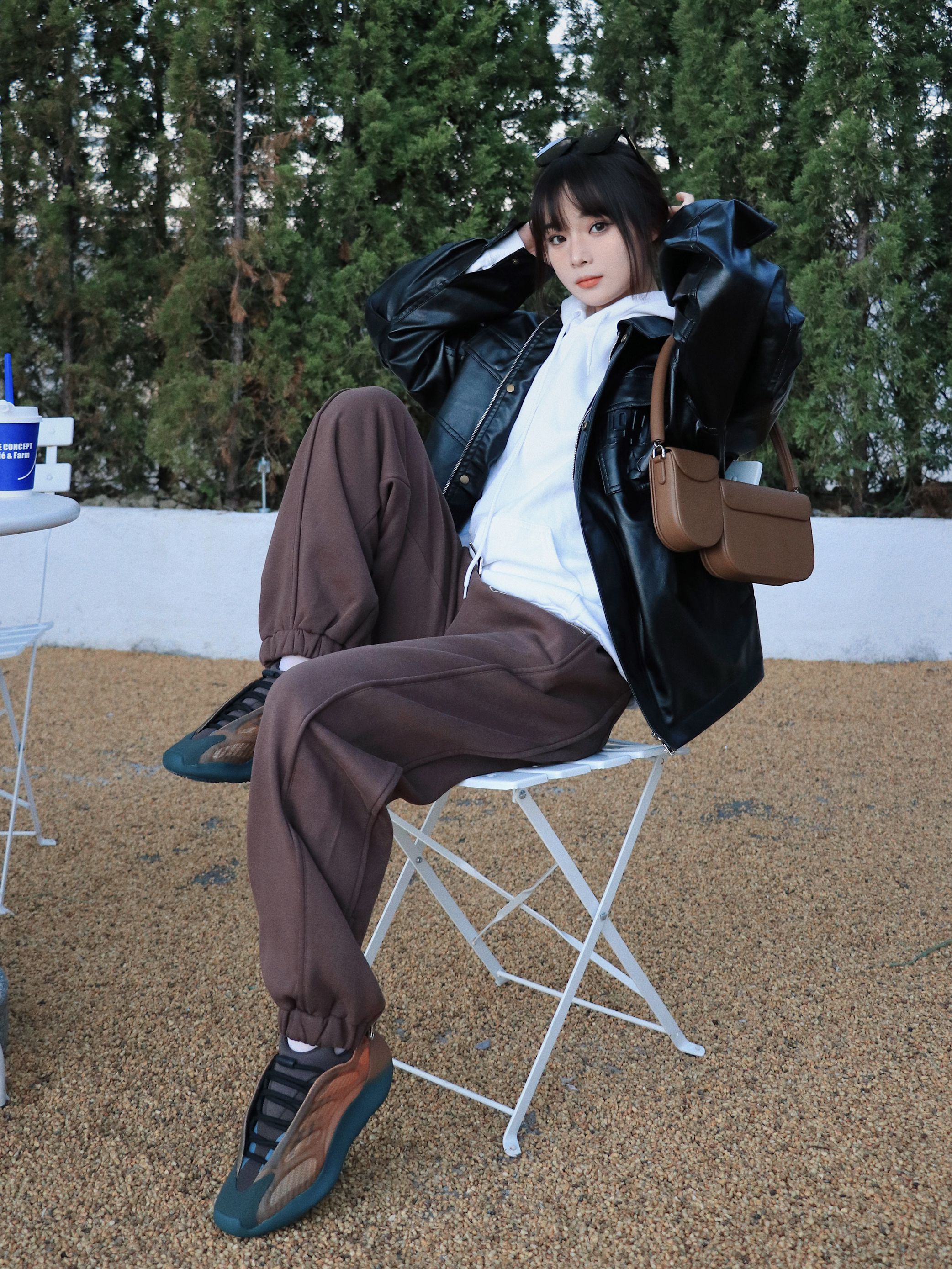 🤍冷了冷了,从深圳来长沙,直接就是冬天了……第一次知道什么叫冷!不能做辣妹了~ 🤍穿搭分享: ▫️黑色皮衣是近期最爱的单品了~怎么搭配都很潮!叠穿简约白色卫衣,黑白撞色超吸睛~ ▫️下面搭配棕色卫裤,既保暖又很有秋冬感~和鞋子颜色正好呼应! ▫️700v3的棕橙配色太好康啦!有种渐变的感觉,很适合秋冬穿✌🏻鞋子包裹感也不错~ ▫️包包也和鞋裤颜色呼应~整体黑白棕,既保暖,也很潮! 🧥:药九玖柒...