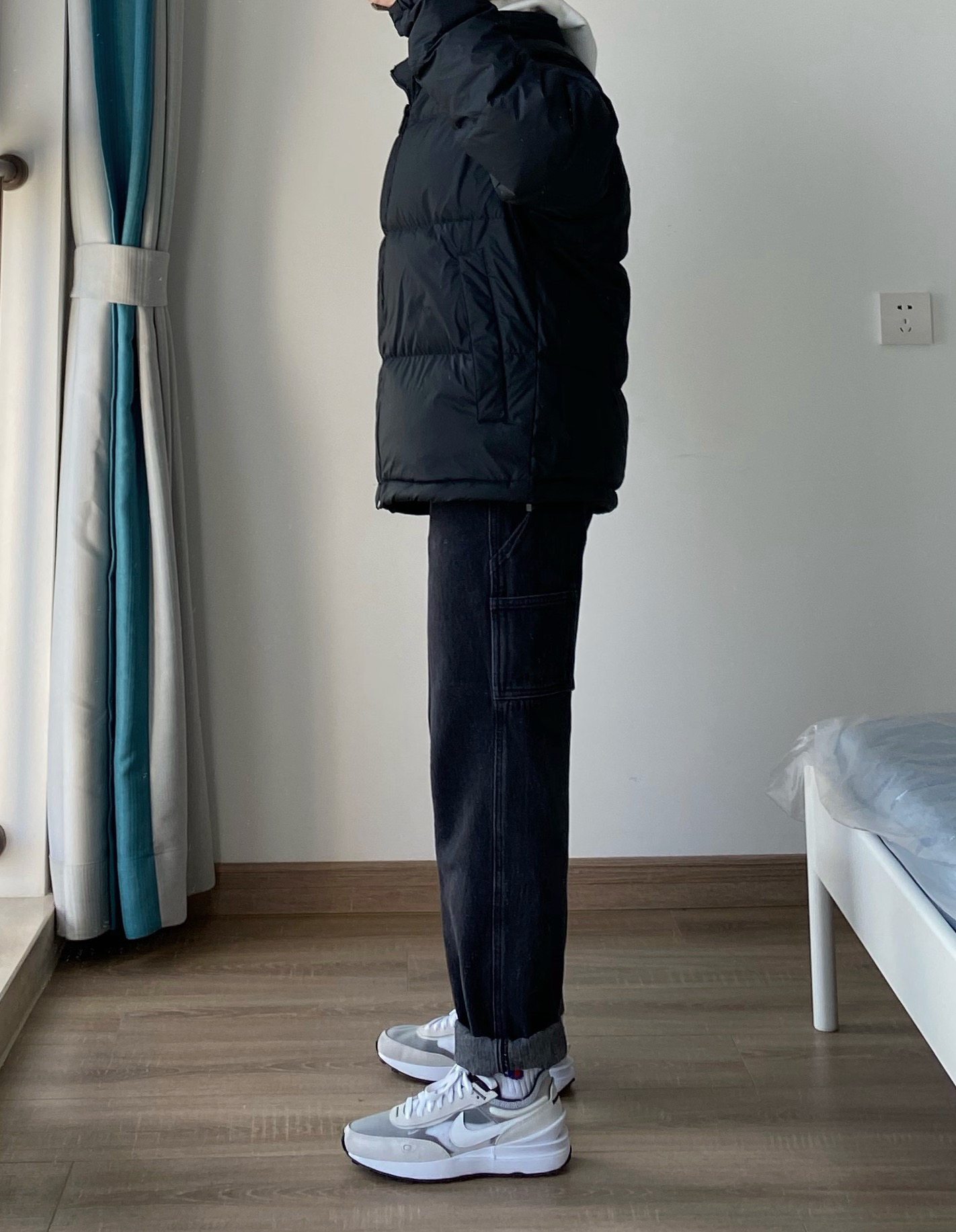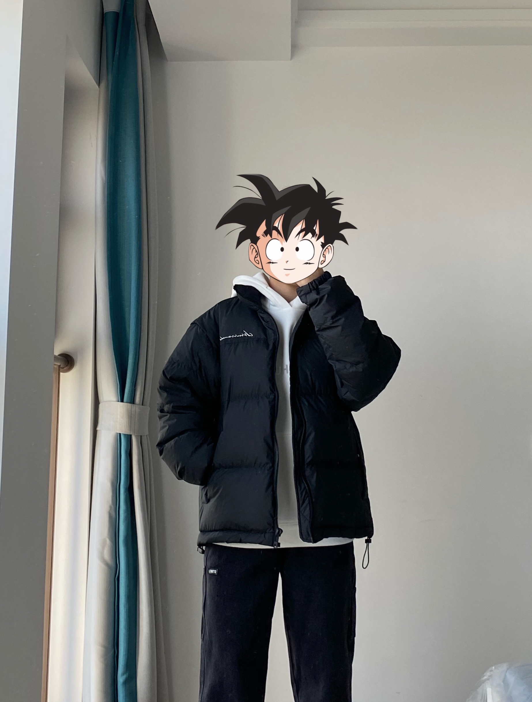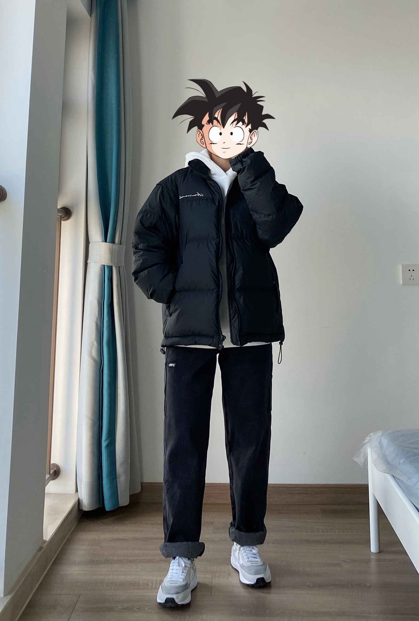 今天来分享一下基础色系 黑色系搭配 👔是CHINISM的纯黑色羽绒服 版型比较好 我160 96斤穿的S码刚好 内里搭一件白色加绒连帽卫衣 冬天出门很暖和~ 👖是白告studio的黑灰色直筒牛仔裤 版型显腿长 比较修饰腿型 适合我这种腿不是很直的人 👟是我经常穿的一款平价百搭鞋子 Nike waffle 白灰色运动鞋 分享给大家