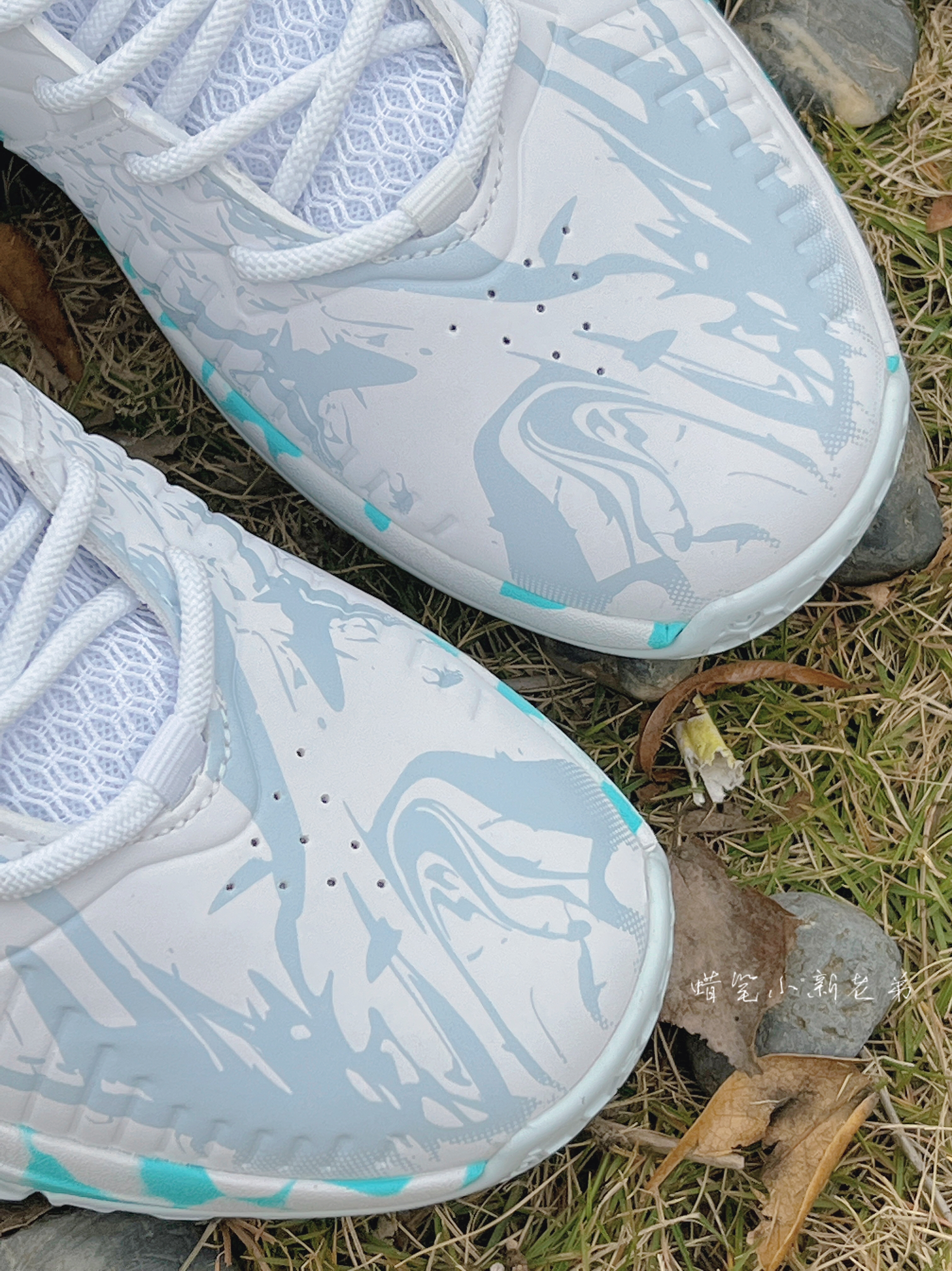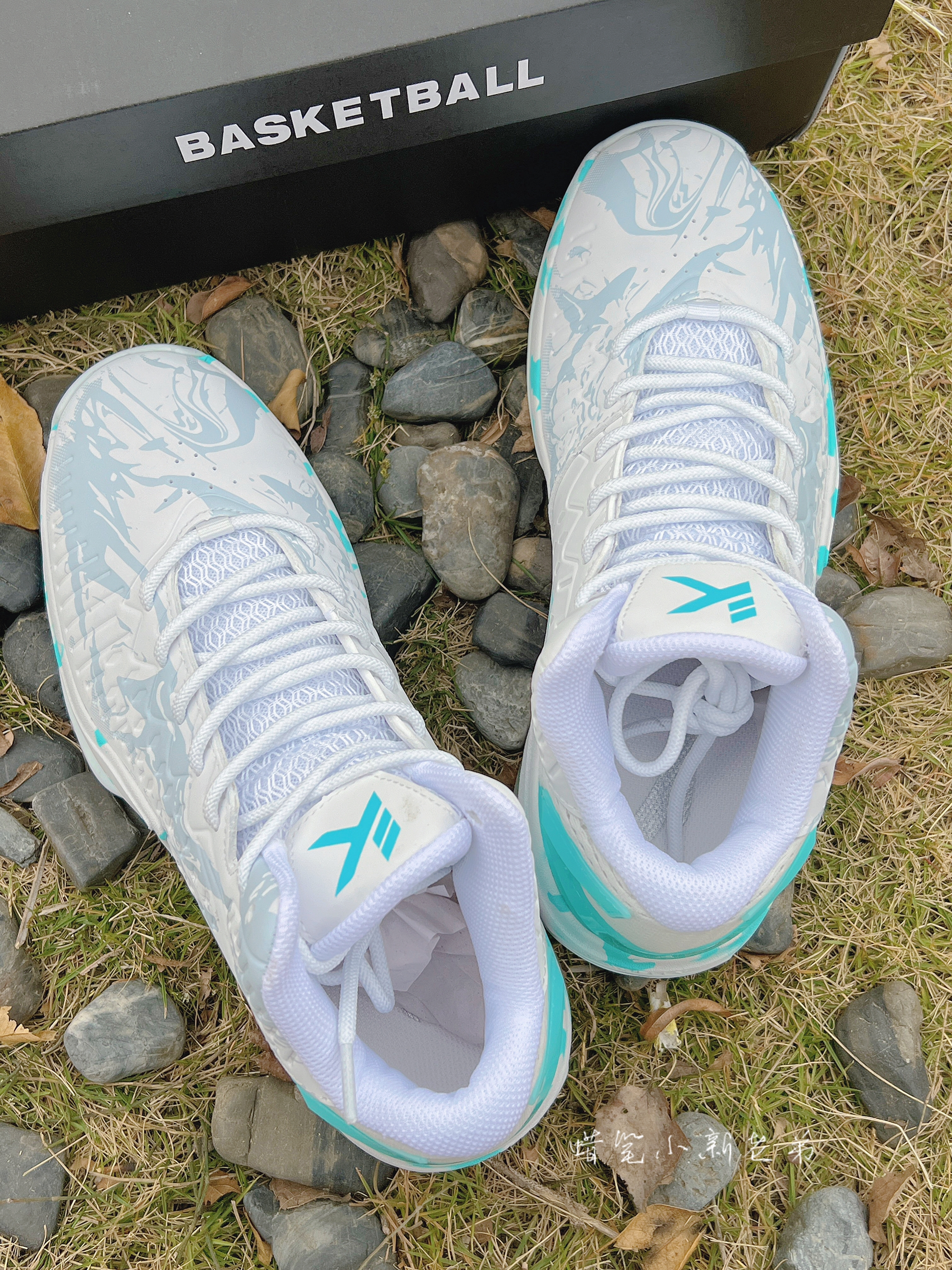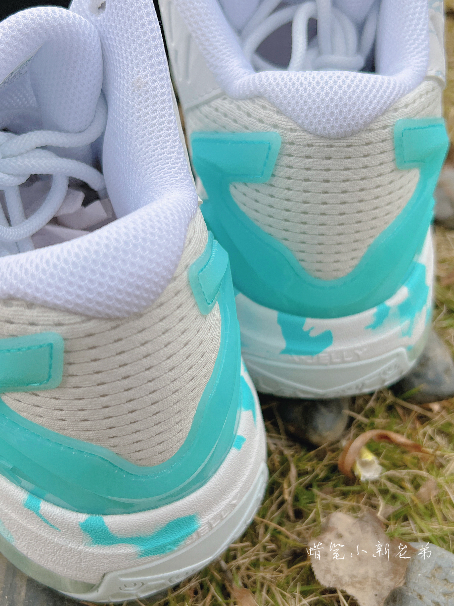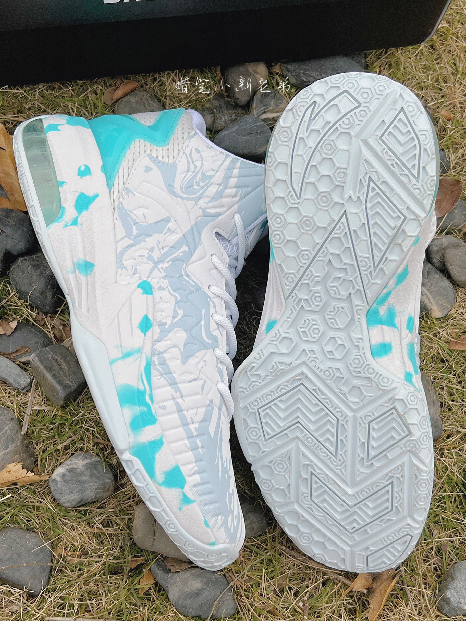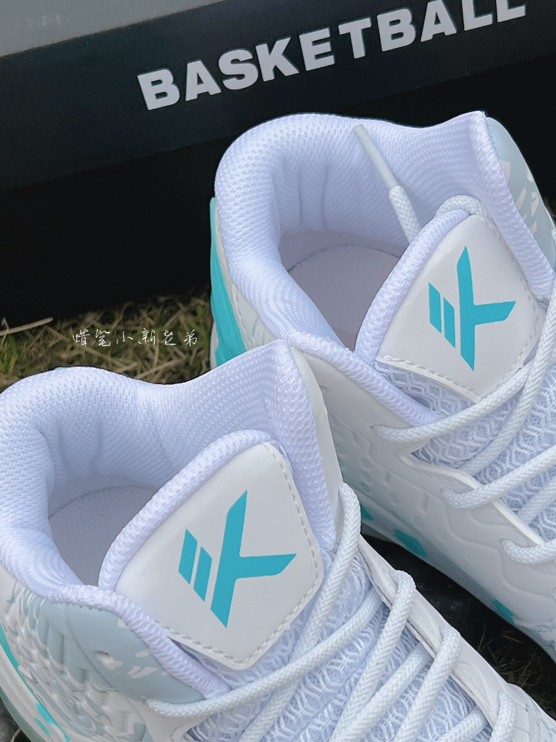实战好鞋开箱 安踏KT3 白蓝 整双鞋子以白色为主,鞋身有着蓝色波浪➕安踏标志,鞋舌有着蓝色“K”字印,采用安踏弹性粘合技术的高回弹EVA缓冲中底,双重缓冲和侧支撑稳定,防侧翻斜面设计,防止侧翻,有效保护脚踝,鞋跟 采用TPU材料,加厚海绵设计,改善了包装,舒适度高,鞋底具有不规则的几何纹理设计,出色的地面抓地力,更防滑加厚鞋舌印有K标志