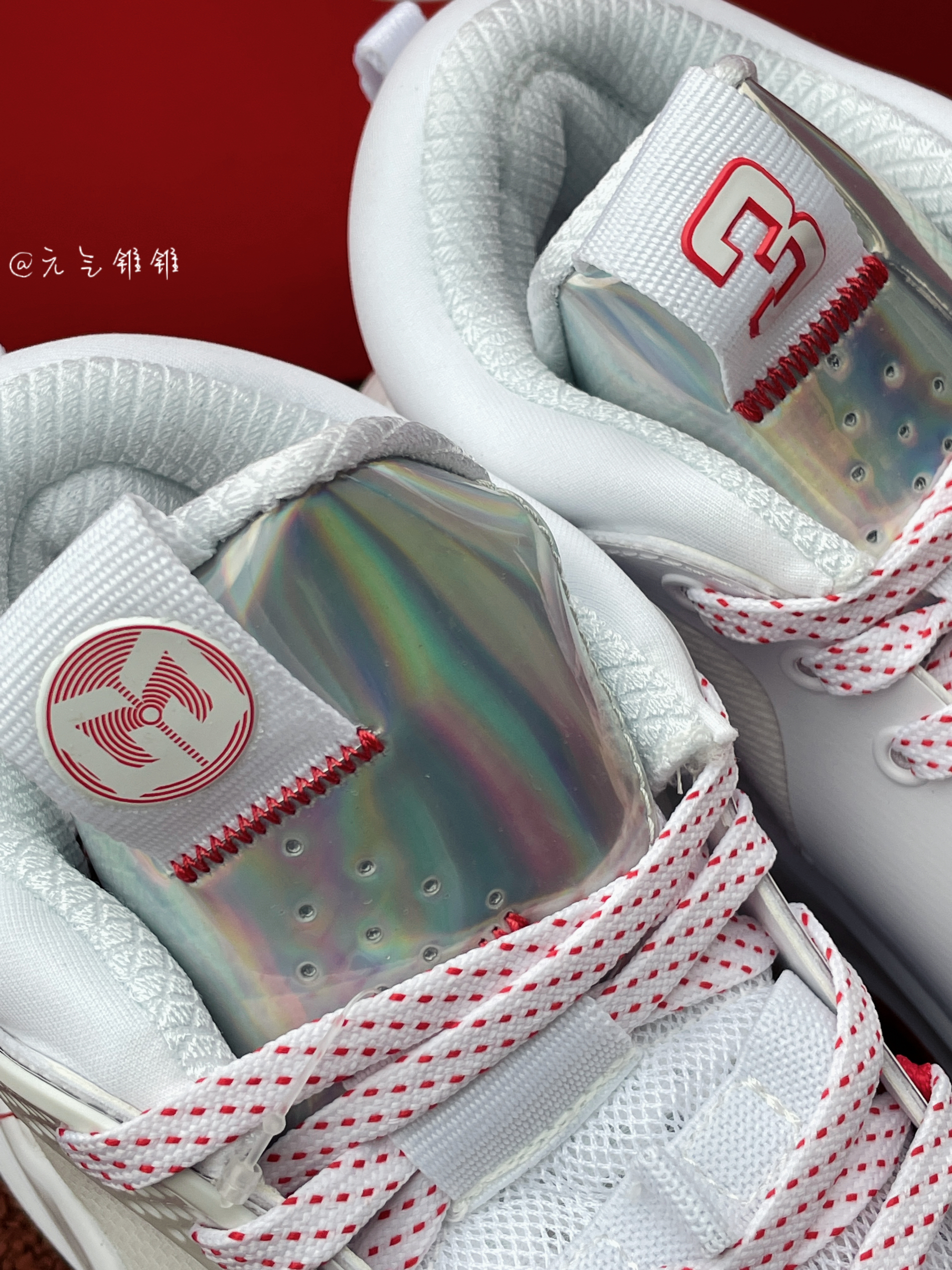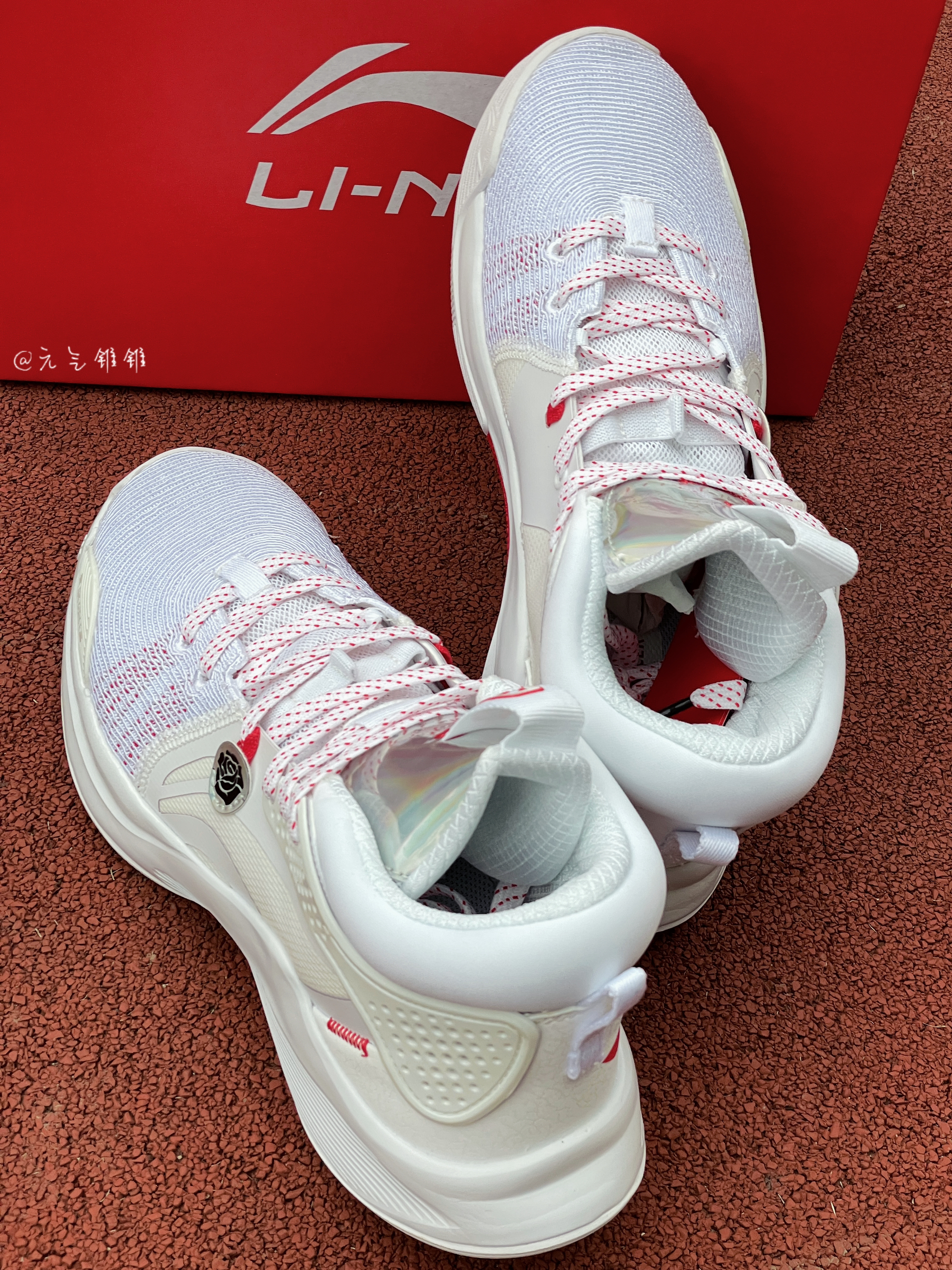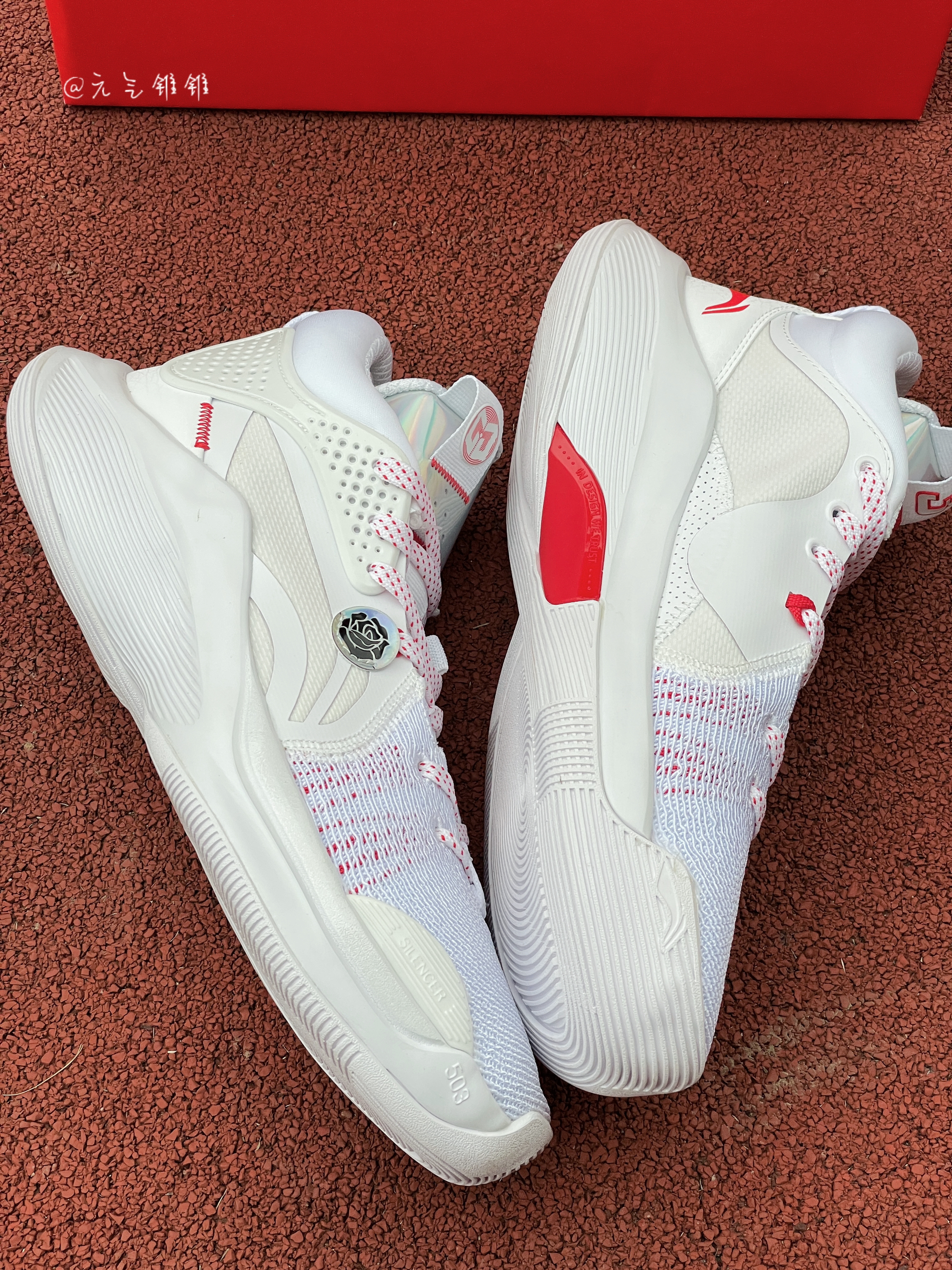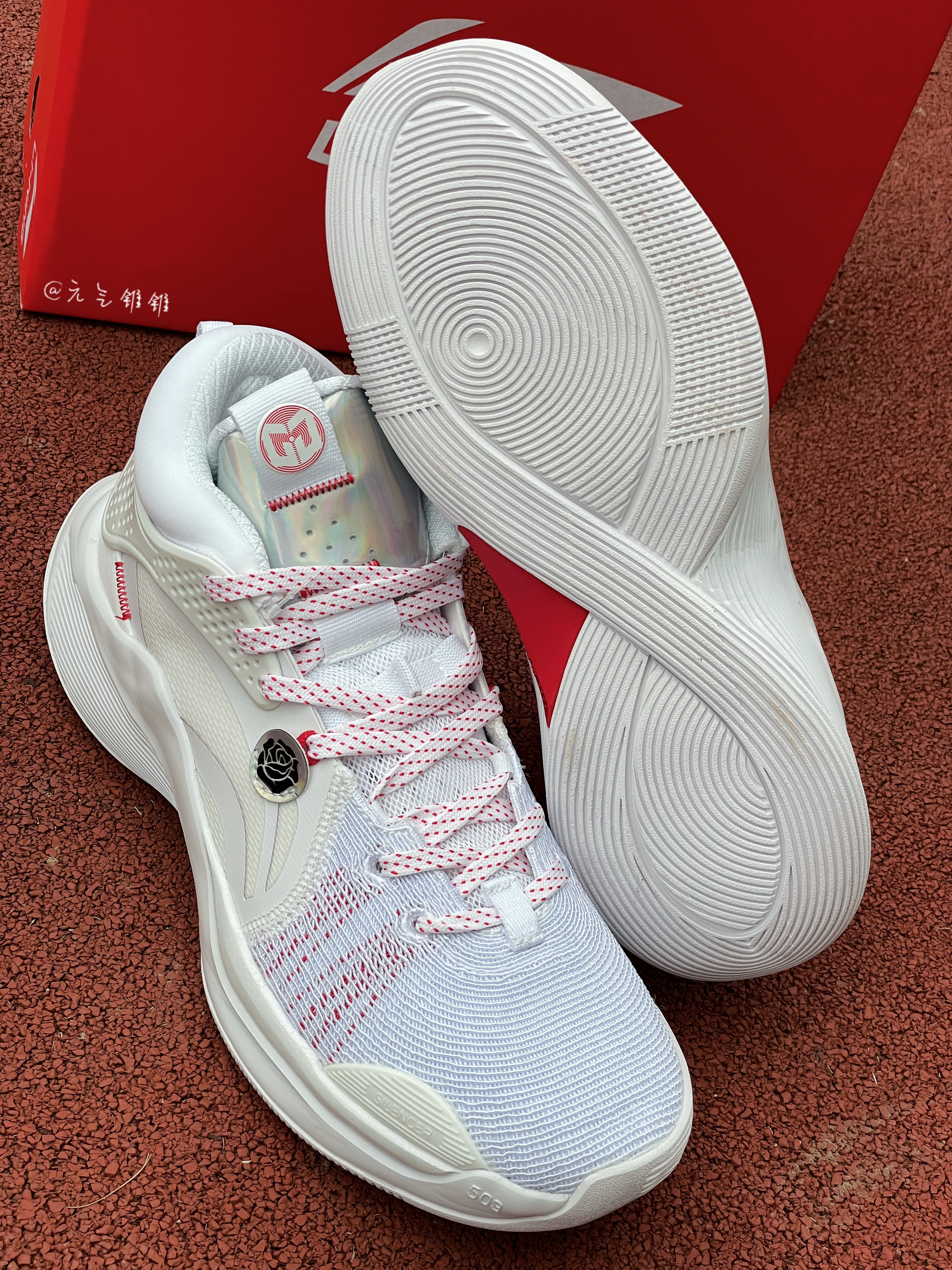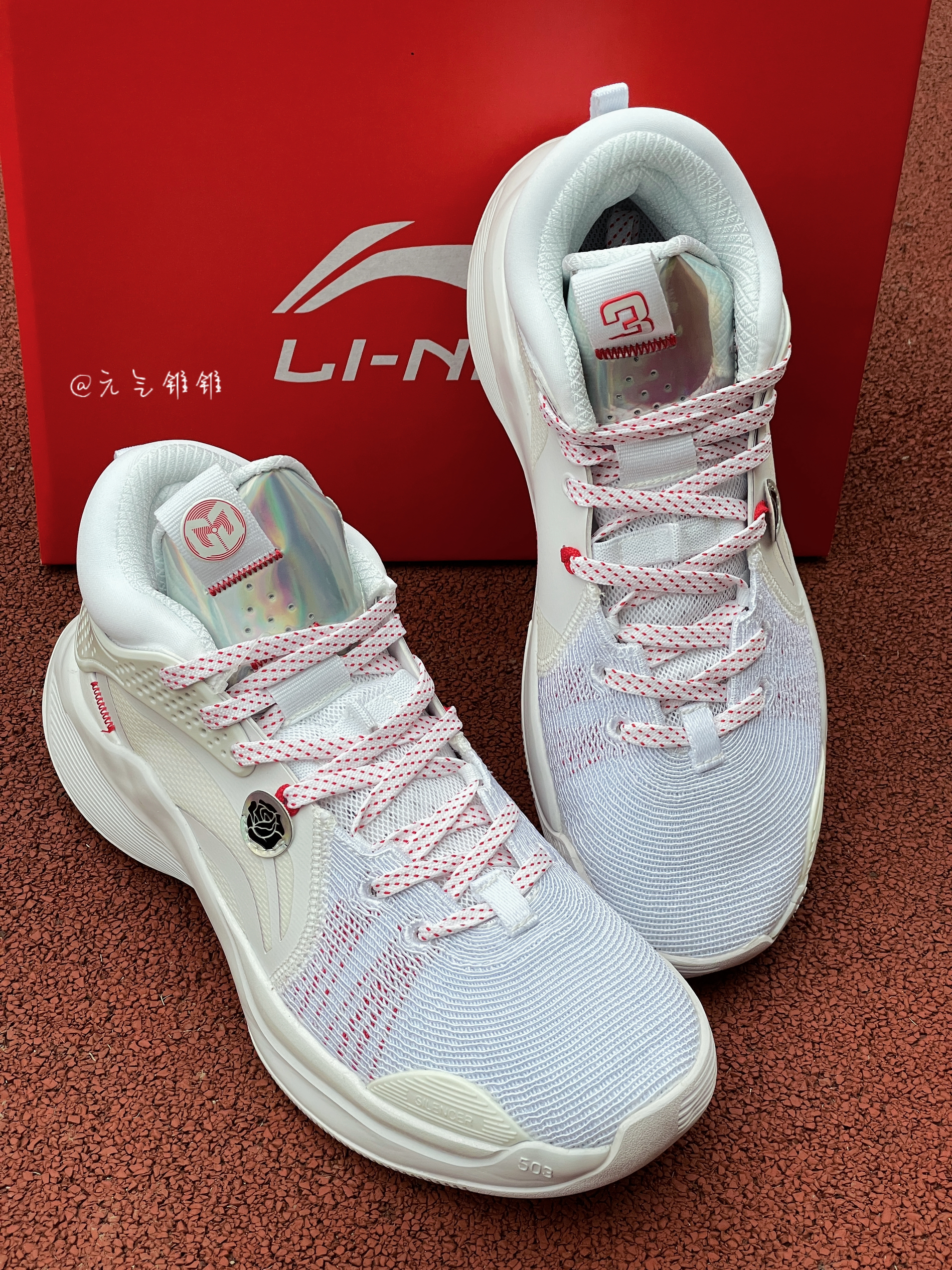 LiNing李宁 Silencer CJ 迈克勒姆团队款 专业比赛篮球鞋 白色 鞋面采用编织面料和皮革拼接搭配,采用白色为主的鞋身,红色点缀,配色清新也好搭配,李宁标志纹路设计,还有个别致玫瑰花logo搭配,中底LIGHT FOAM缓震,缓震效果是不错的,回弹耐磨 鞋底TPU稳固,加厚脚踝设计,包裹性很ok,正常尺码就可以了,平常搭配运动服、休闲风都是可以的