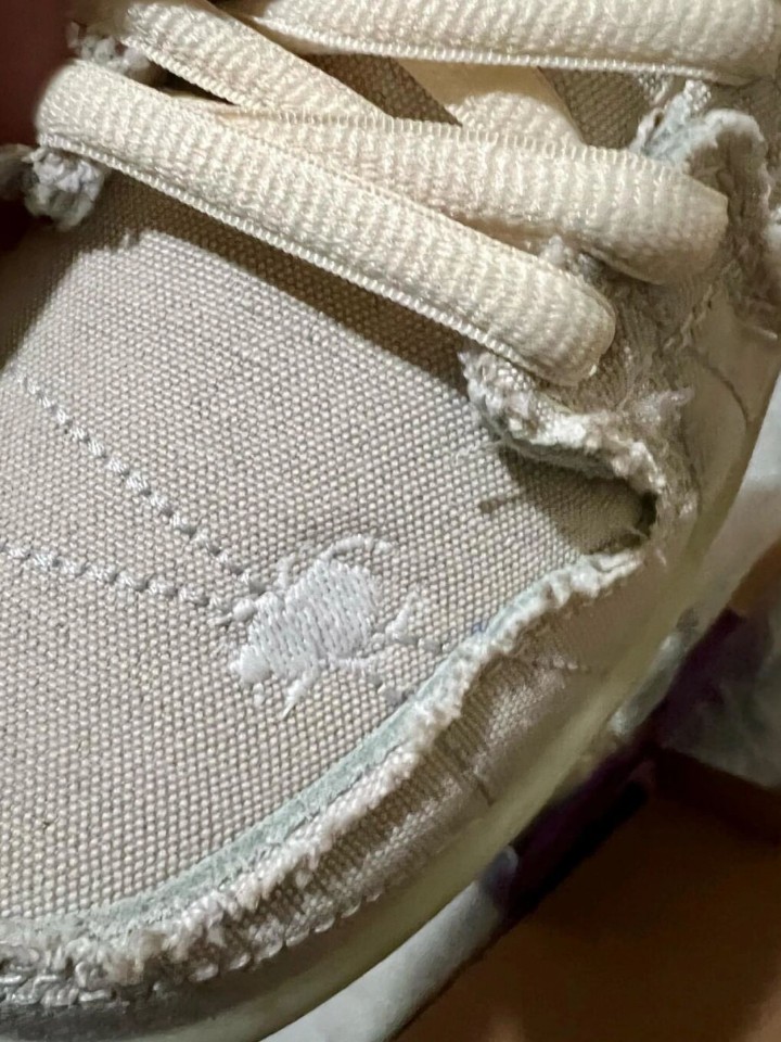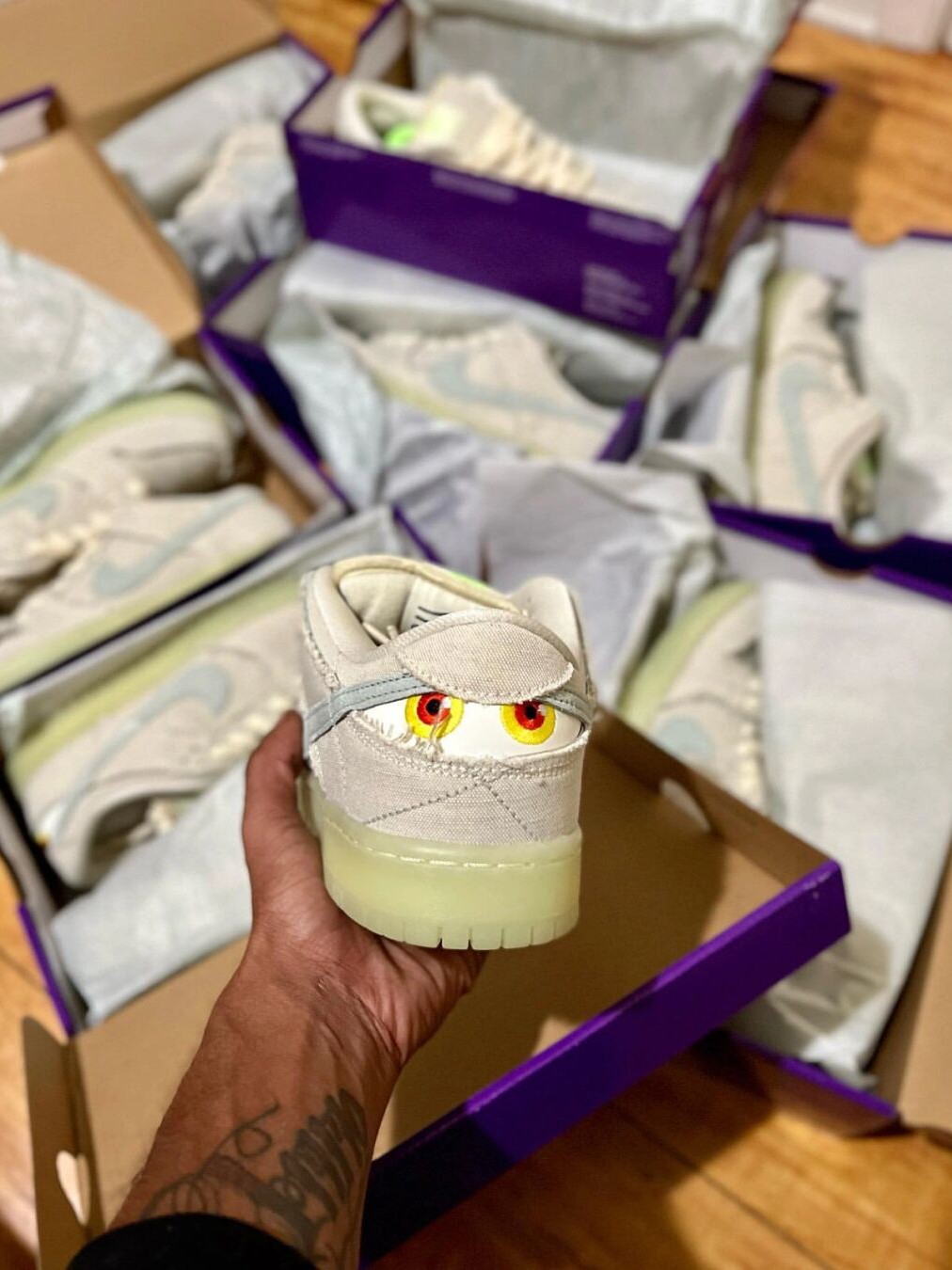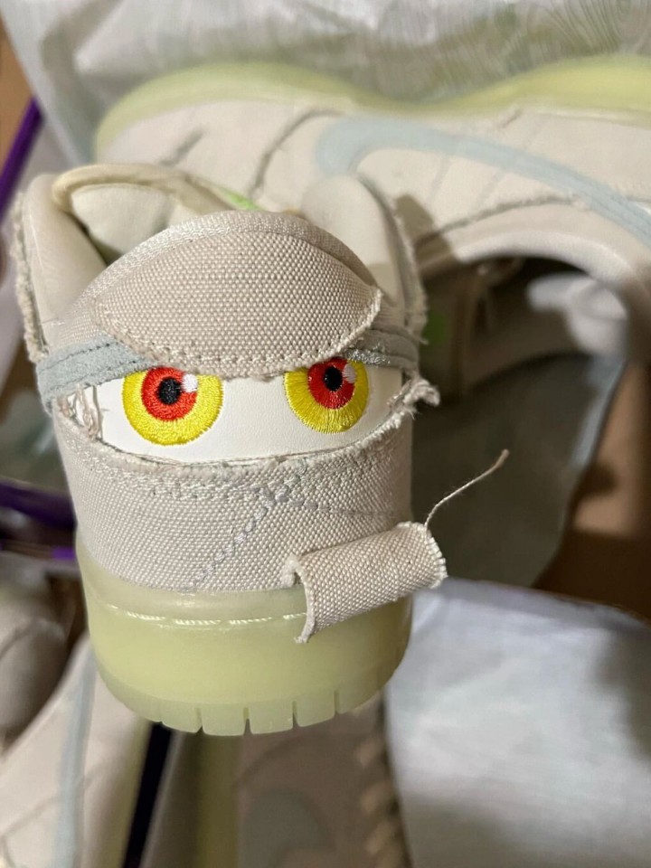 Nike SB Dunk Low "Mummy" 米白 鞋身以浅灰色调呈现,麻布材质展现木乃伊的缠布的造型风格👏鞋面点缀圣甲虫刺绣,鞋舌内侧荷鲁斯之眼,彰显埃及主题~后跟处露出木乃伊双眼,黄红配色的眼睛十分符合万圣节装扮🎃鞋面麻布为可撕的设计,撕开后的质感更加狂野,内部则是翻毛皮材质~ 夜光效果非常炫酷,你们心动了吗❓ 👟鞋款名称:Nike SB Dunk Low "Mummy" 米白 撕...