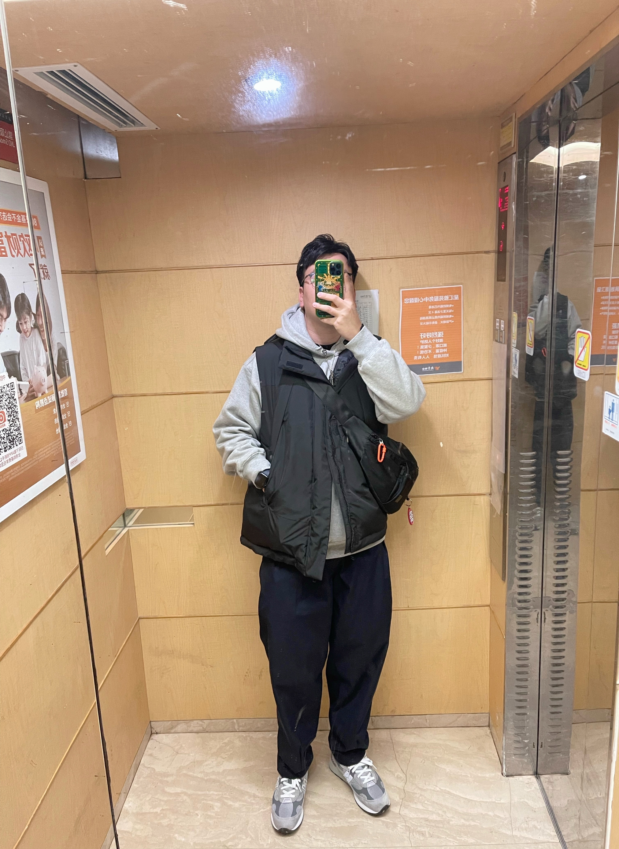 身高180 体重190 灰蓝配色总不会错,大家可以多用灰色藏青或者藏青红色 👔 灰色连帽卫衣,黑色羽绒马甲 👖 蓝色机能工装裤 👟 NB992元祖灰