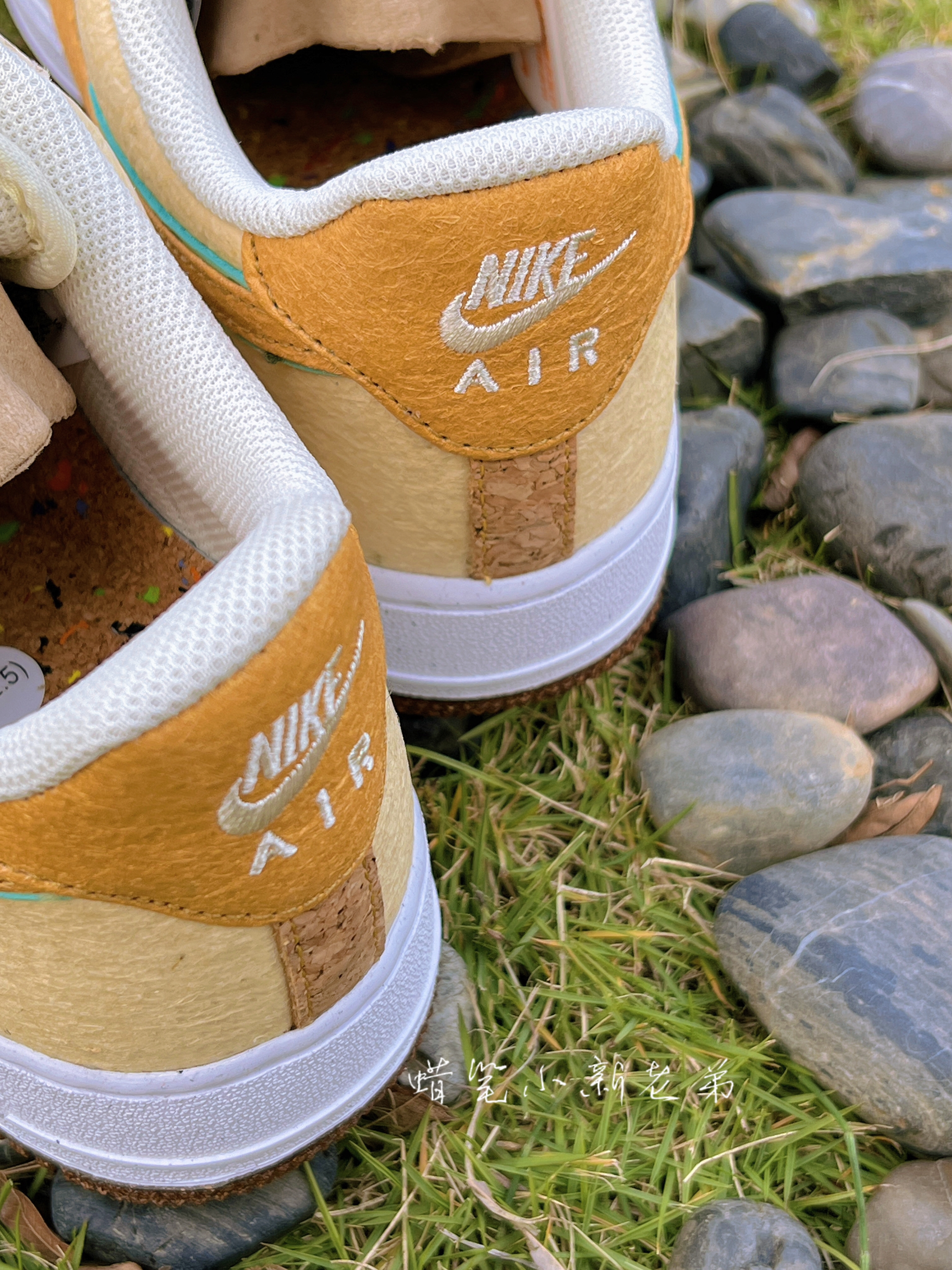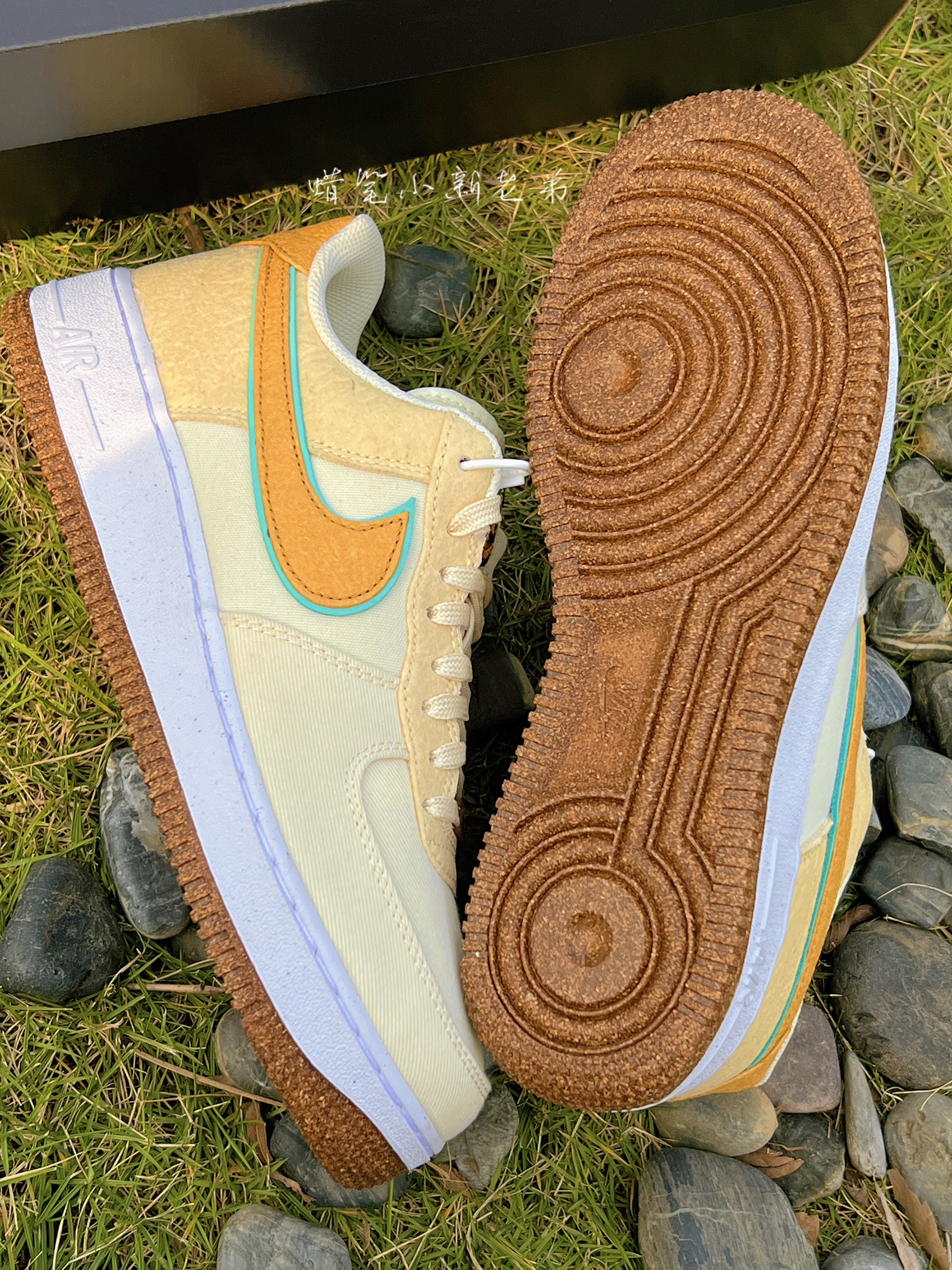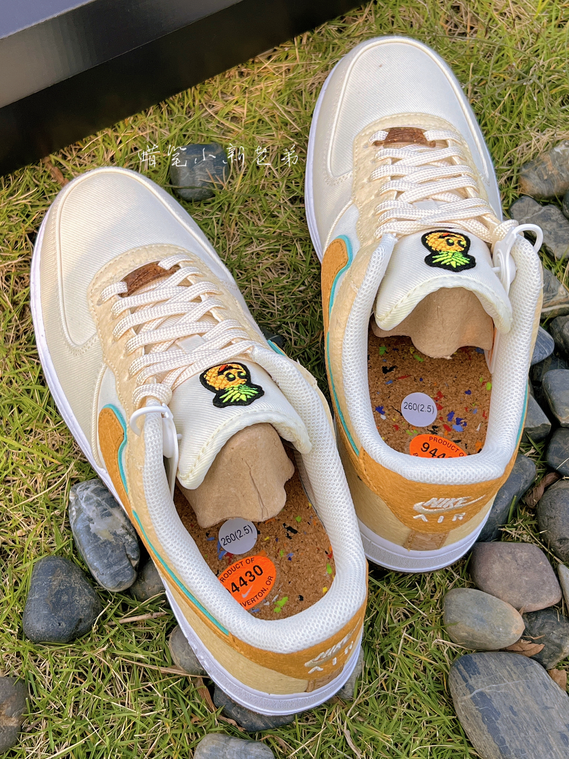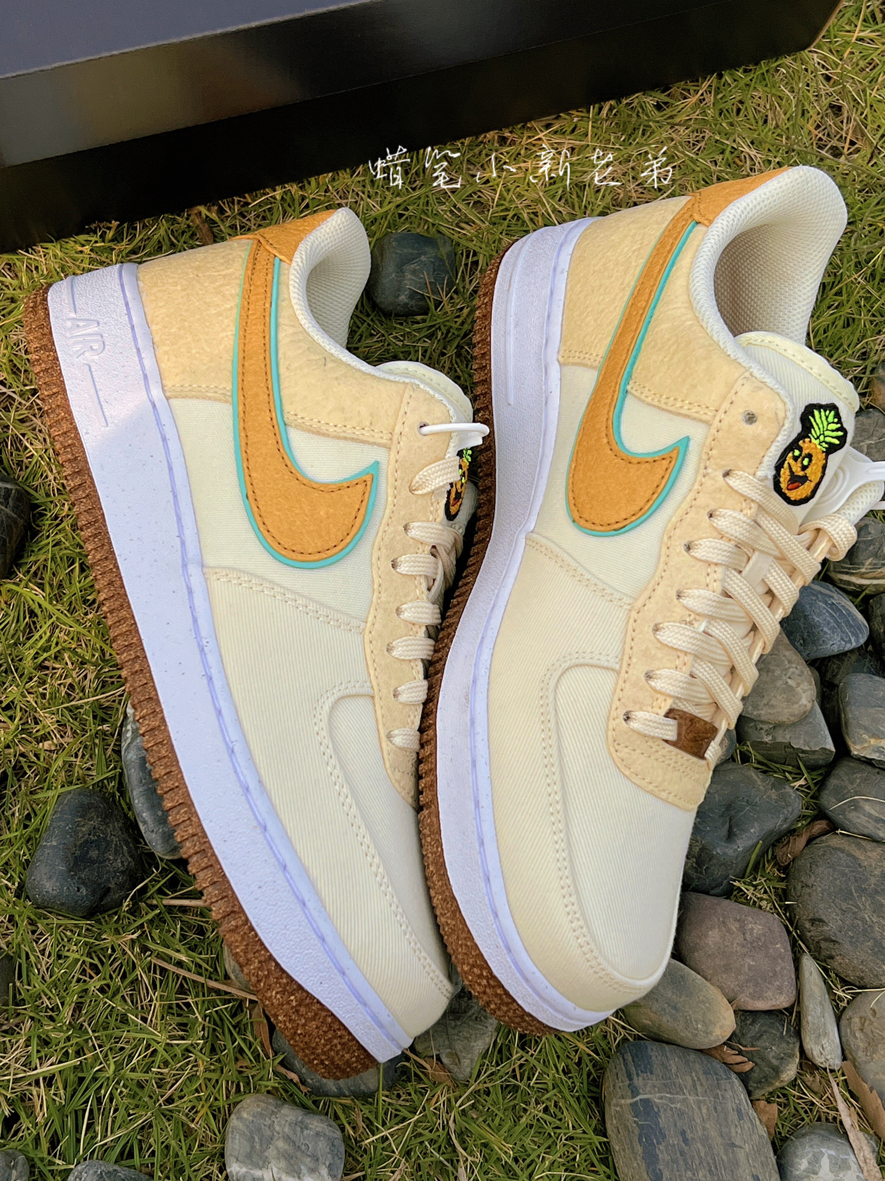 Nike air force 1 low happy pineapple 低帮 拼色休闲板鞋 米棕 菠萝 鞋子整体采用了米棕色,Swoosh采用薄荷绿➕棕色双层设计风格,细节满满,鞋舌有着小菠萝刺绣点缀,鞋面采用了编织材质➕帆布材质组成,比较适合秋冬季节,鞋底采用了类似煤渣的设计,具有独特的个性,Air缓震中底提升鞋子舒适脚感