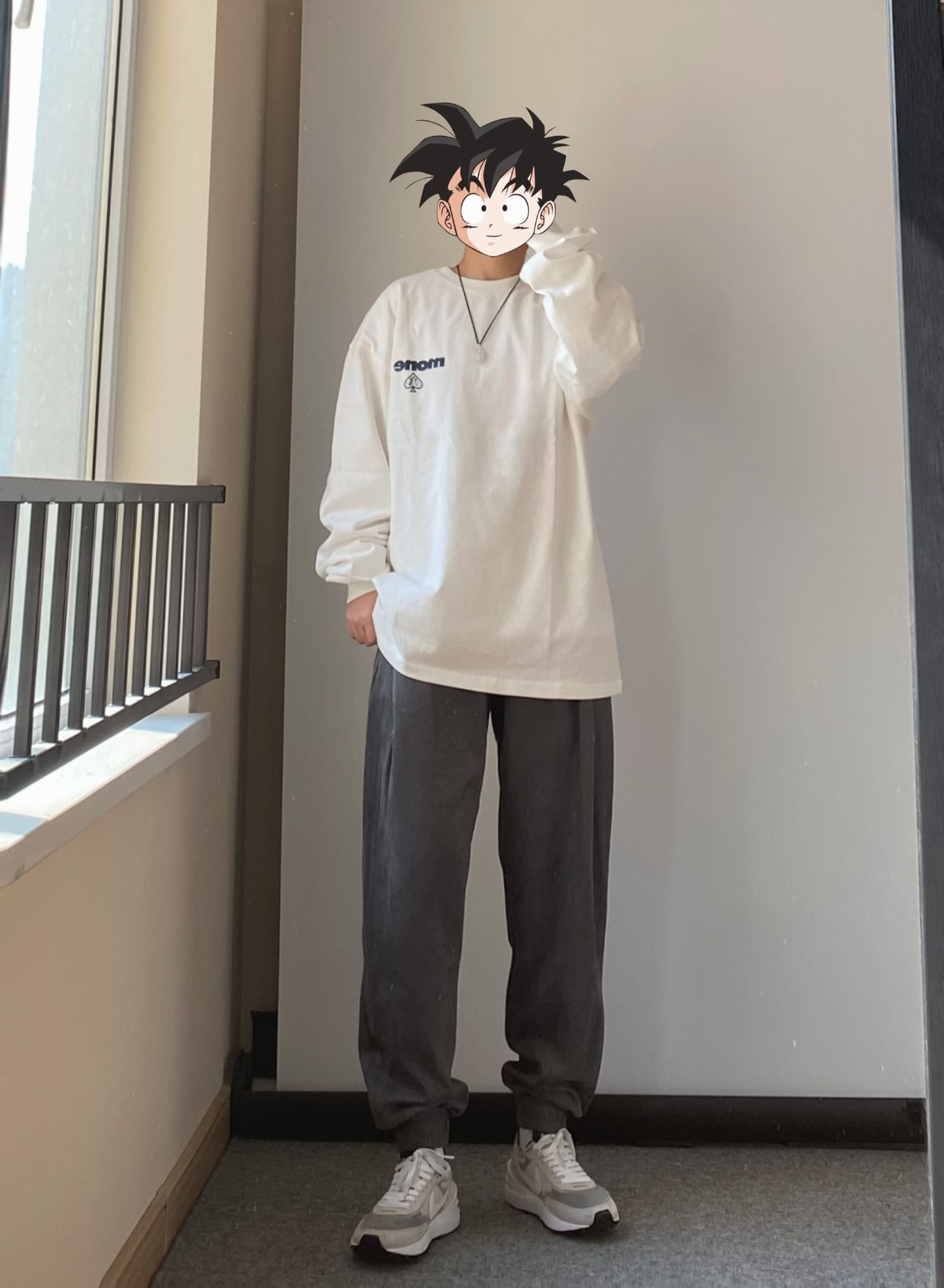 习惯了黑白灰 可以尝试一下藏青色的卫裤 也非常百搭 上衣搭配灰色或者黑色的帽衫卫衣很好看哦