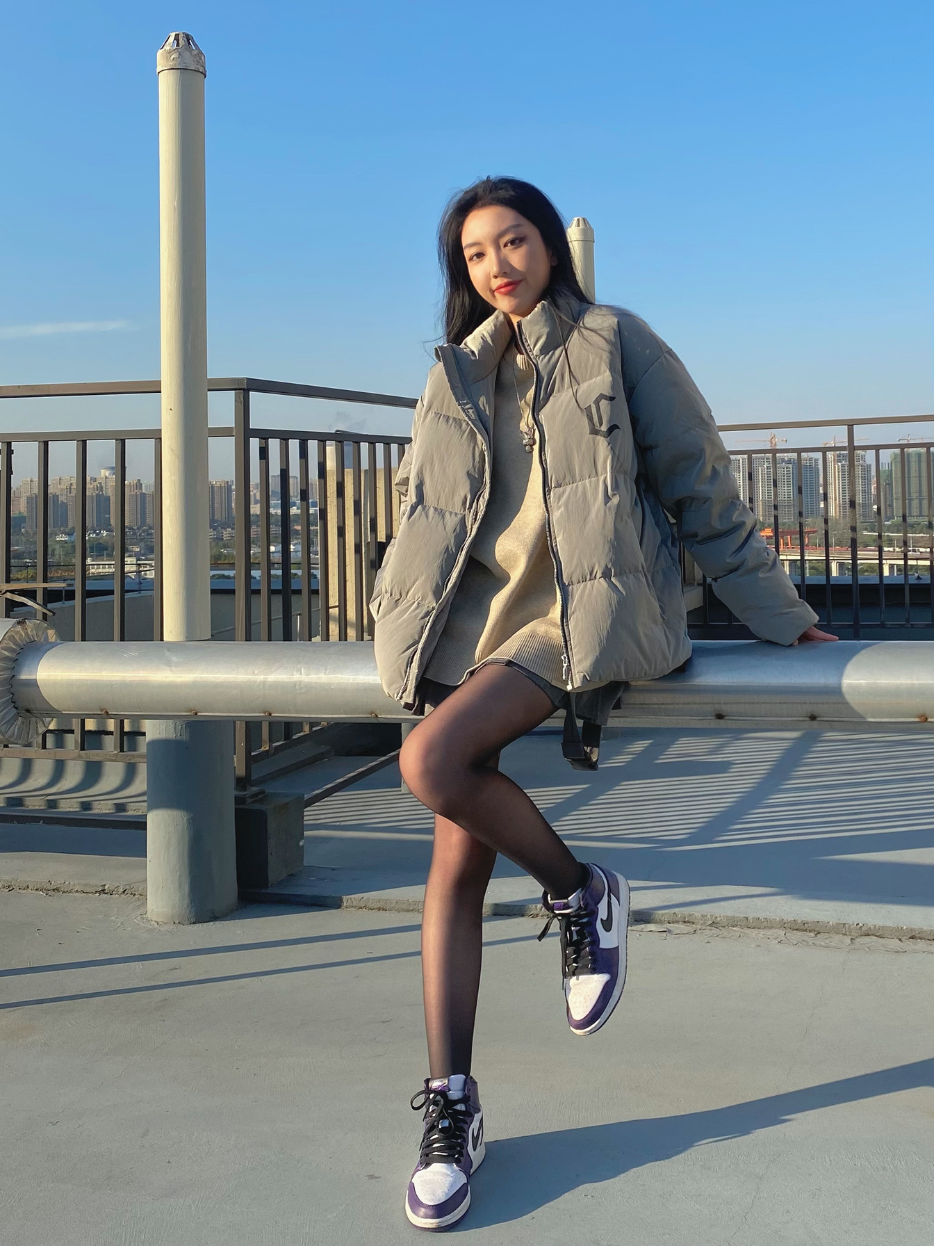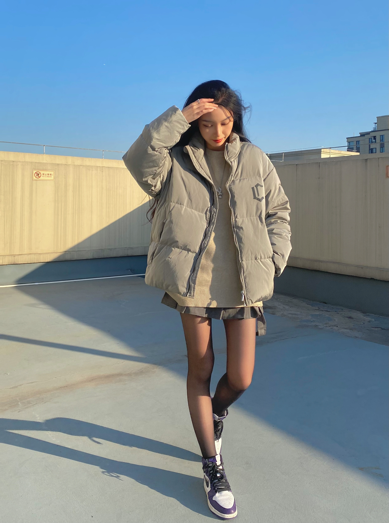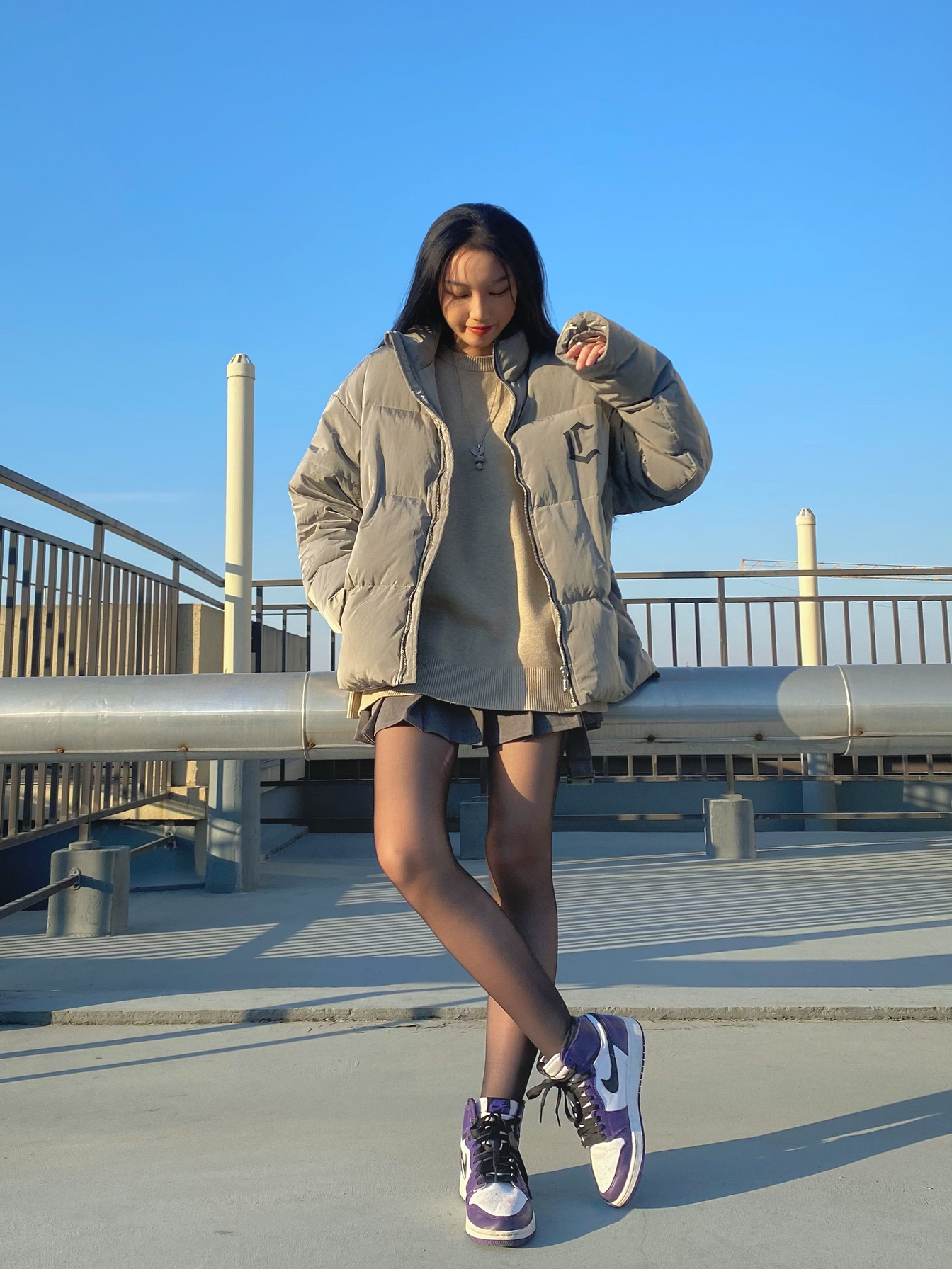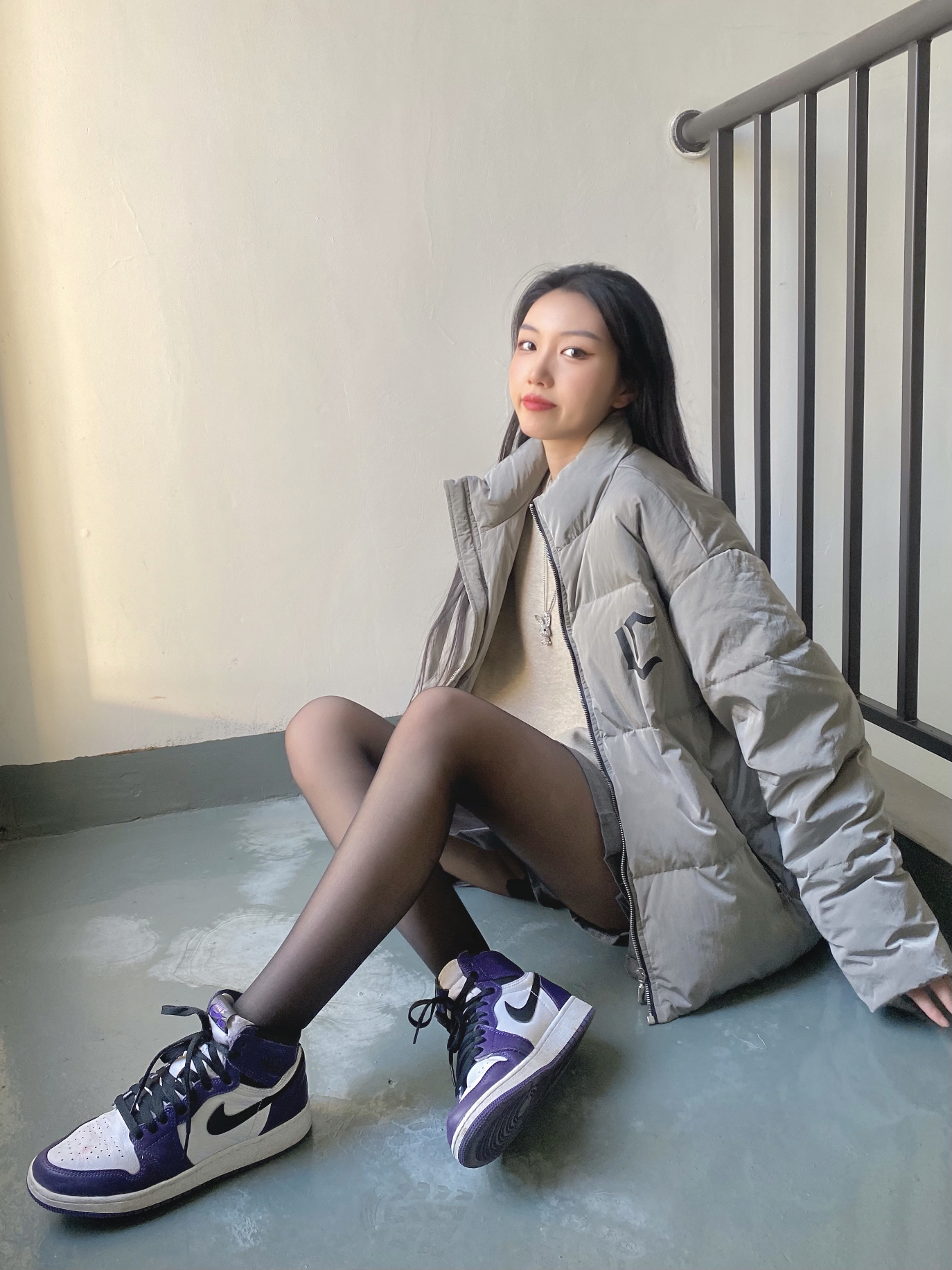 天气冷热不定 注意保暖呀 今天分享chinism家的羽绒服 整体浅灰色 面包服款式简约百搭 保暖度满分!男女都可穿 我搭配了同色系裙子和aj1白紫脚趾 酷飒的感觉 🧥:chinism 👟:aj1 白紫脚趾