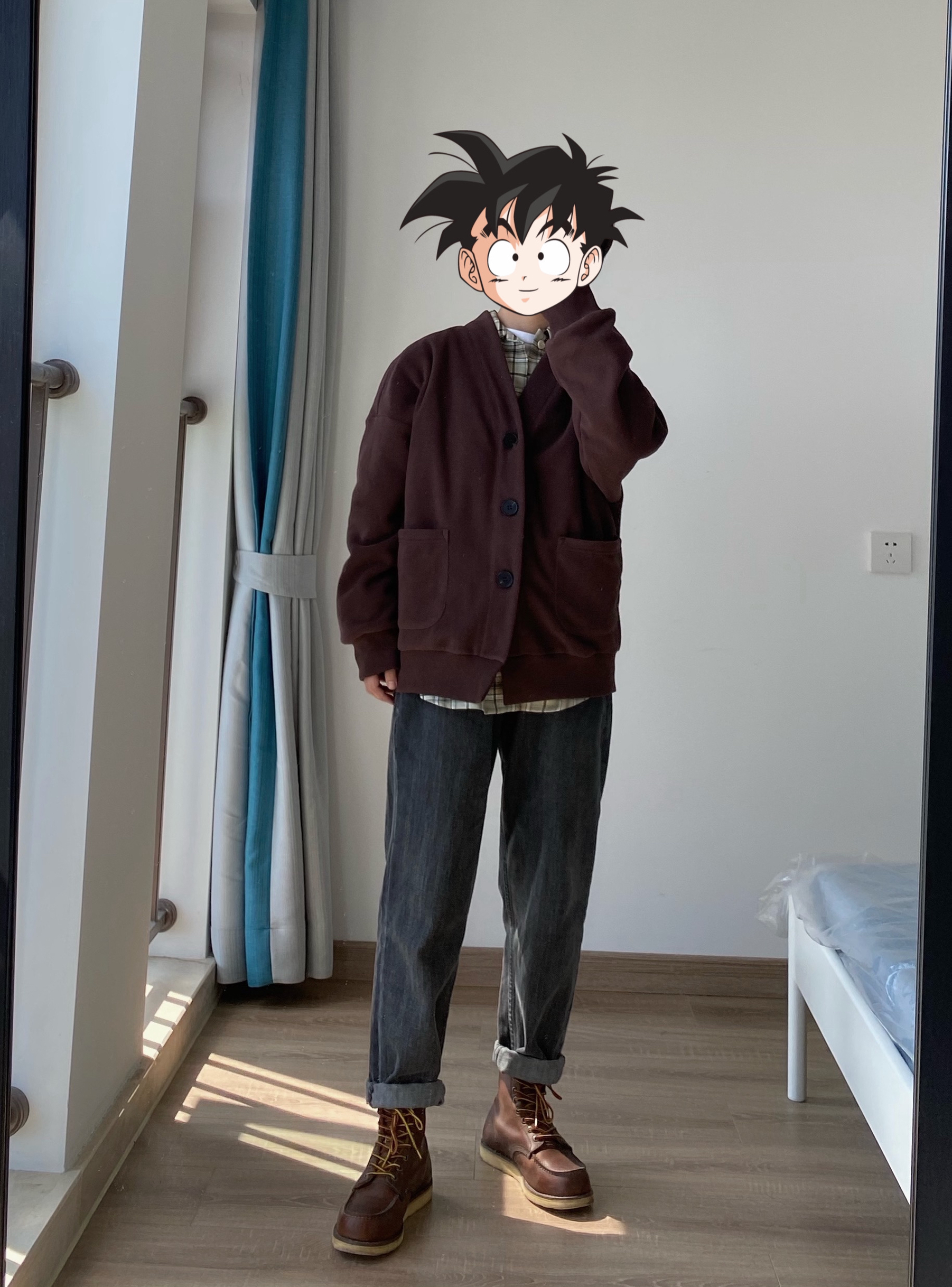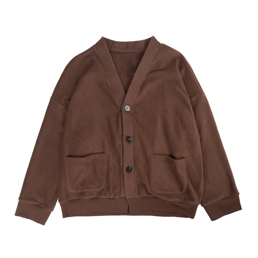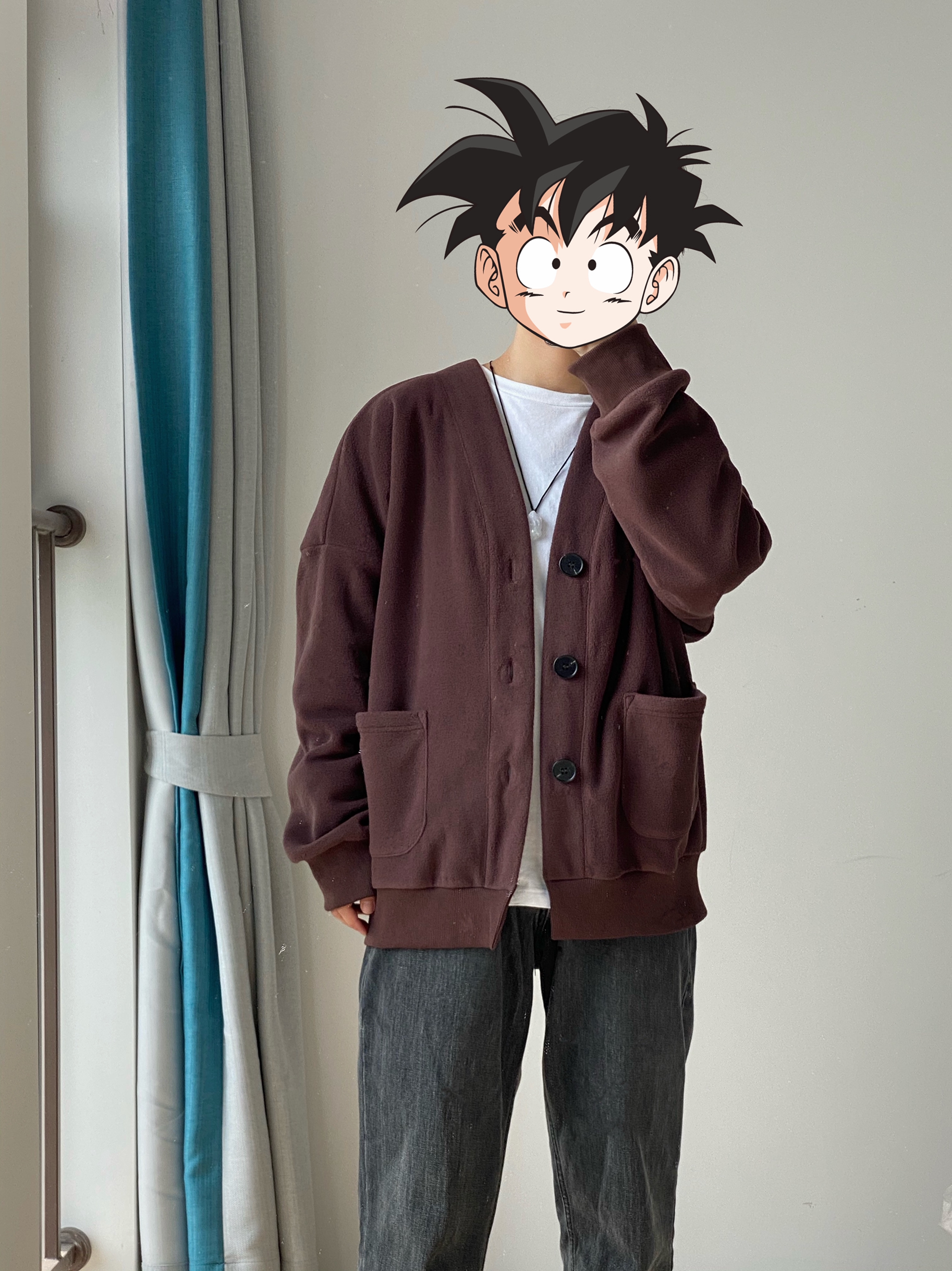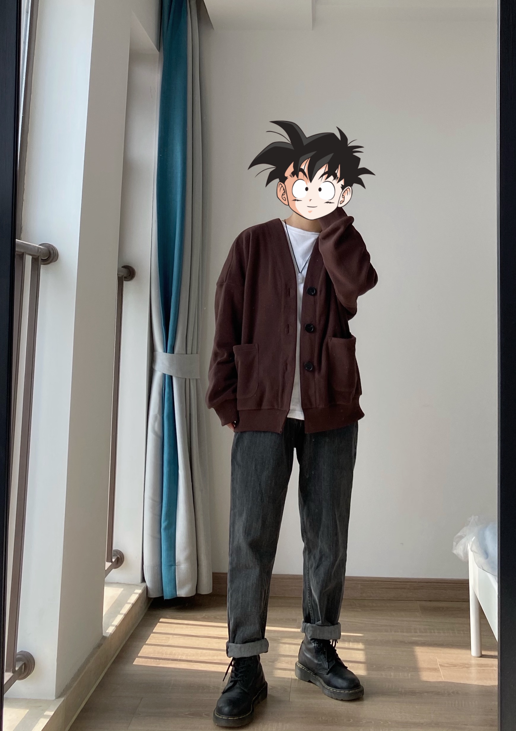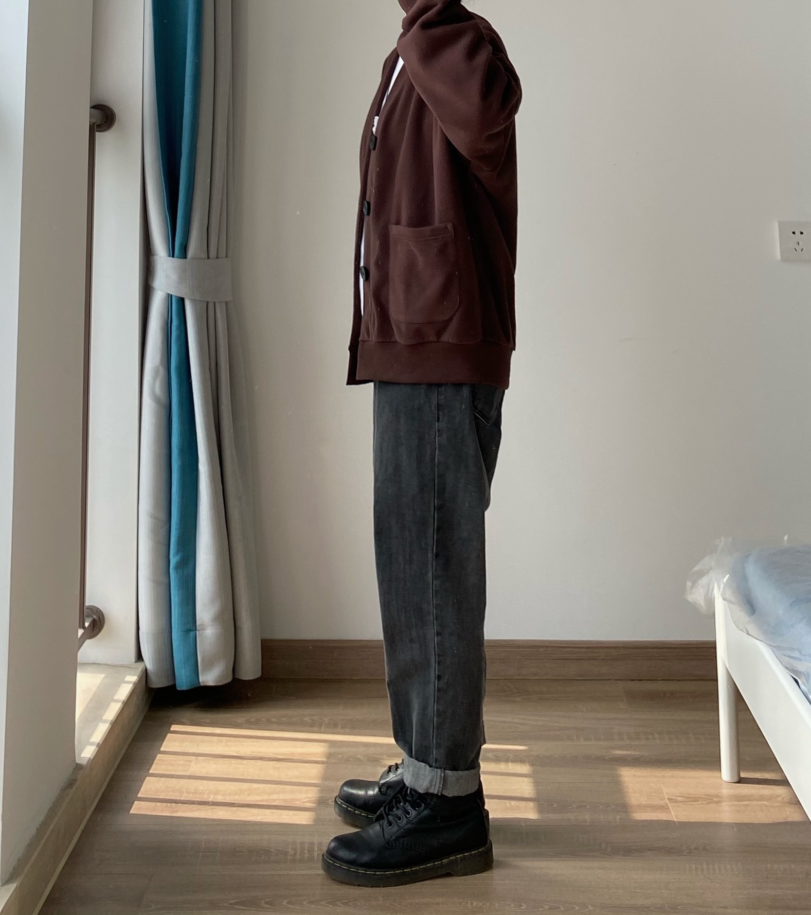 我很少穿开衫外套 因为太修身的穿起来很像精神小伙 这款开衫的版型刚好偏宽松一点 面料也比较厚实 双面的摇粒绒面料 可以春秋的时候直接外穿 秋冬的时候在里面做内搭 👖裤子搭配的是白告studio 的黑灰色小脚牛仔裤 鞋搭配的是Dr martens的黑色的高帮马丁靴