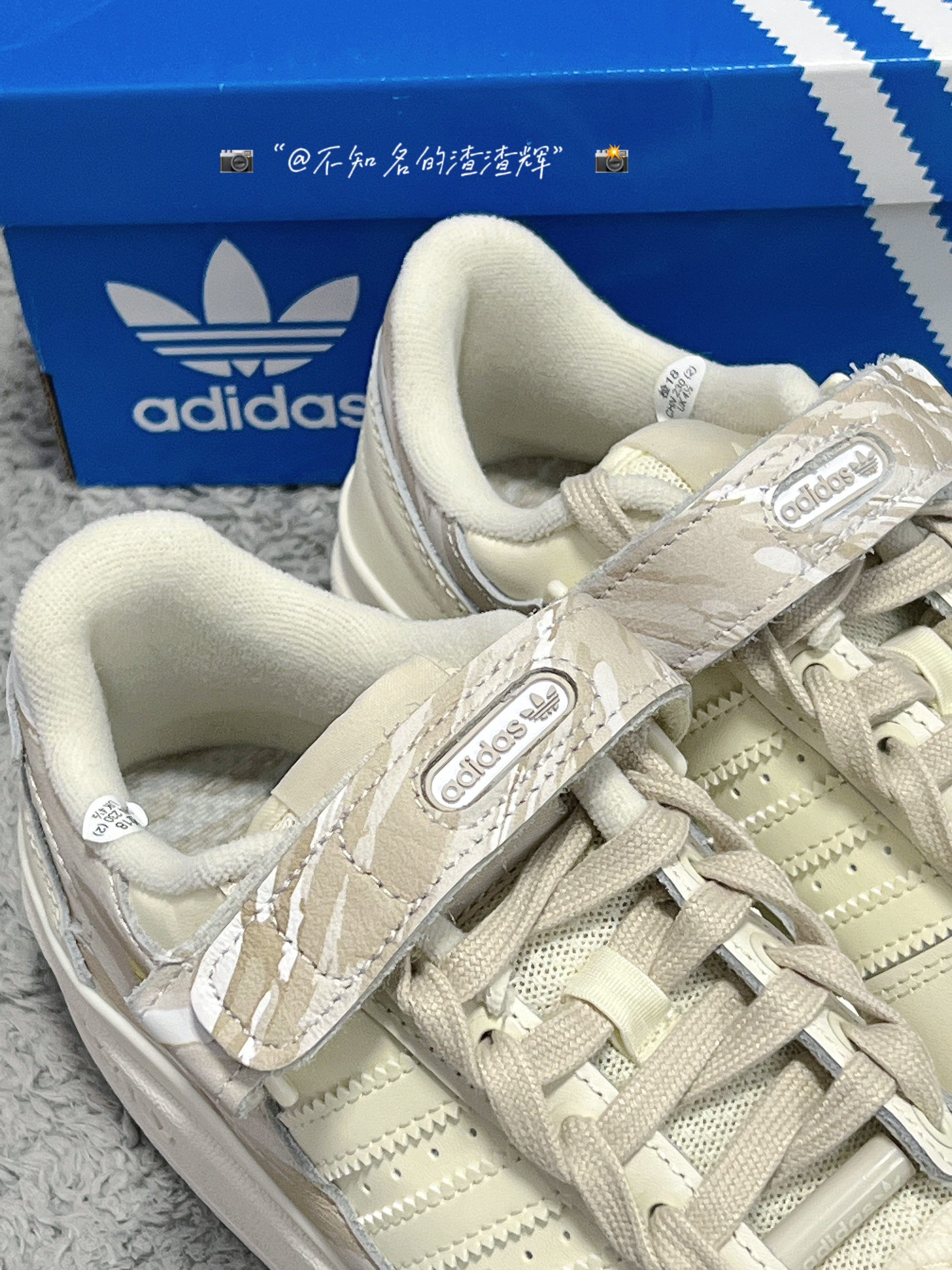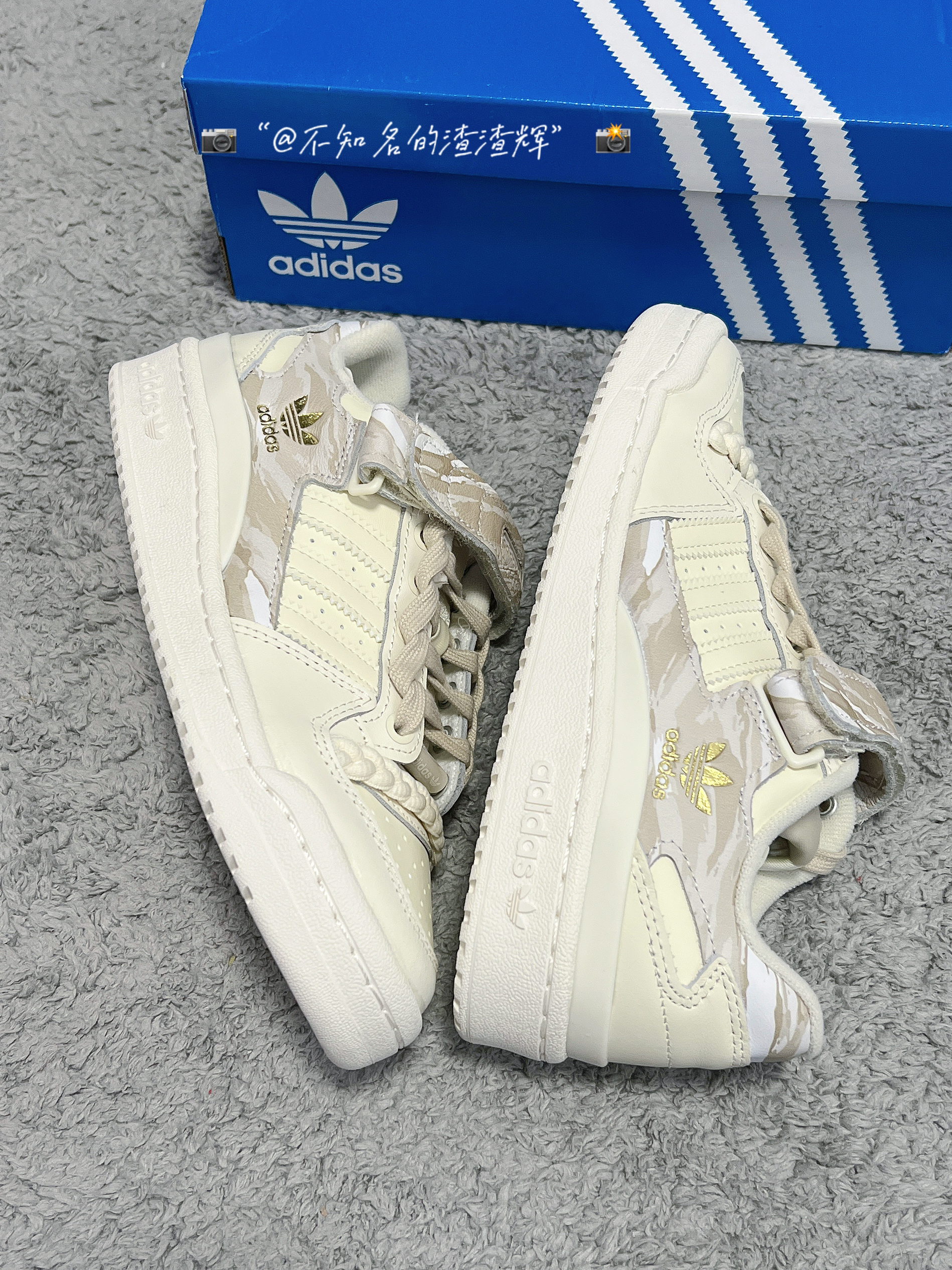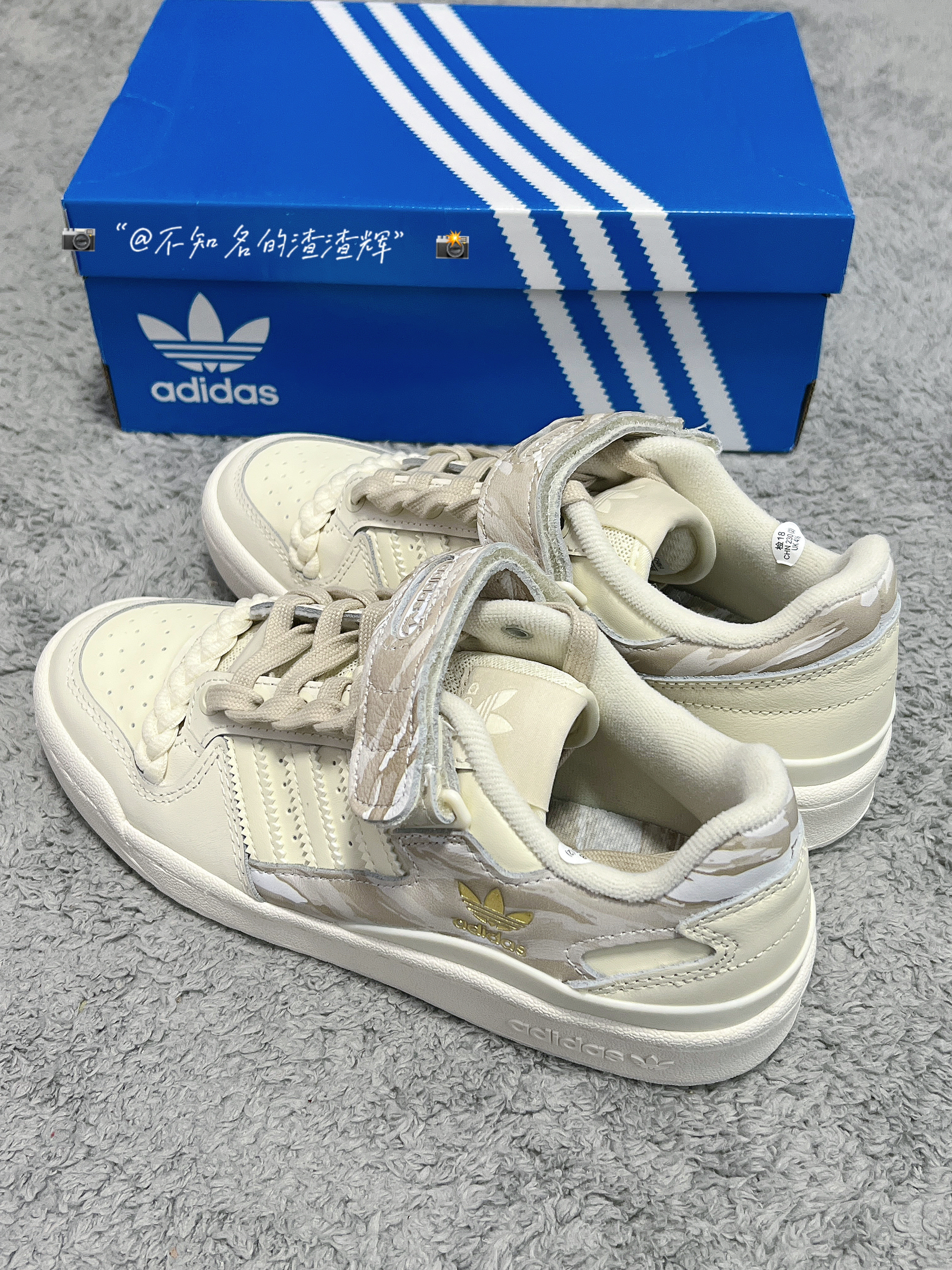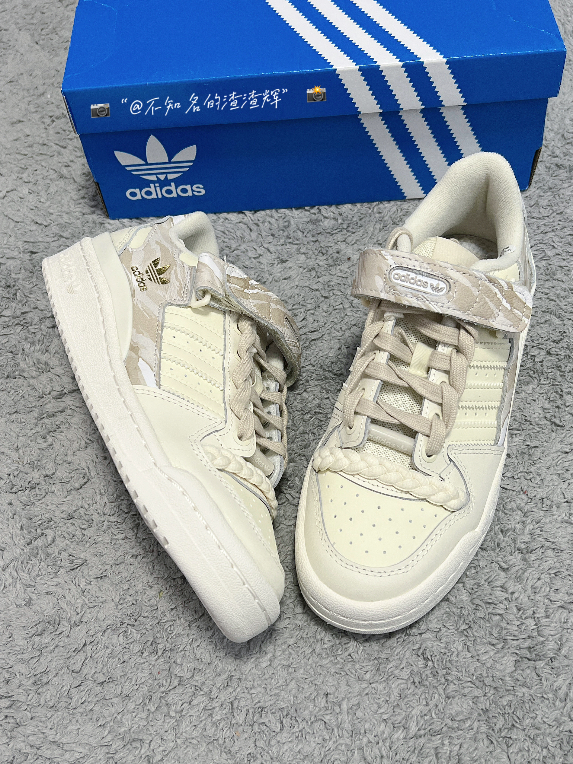 ️ 🤔:adidas originals Forum Low 舒适耐磨板鞋 女款 米棕色 🤔:这双鞋子整体以米白色呈现,鞋身和魔术贴都有着迷彩印花设计,满满的高级感,魔术贴、中底、鞋帮处都有着adidas三叶草标志彰显身份,鞋带有着独特的麻绳设计,也是这双鞋子的灵魂,鞋面整体采用优质皮革材质,质感舒适,橡胶大底防滑耐磨都很不错 🤔:特别特别宝藏的一款鞋子,适合女生穿,上脚真的无敌好看 🤔:尺...