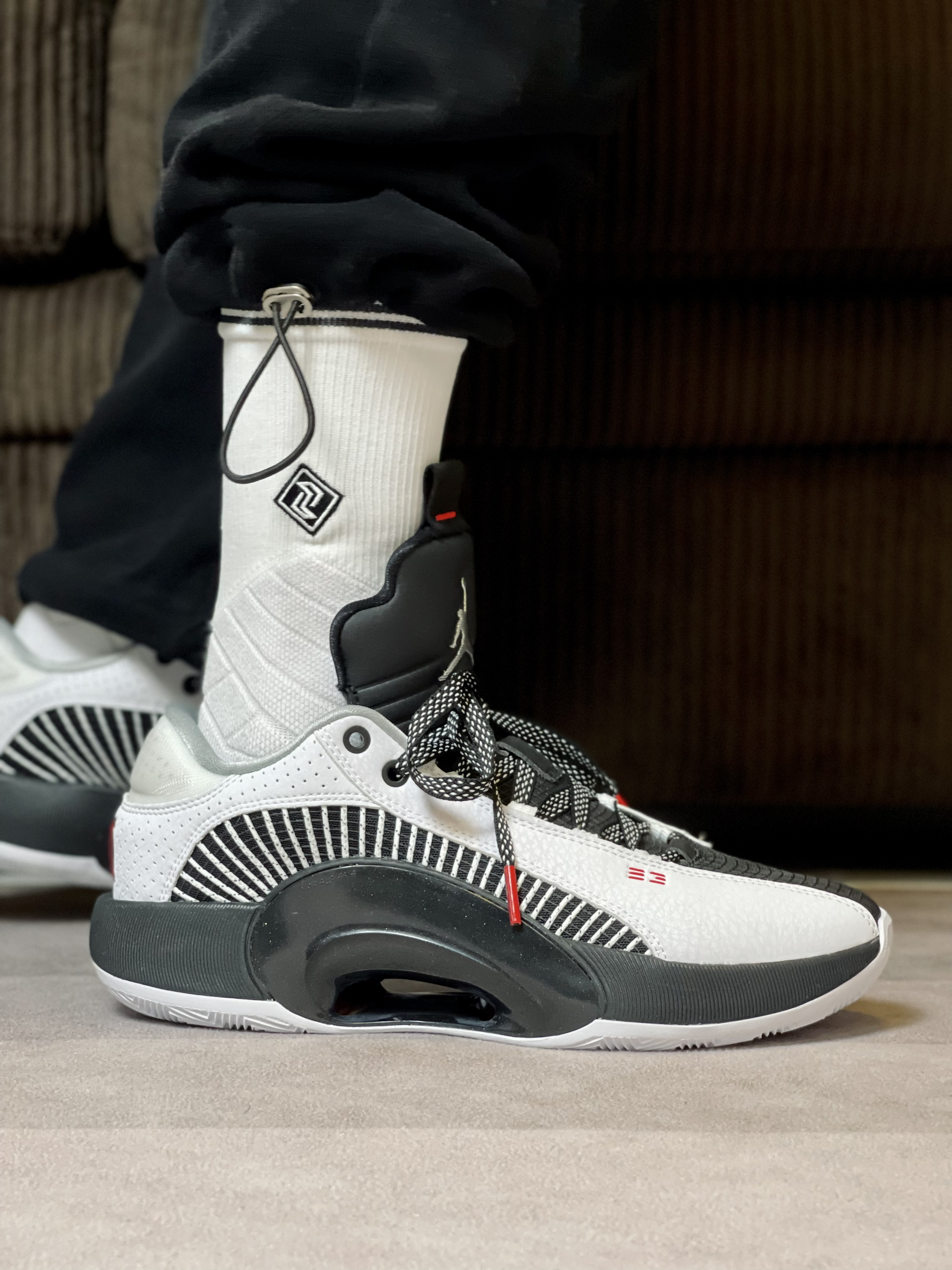 649元的AJ35 低帮 黑白,我怎么拒绝? 球鞋: Air Jordan 35 low 黑白 五折不到,真的香,黑白配色兼顾日常穿搭,白色部分皮革带有明暗纹理,后跟皮革有冲孔处理,鞋底xdr大底,综合实战性能方面我也就不过多赘述了 袜子: 左右力量 矩阵pro篮球精英袜,加强版本性能方面无需考虑 我也算是他家的忠实老粉丝,新品必支持