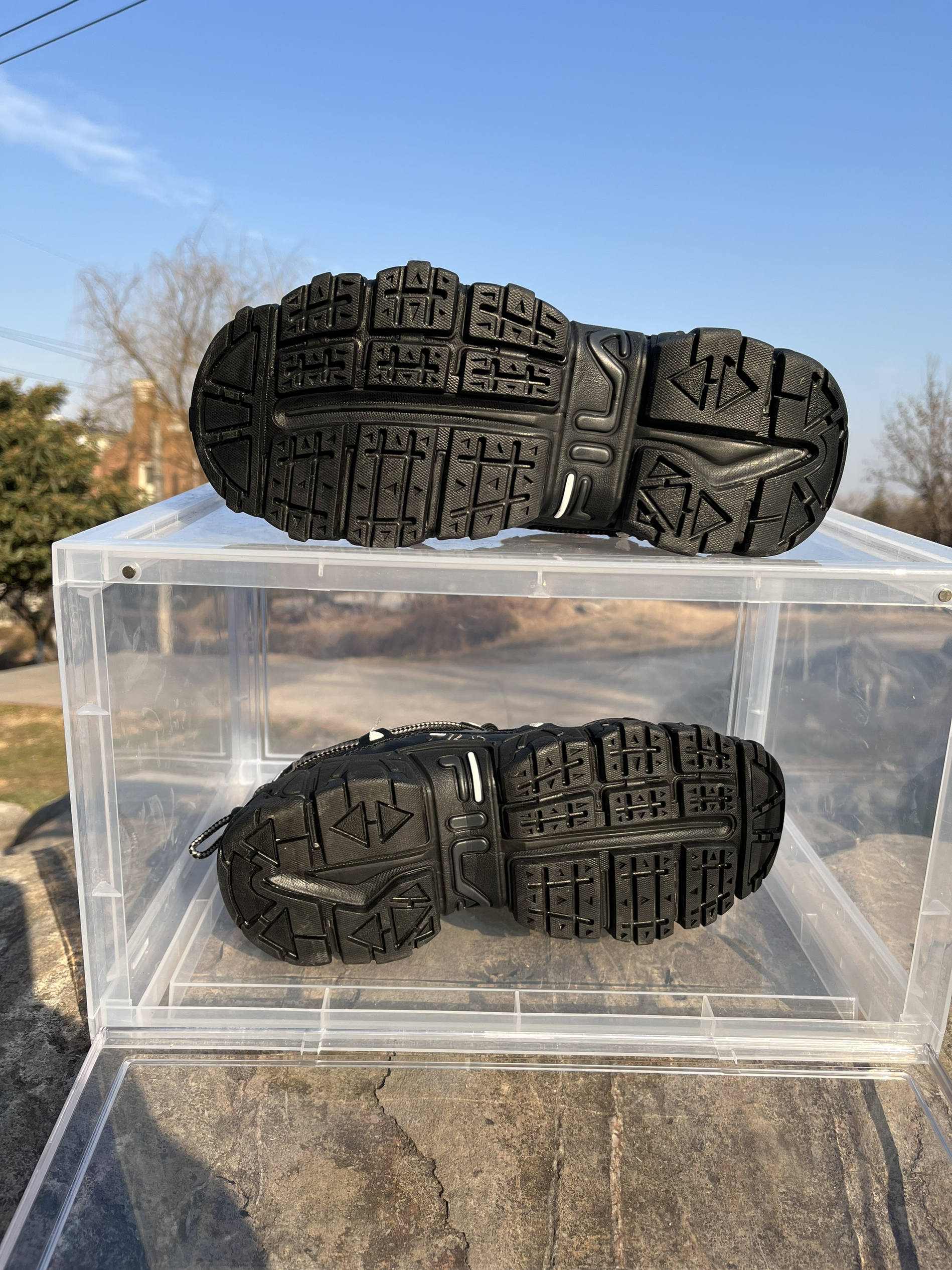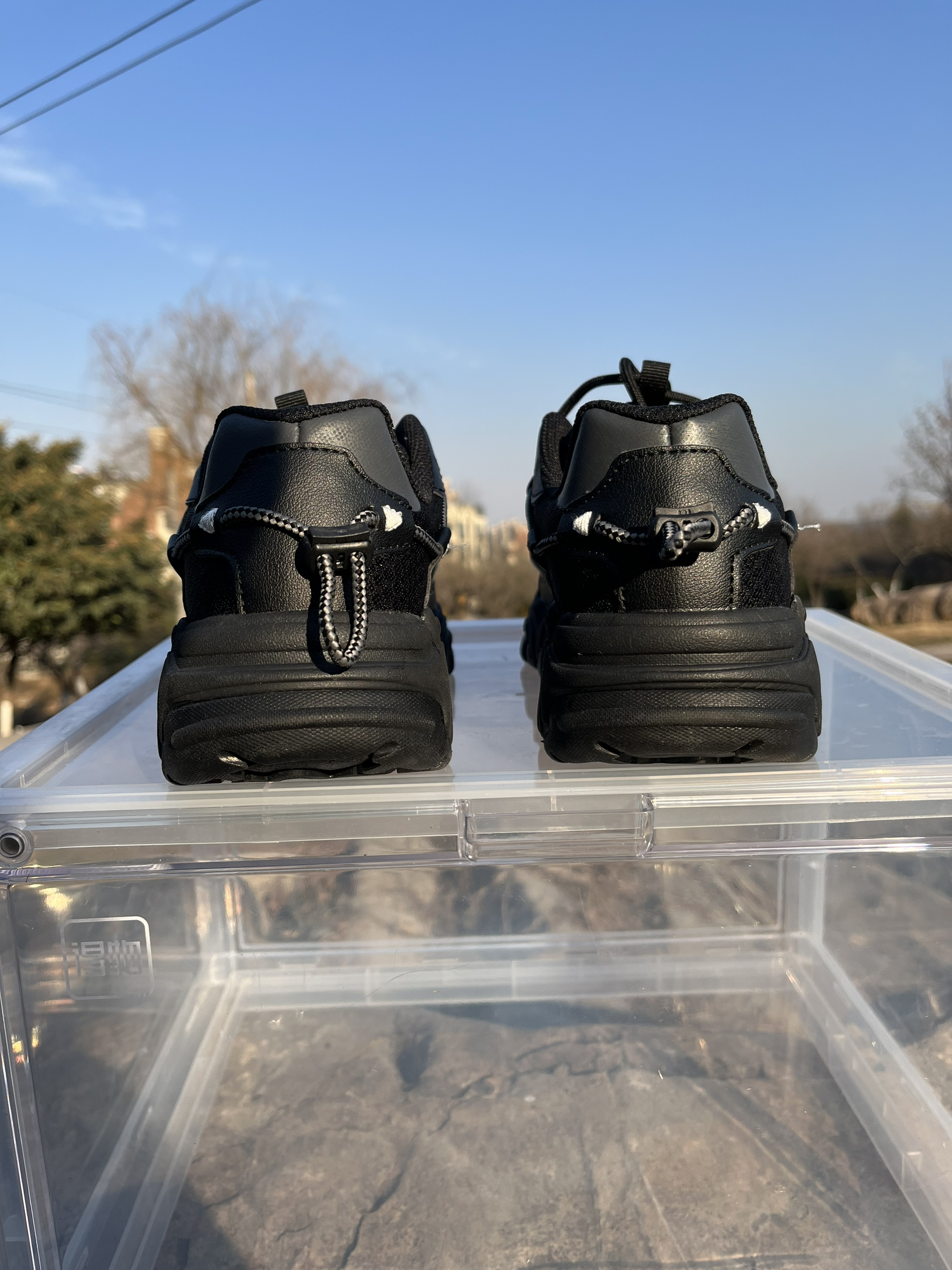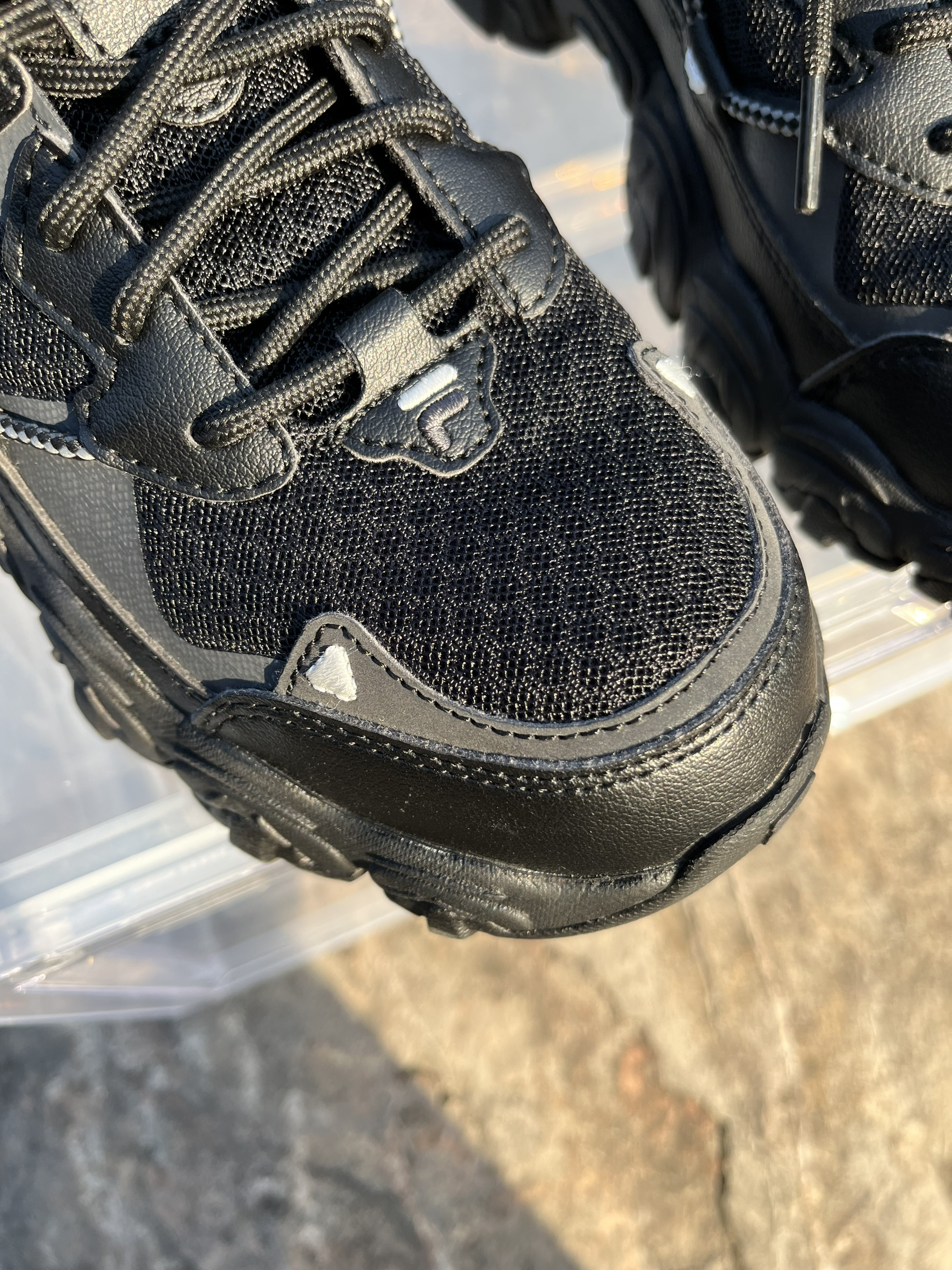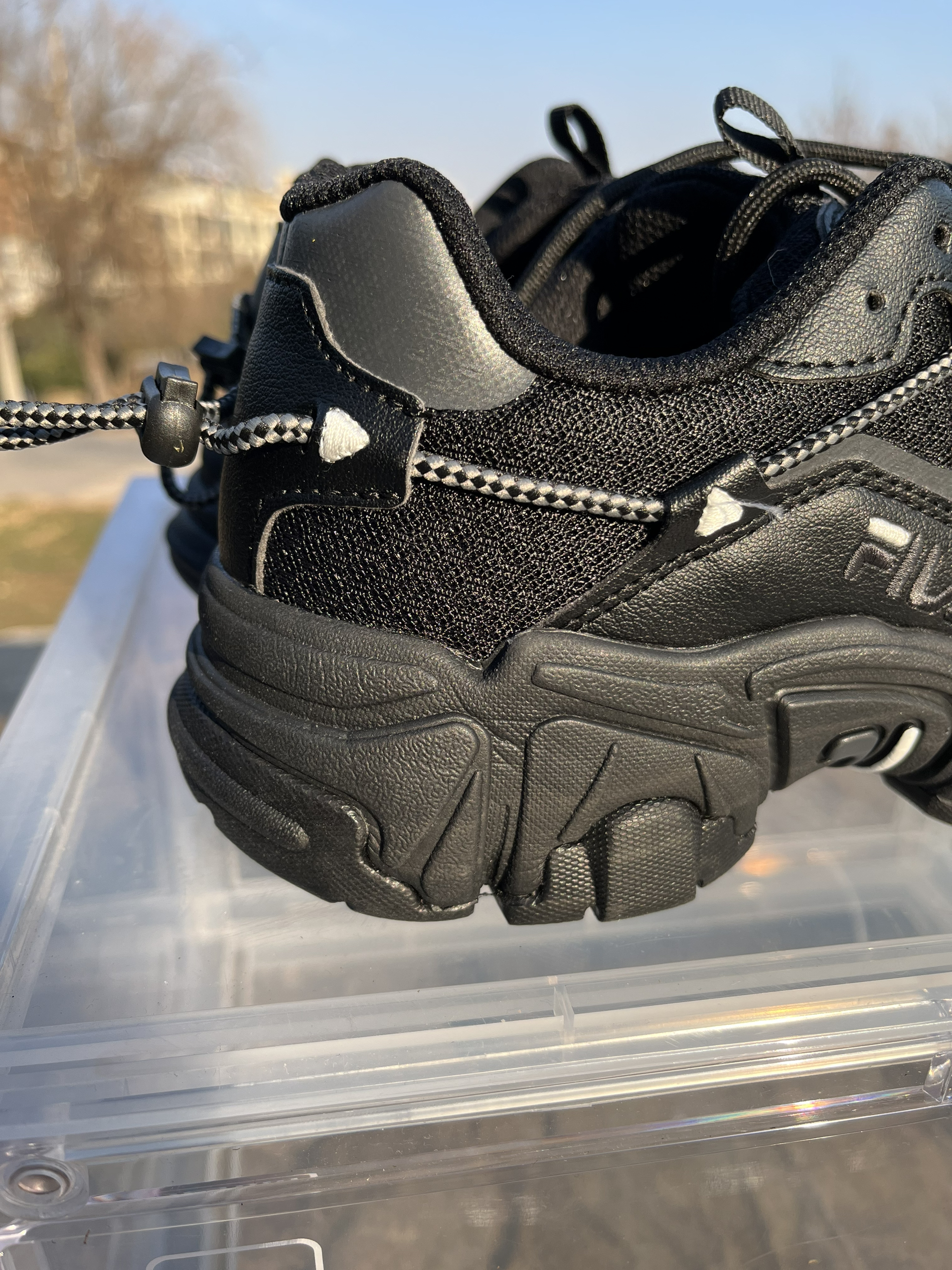 东毒西鞋今日分享 👟鞋名:【新年好物推荐】Fila斐乐猫爪跑鞋黑灰韩版男女同款 🪂 全黑色的搭配加上侧面银色的点缀。配色略显单调,不过也是这个单调使鞋子呈现出不一样的美感。 🪂 鞋面采用皮革和网布组合而成,透气性良好。侧面鞋绳上的三角形有着3M的效果, 🪂 鞋底采用黑色橡胶大底,纹路凹凸起伏更加耐磨防滑。鞋子鞋底是较厚的,有着4厘米左右的增高效果。