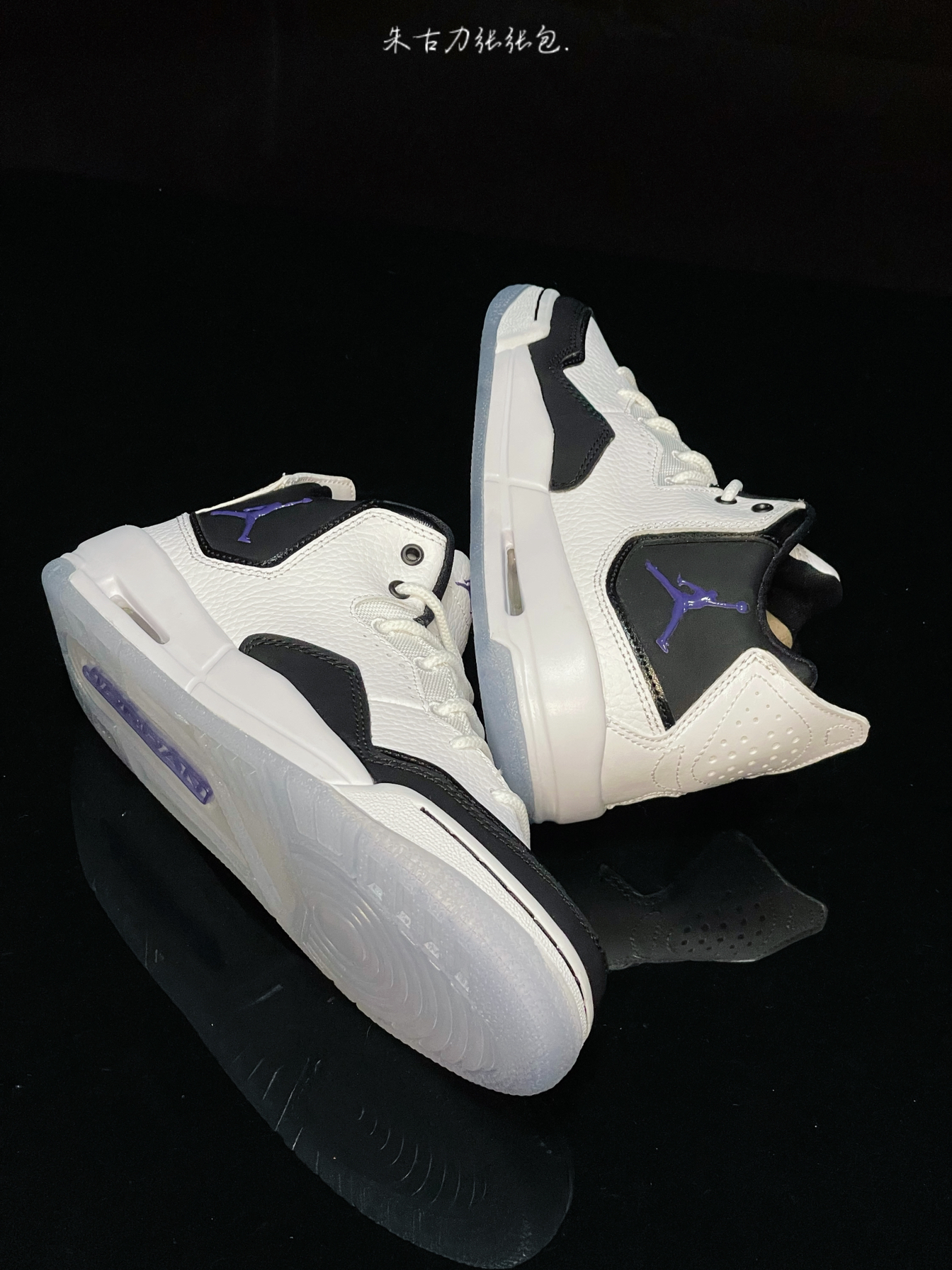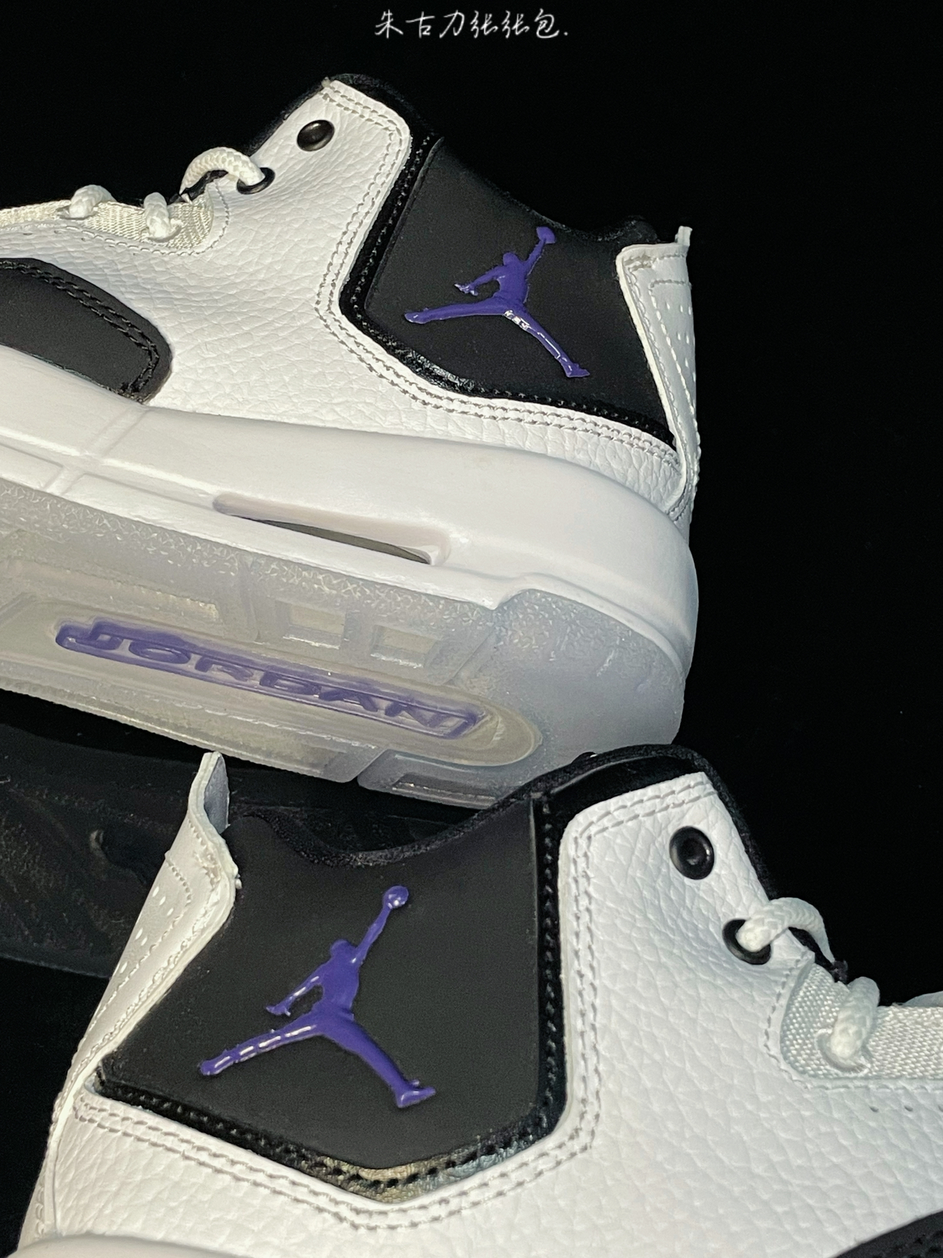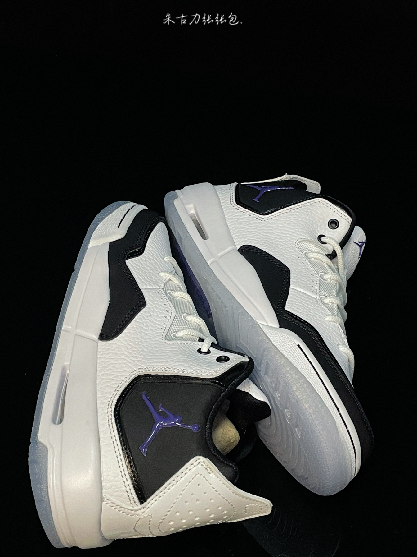 Air Jordan Courtside23 黑白 Concord 鞋身采用白色为主,还加上黑色点缀,配色是清新百搭又大方,鞋舌、鞋口处是黑色,鞋舌logo、鞋外侧带有紫色飞人logo,后跟提啦带 中底带有Air缓震,上脚感还是不错的,搭配水晶底,好看又耐穿,日常穿搭搭配运动裤、束脚裤等等很多都是不错的,价格合适,学生党可以冲!