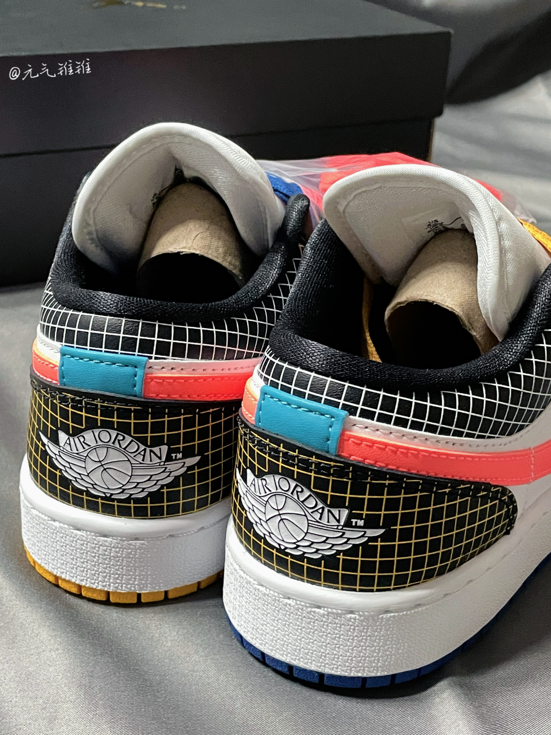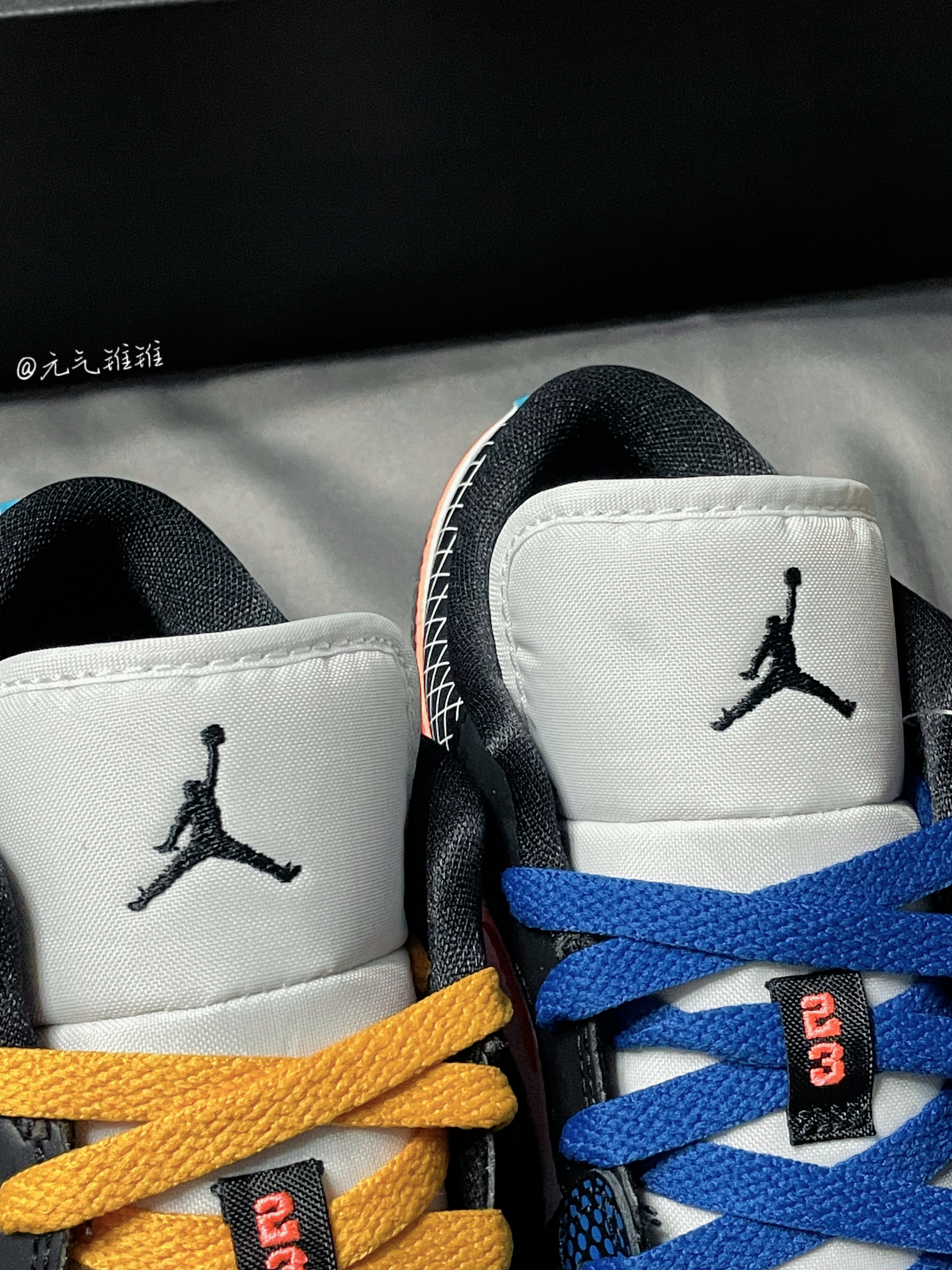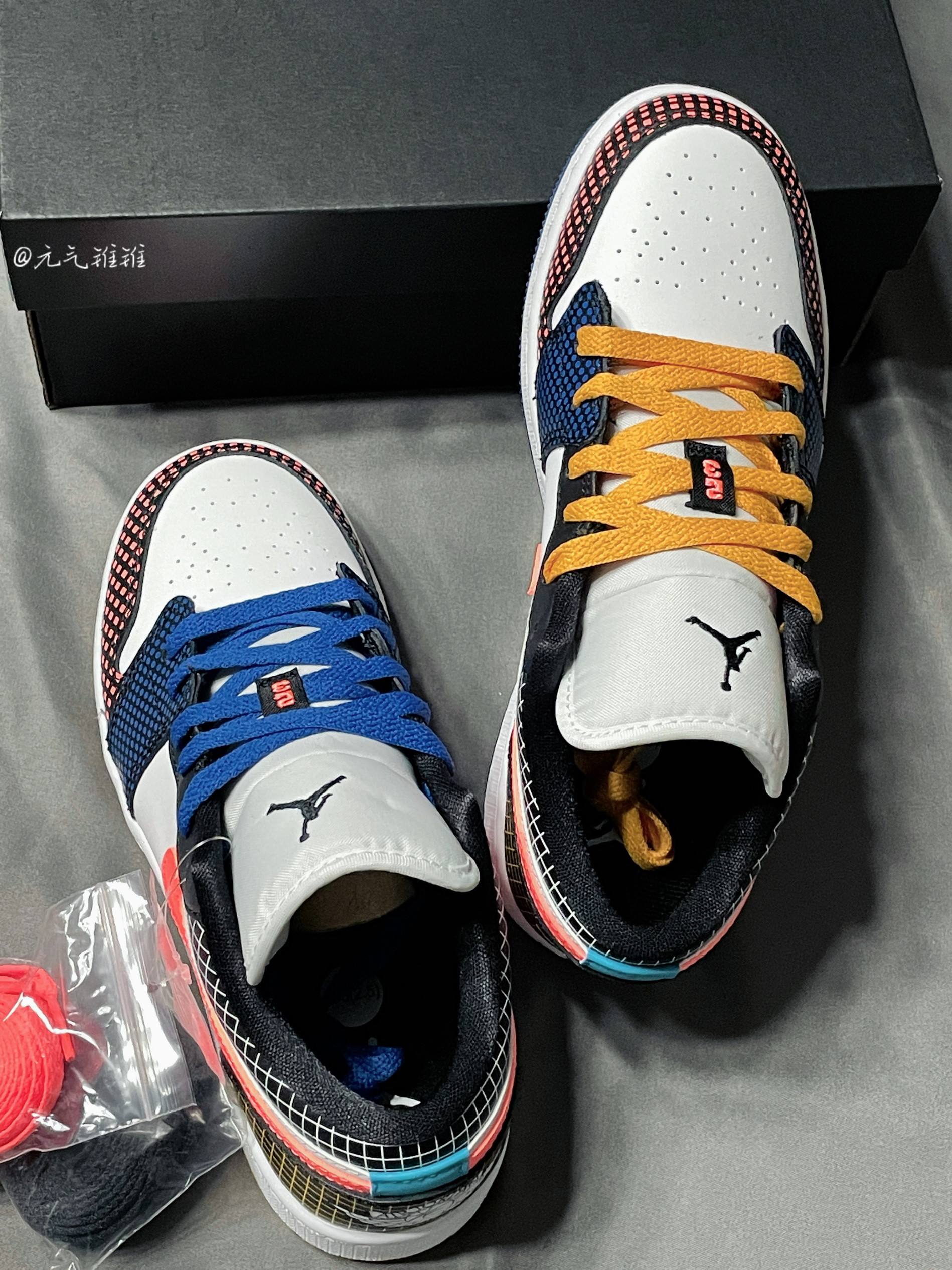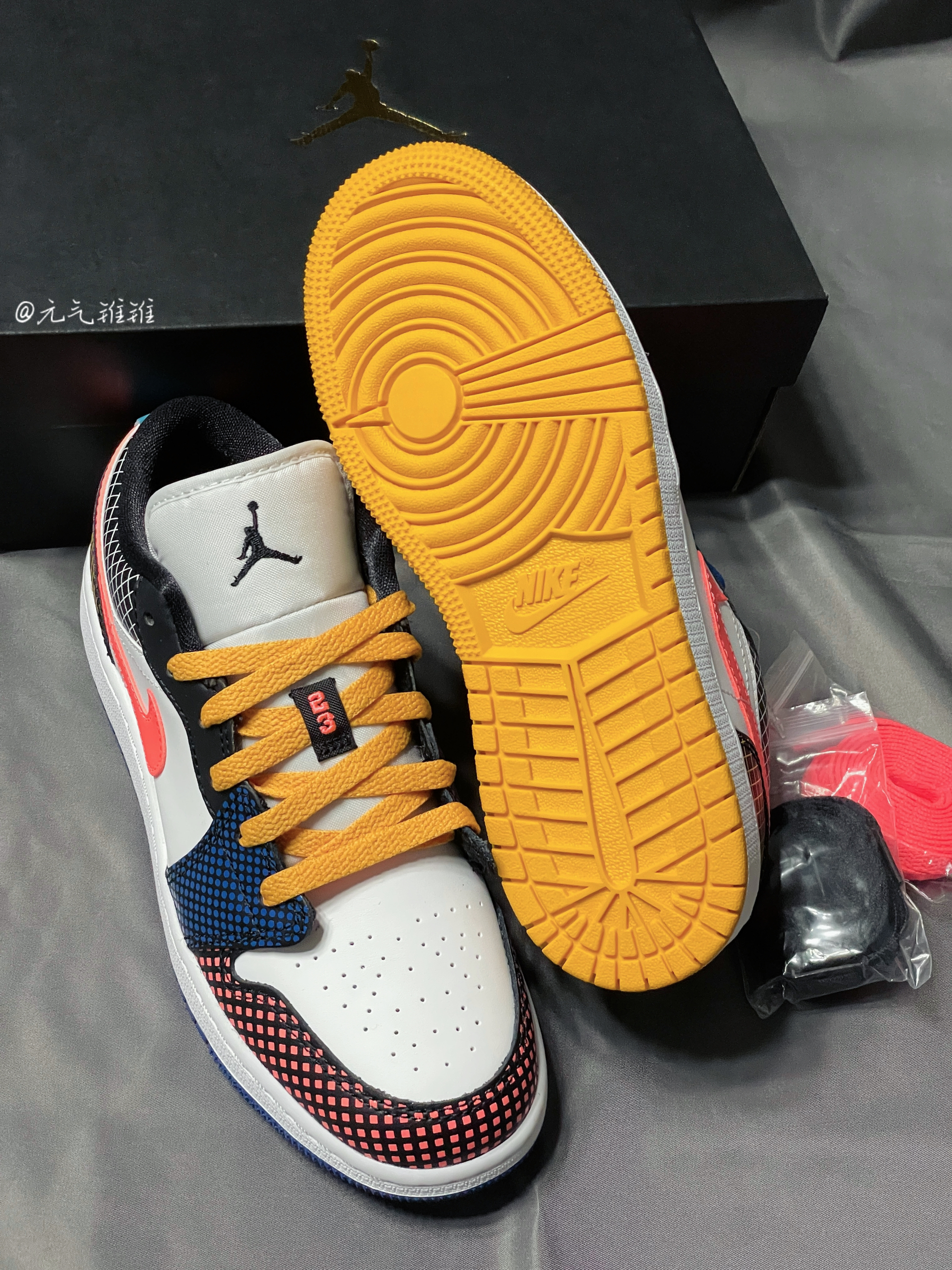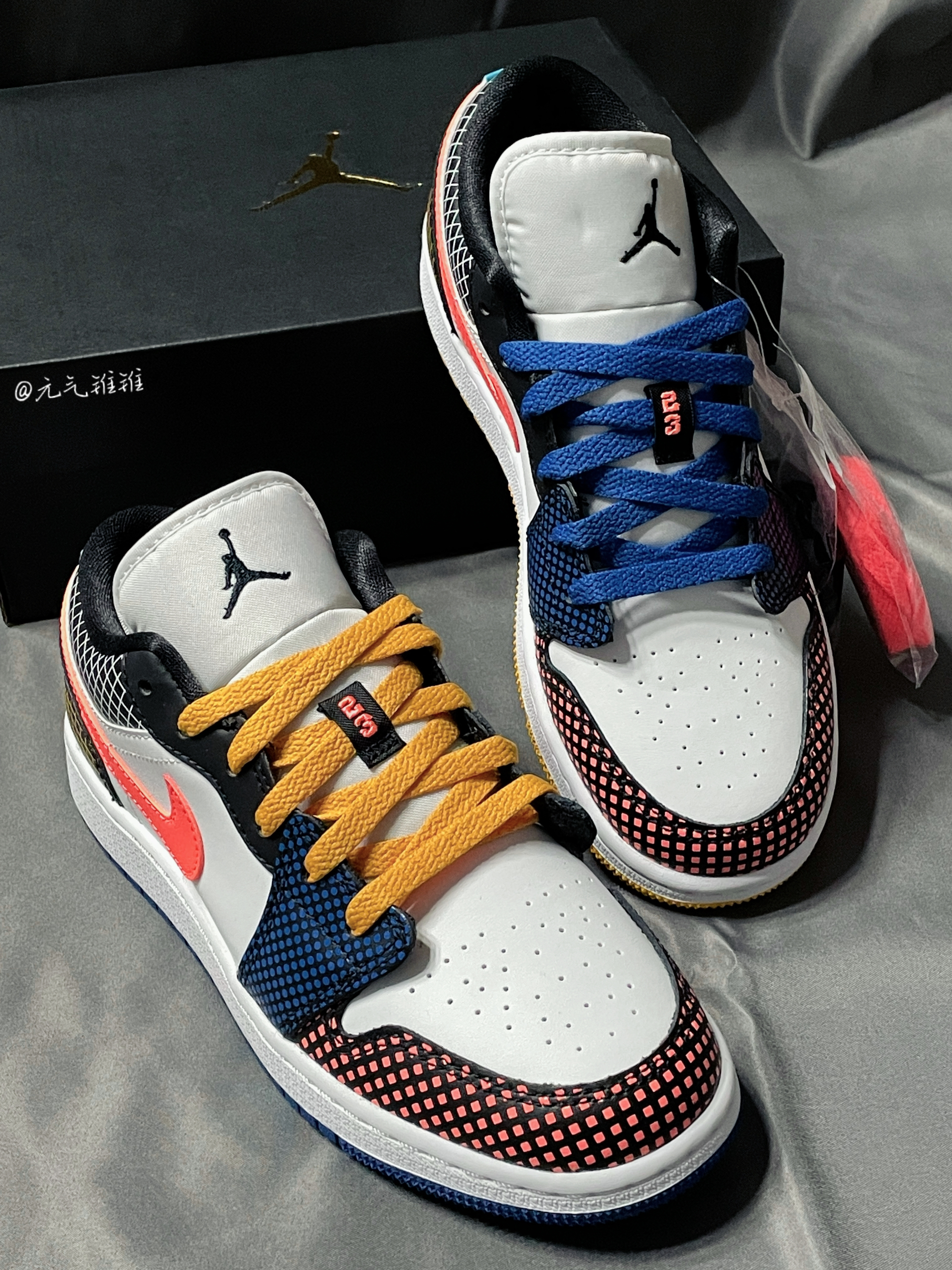 Air Jordan 1 Low (GS)多彩拼接鸳鸯 格子印花 鞋身采用多色拼接,鞋面、鞋舌、中底都是白色,左右脚分别是黄色和蓝色鸳鸯鞋带外底,鞋头、鞋带扣、鞋口、鞋后跟都有不同配色格子印花,鞋舌黑色飞人logo,后跟飞翼logo,各种细节都很赞,后掌Air Sole气垫,上脚感还可以