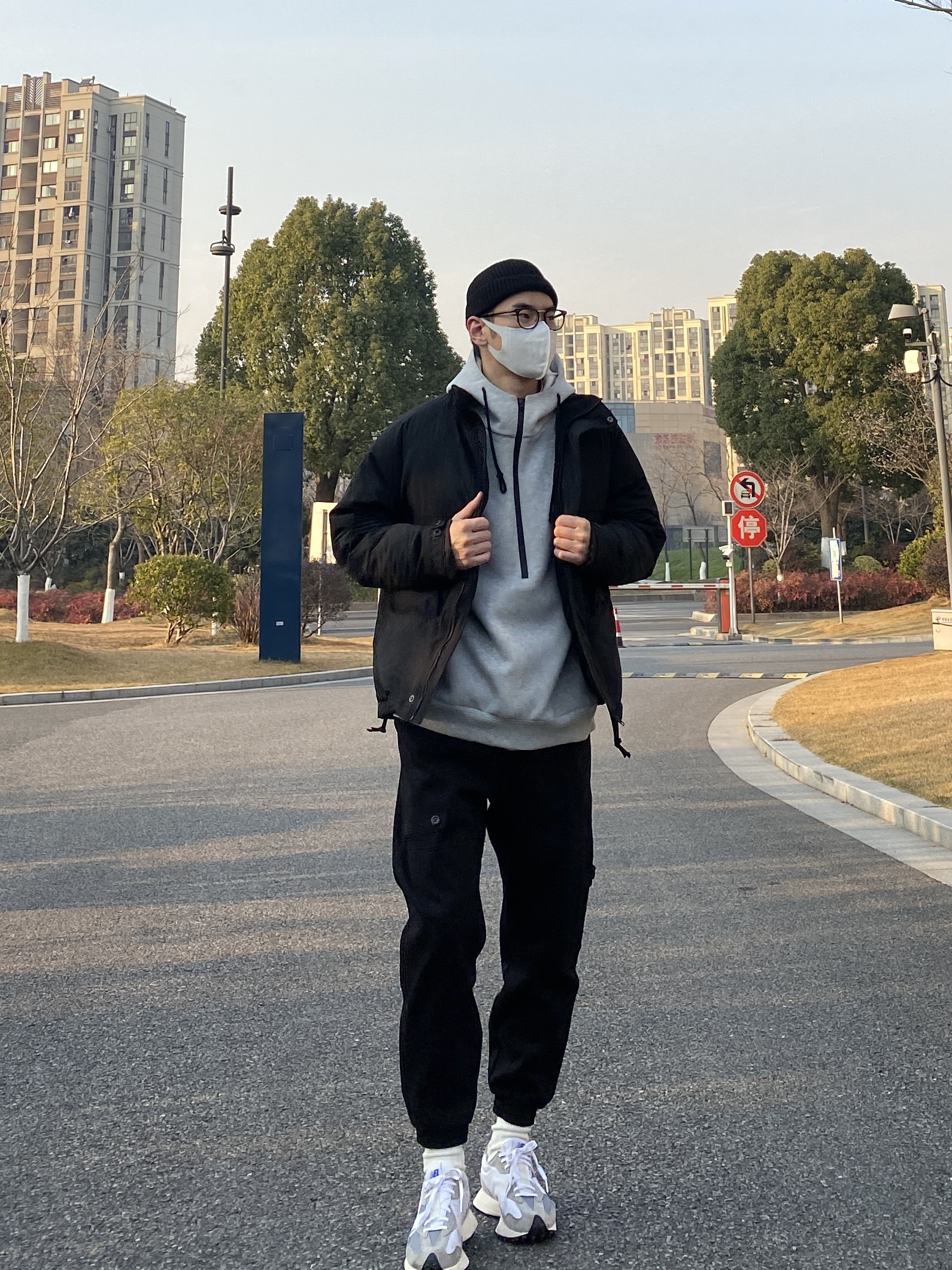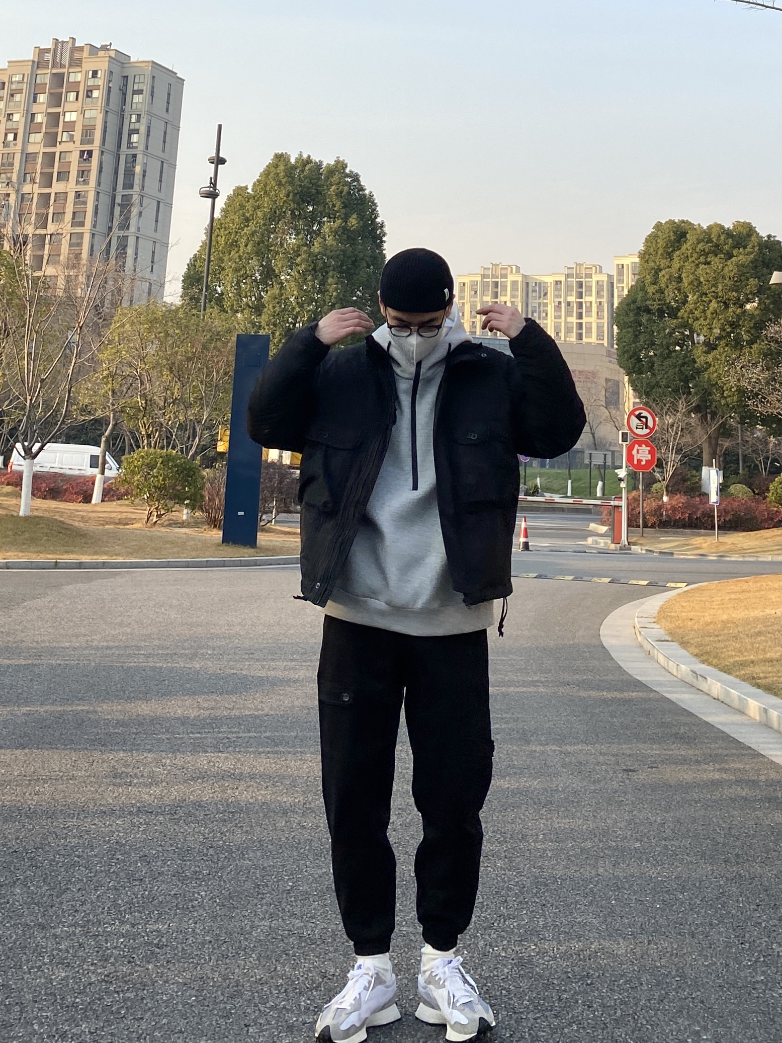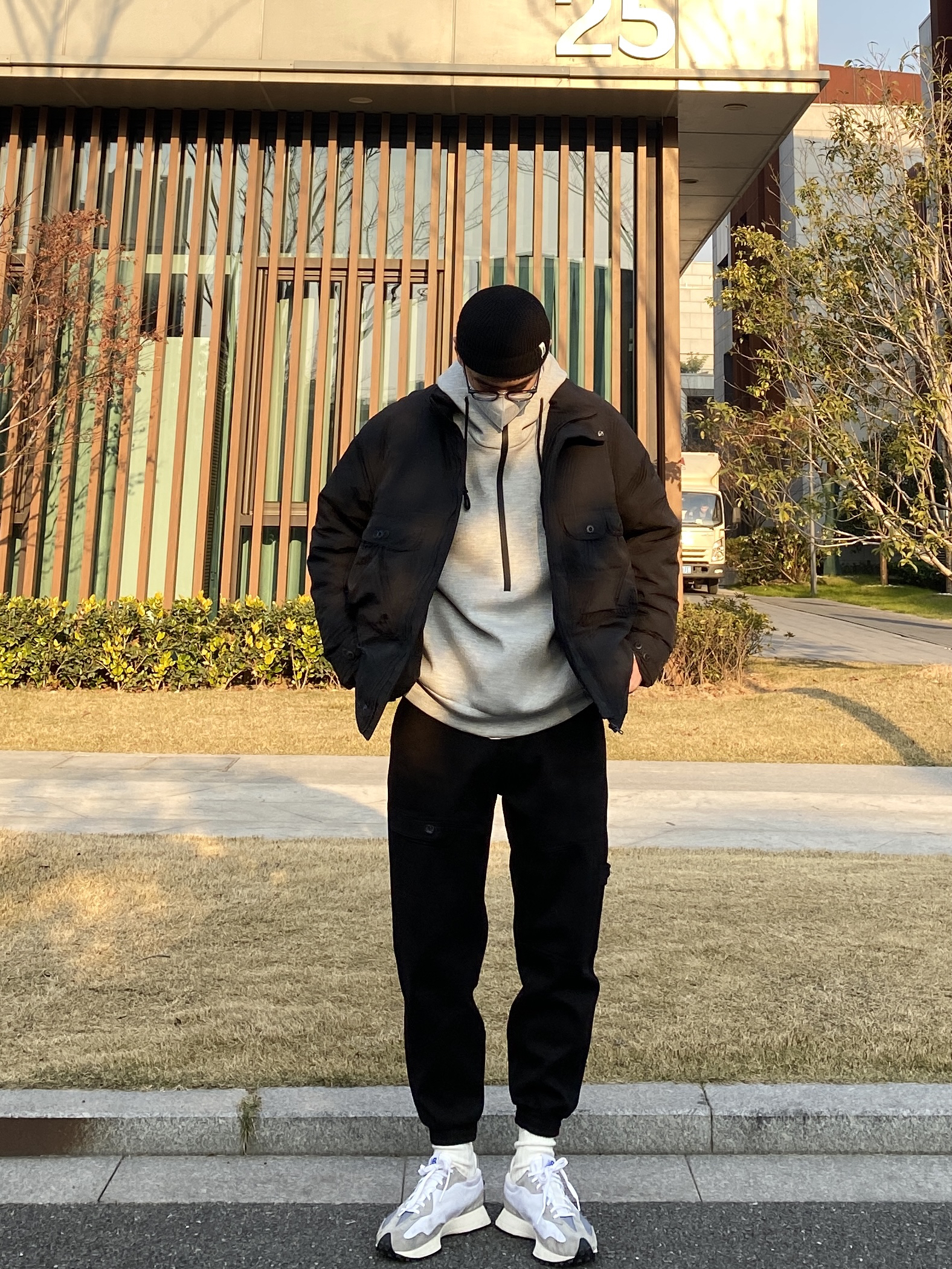 今天这套先用圆领白T做打底,内搭穿一件灰色半拉链太空棉卫衣,裤子选择不挑腿型的直筒束脚工装裤,鞋子上脚百搭又增高的NB327元祖灰,接着套上宽松阔版多口袋立领羽绒服,最后戴一顶黑色线帽呼应下衣服裤子的颜色,OK,出门看看搭配效果吧! - 今日穿搭 衣服裤子:NICE LILI(中间有空格) 鞋子:NB327元祖灰