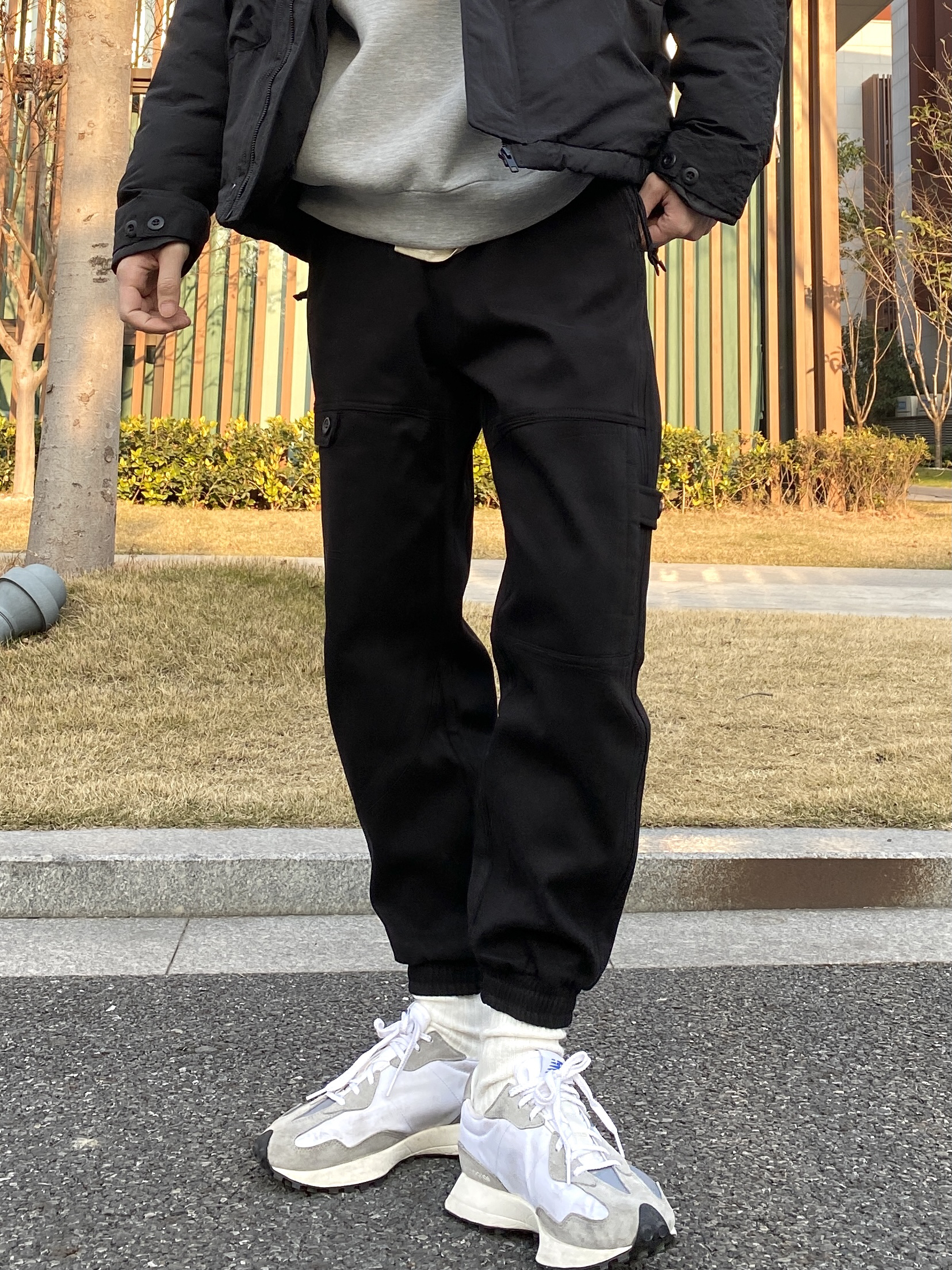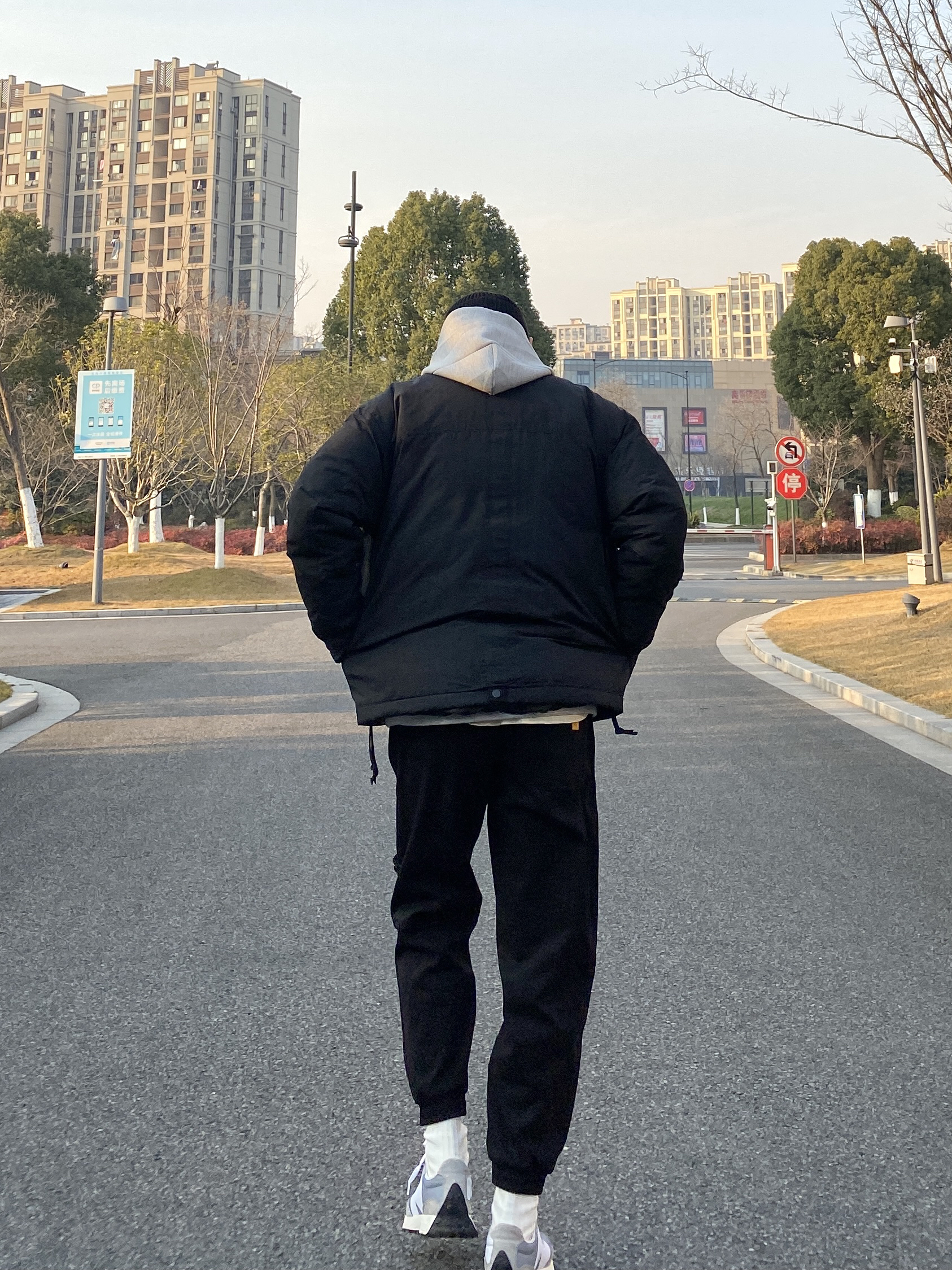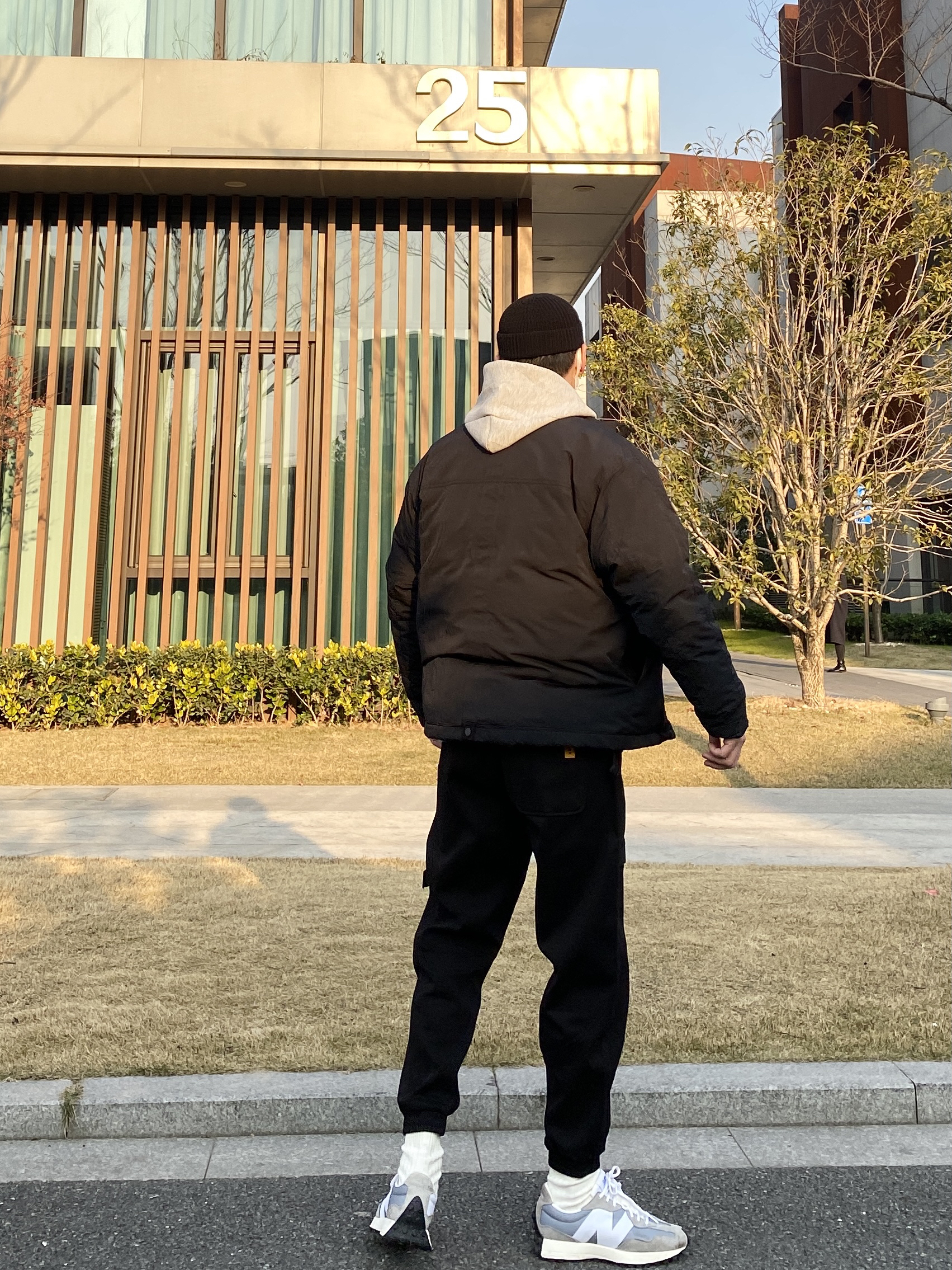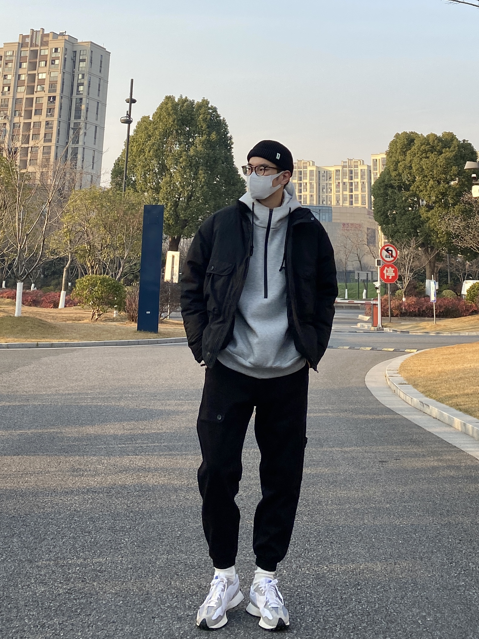 今天这套先用圆领白T做打底,内搭穿一件灰色半拉链太空棉卫衣,裤子选择不挑腿型的直筒束脚工装裤,鞋子上脚百搭又增高的NB327元祖灰,接着套上宽松阔版多口袋立领羽绒服,最后戴一顶黑色线帽呼应下衣服裤子的颜色,OK,出门看看搭配效果吧! - 今日穿搭 衣服裤子:NICE LILI(中间有空格) 鞋子:NB327元祖灰