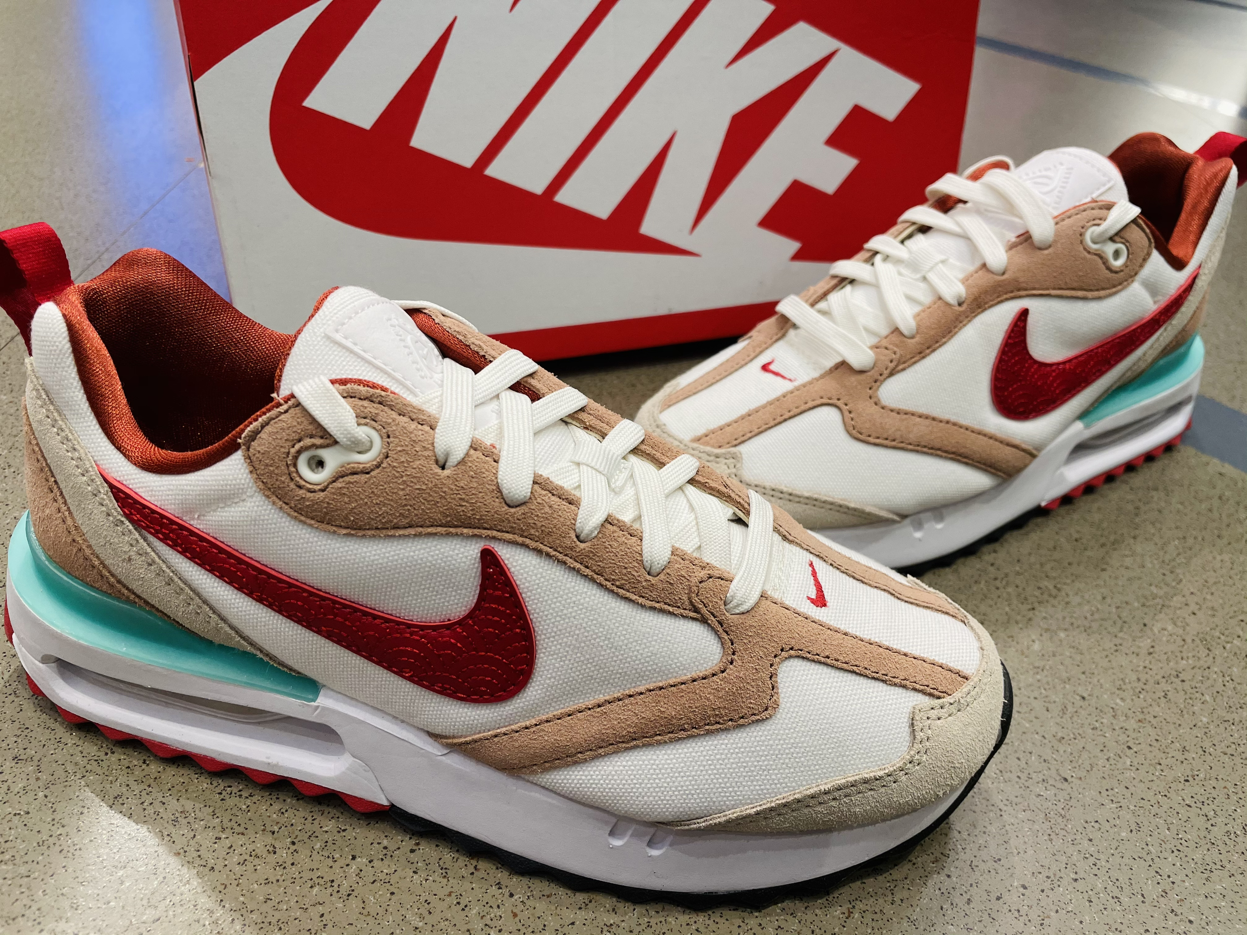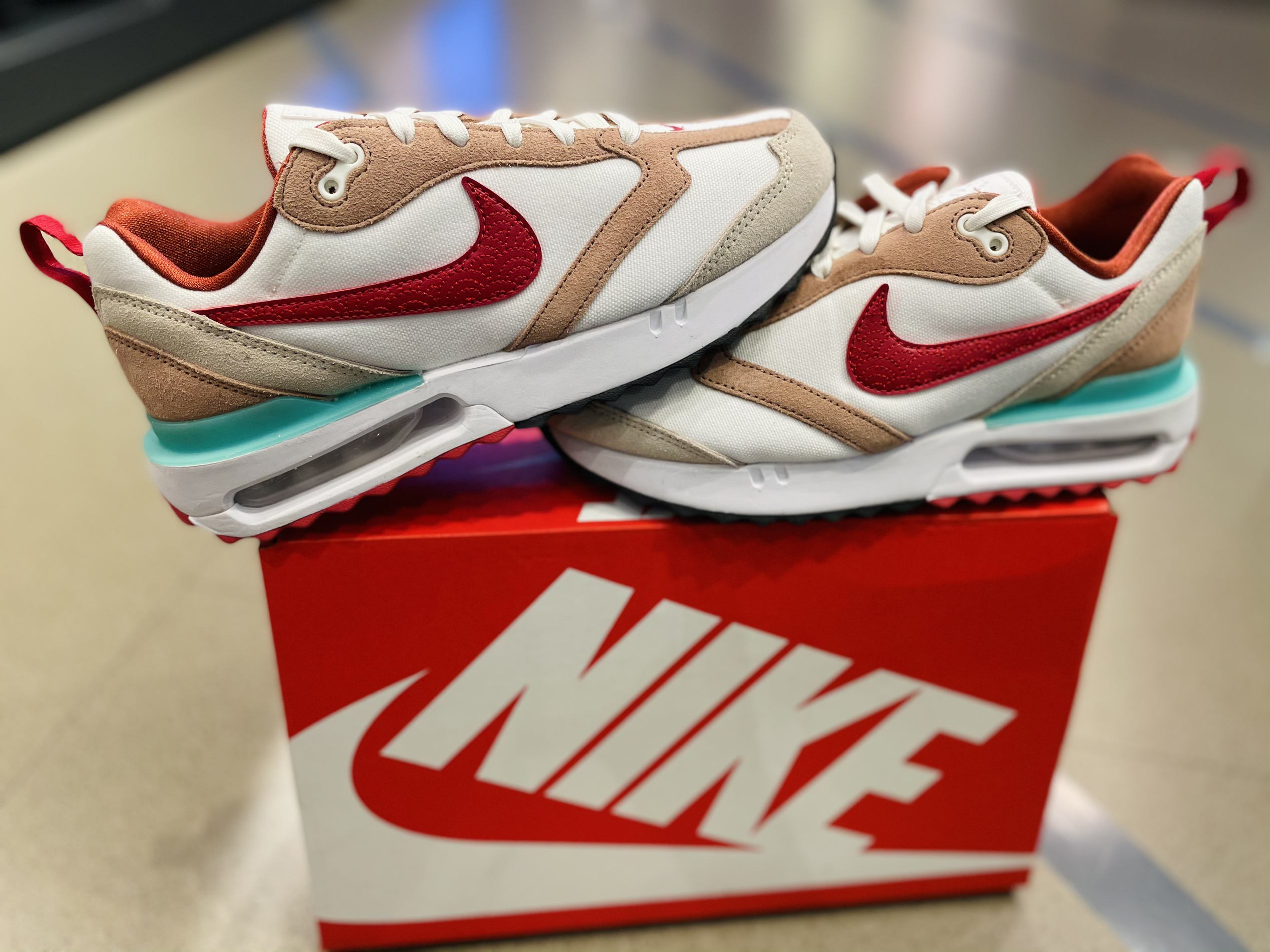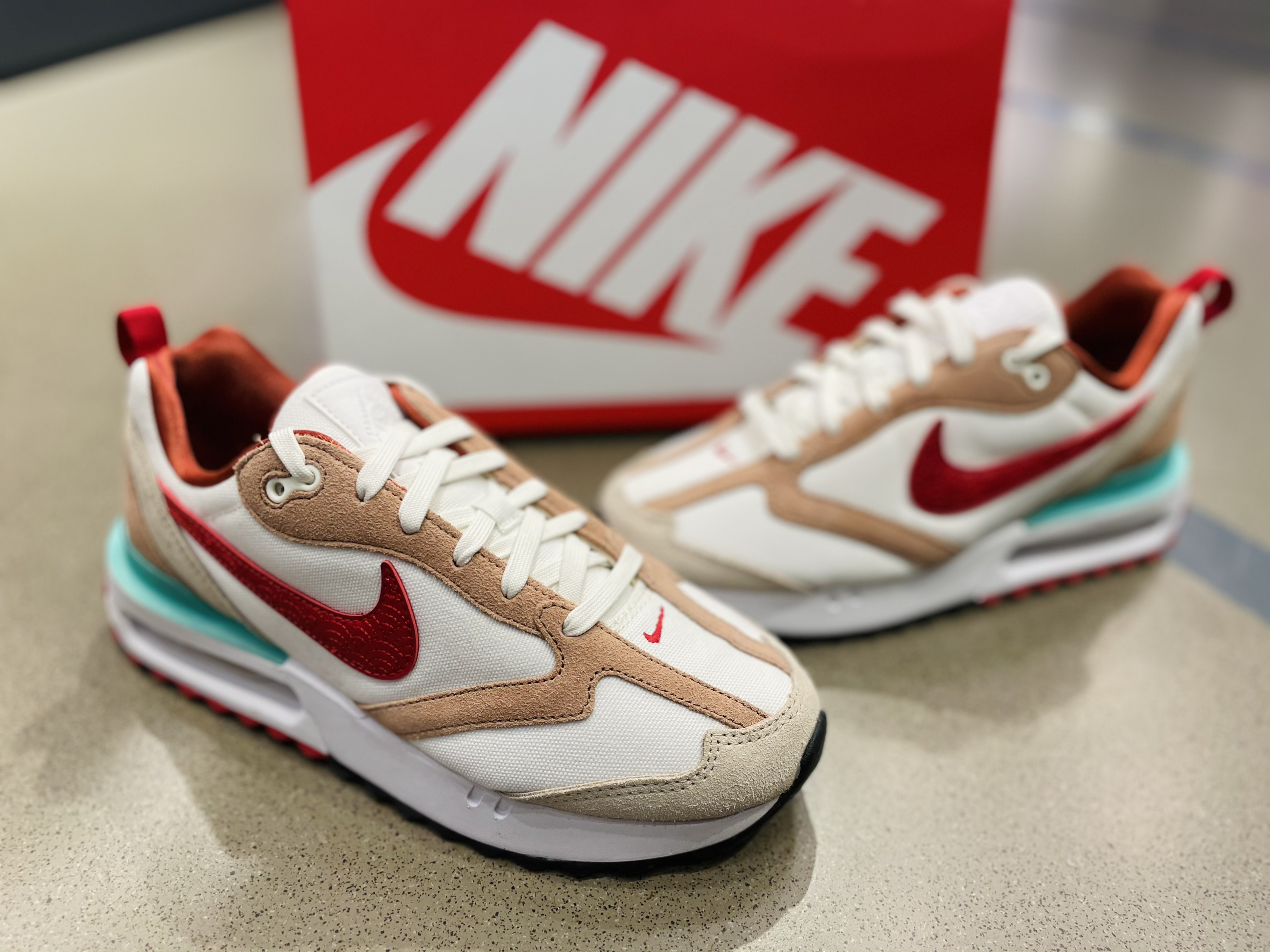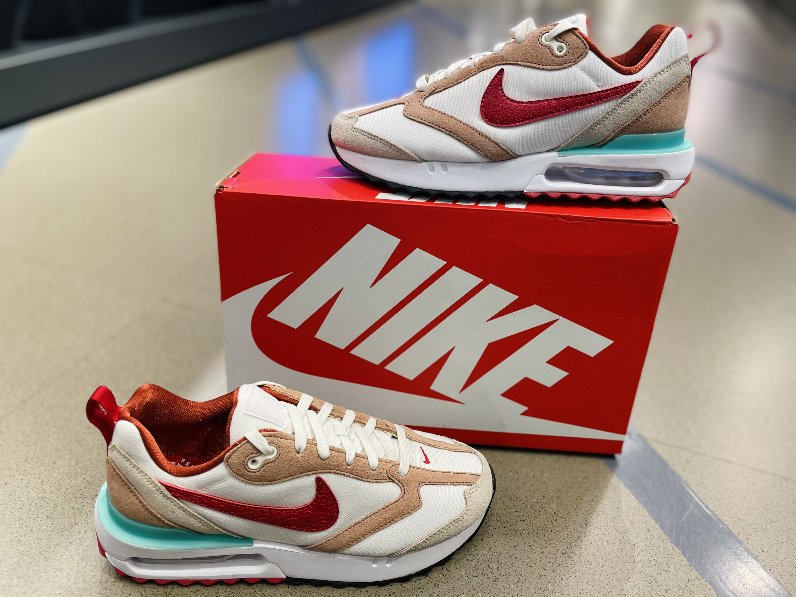 新年穿新鞋: 今日推荐,Nike Air Max Dawn, 这款白红粉配色的运动鞋 可视气垫,洋气时尚。 整体鞋面网眼➕翻毛皮设计。 鞋侧身红色大钩子,浅棕色穿插鞋面。 配色好看呢👀 关键是上脚十分轻盈,鞋子挺轻便。 货号:dq4976-161