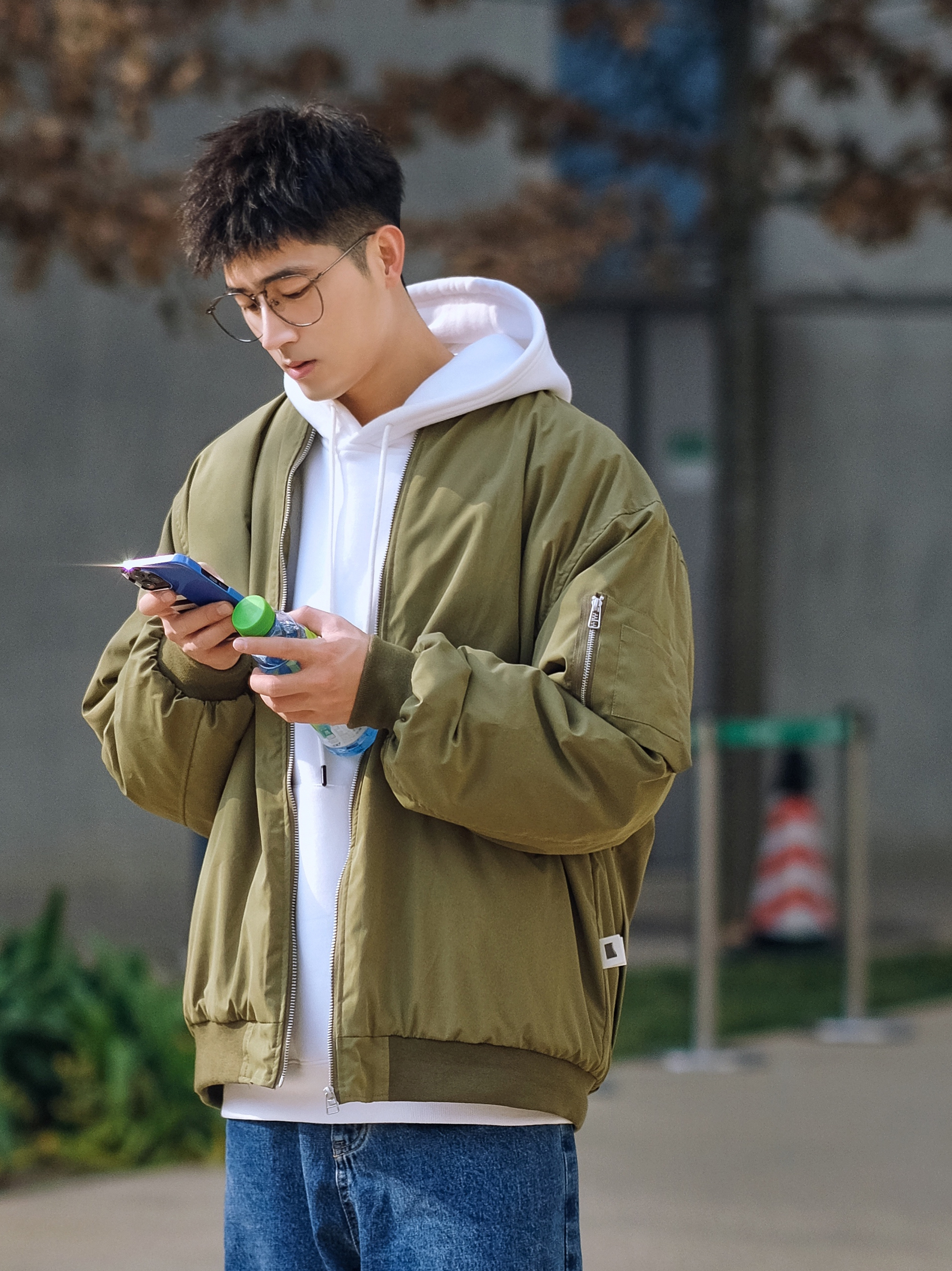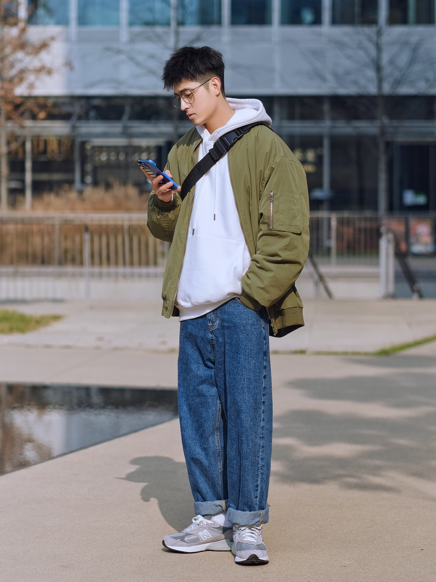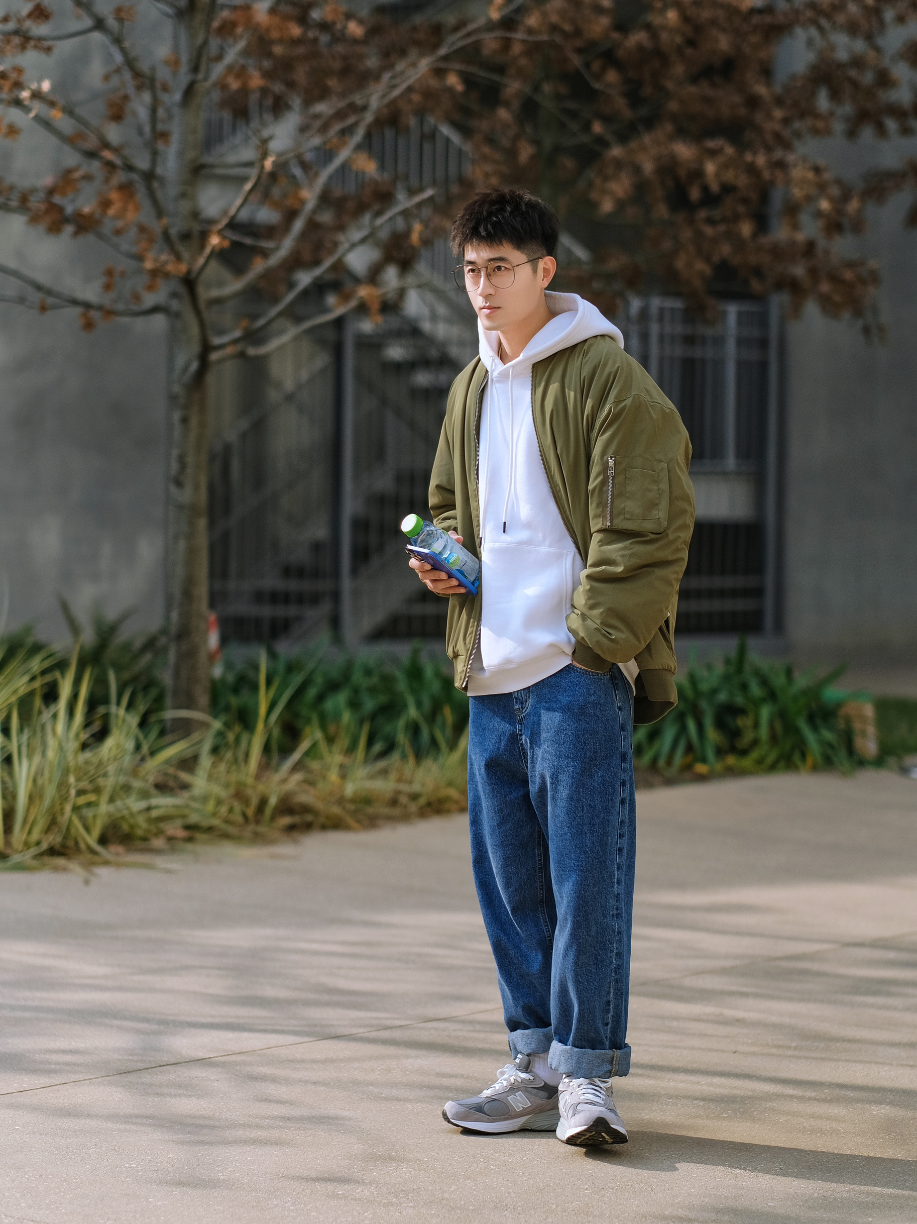 🔹今日份少年感叠穿混搭,选择了军绿色棒球外套,叠穿白色连帽卫衣,上下绿色和蓝色撞色搭配,选择了学院蓝牛仔直筒裤,再来一双复古跑鞋NB993,就可以帅气出街了咯,适合男生冬季穿搭,当然也适合男生新年穿搭。 — ⚠️本人身高|体重:176CM|66KG(🉑️参考) — 👔·军绿色棒球外套—PD大人; 👖·学院蓝牛仔直筒裤—DONTSTOP; 🧦·白袜—LARGEE; 👟·元祖灰复古跑鞋—NB993;