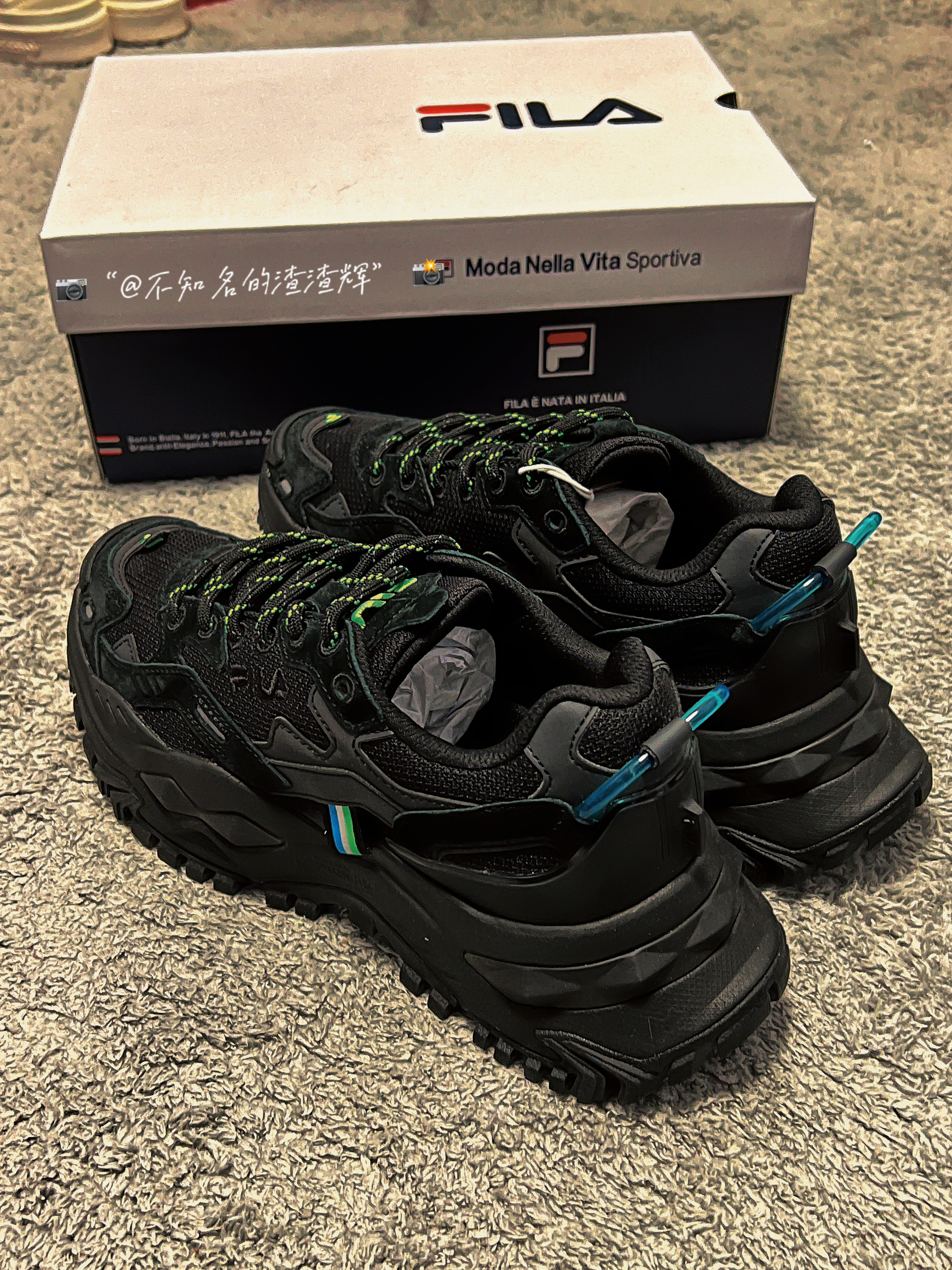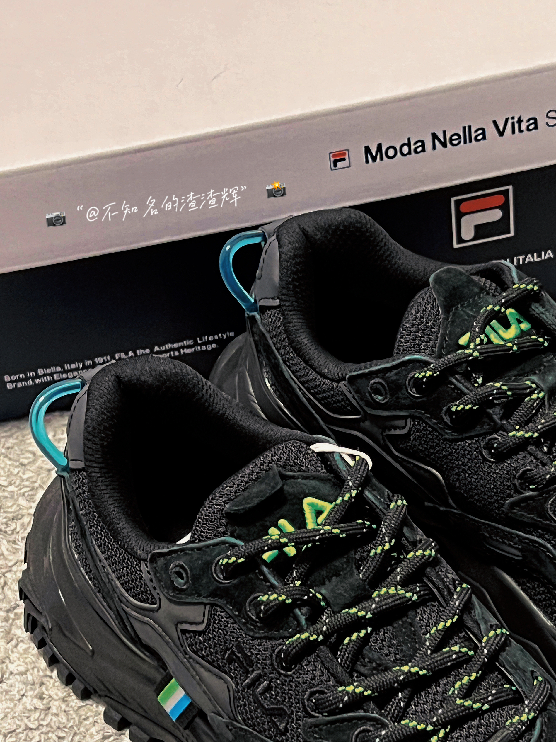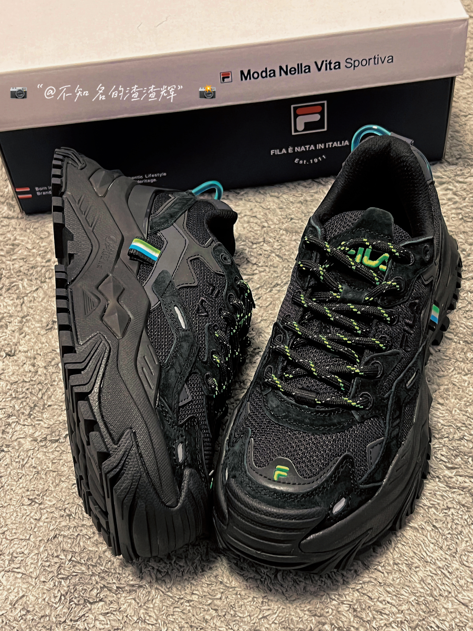 💫:Fila Fusion 斐乐潮牌 拼接硬糖老爹鞋 女款黑色 💫:这双鞋子主要以“黑色”为主,鞋带有着荧光绿色点缀,为鞋子增添了一些色彩感,非常大气耐看的配色,鞋面整体采用细腻绒面革➕网眼织物材质组成,细腻柔软,鞋身还有着“Fila”标志彰显身份,超厚的大底有着一丝镂空效果,增高效果无敌 💫:挺不错的一款老爹鞋,脚感舒适,增高效果明显,而且好搭衣服 💫:尺码推荐:正常尺码