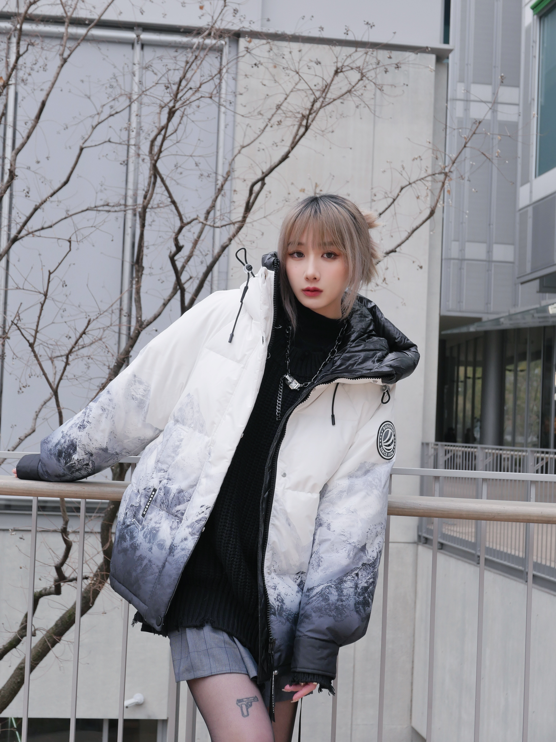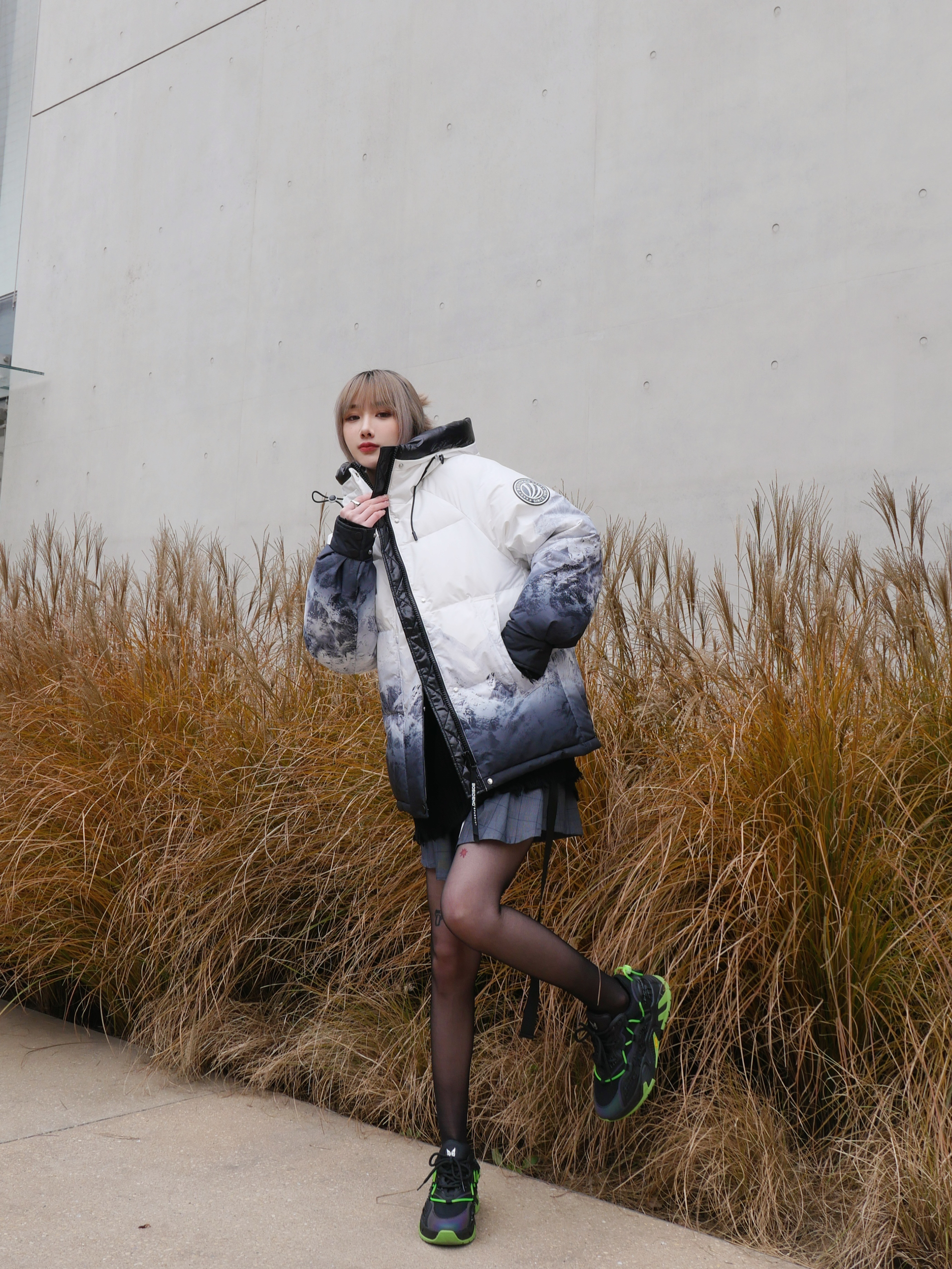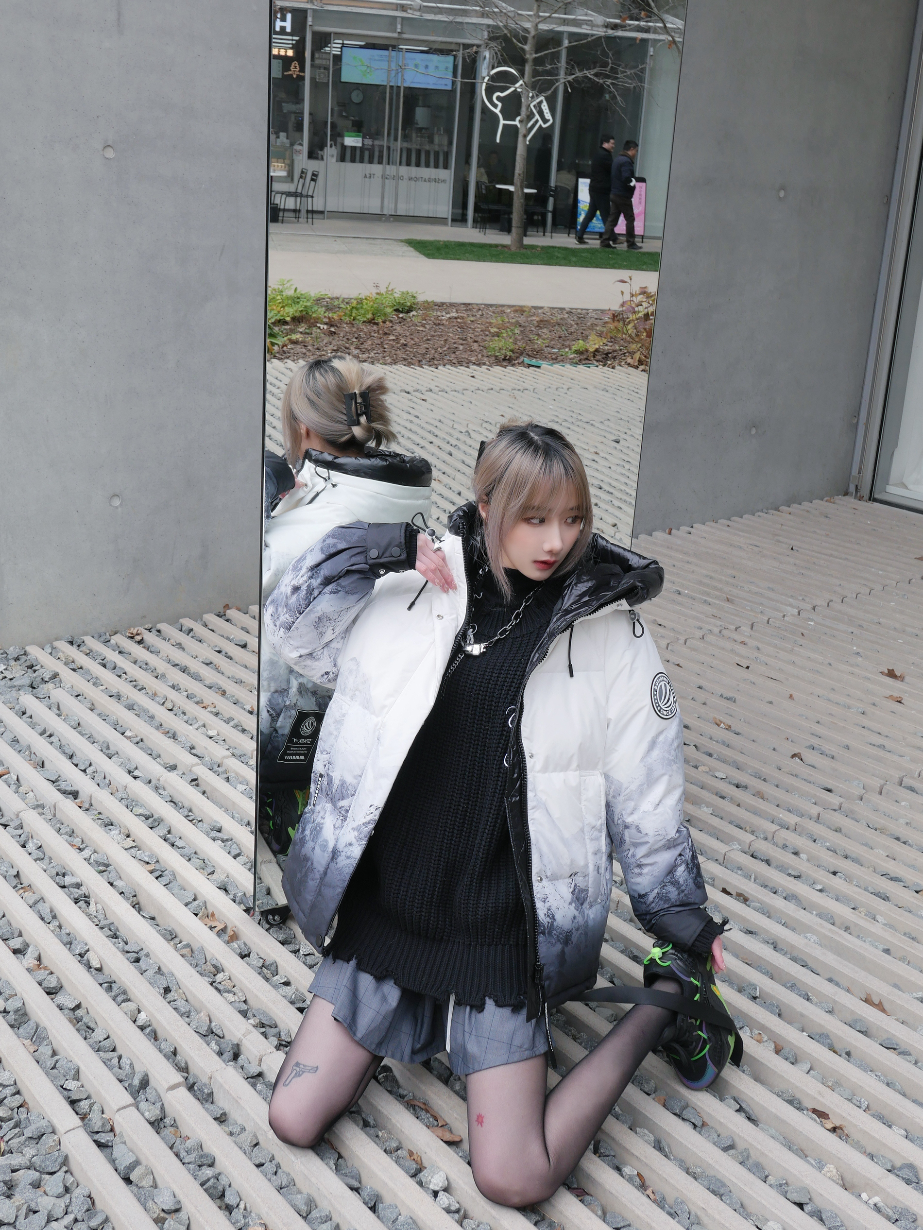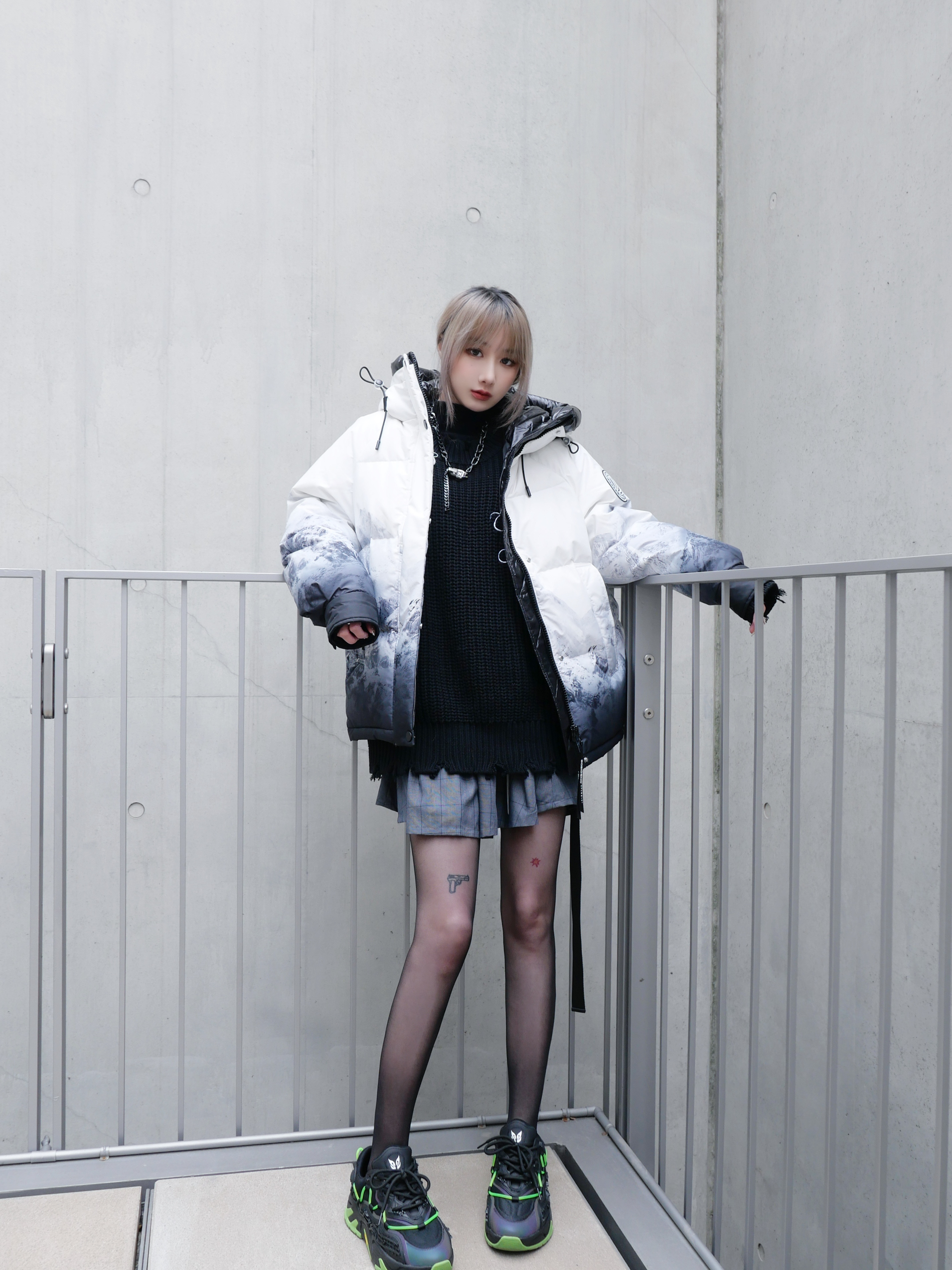 冬天穿搭追求保暖同时也可以时尚感满满呀~ 今天这一整套穿搭就是酷酷女孩儿~ 内搭选择了毛衣,下摆还有不规则的小设计,黑色就是yyds,百搭又时髦~ 外面再套上一件羽绒服,这件衣服颜色挺特别,是渐变冰山印花,帽子是撞色双帽设计,上身效果绝绝子~ 里面填充的的是白鸭绒,保暖指数炒鸡高,下身黑丝配格纹短裙也不用担心会冷! 饰品选择了一款简单风格的项链,简直太🉑️了,又可以炸街啦~