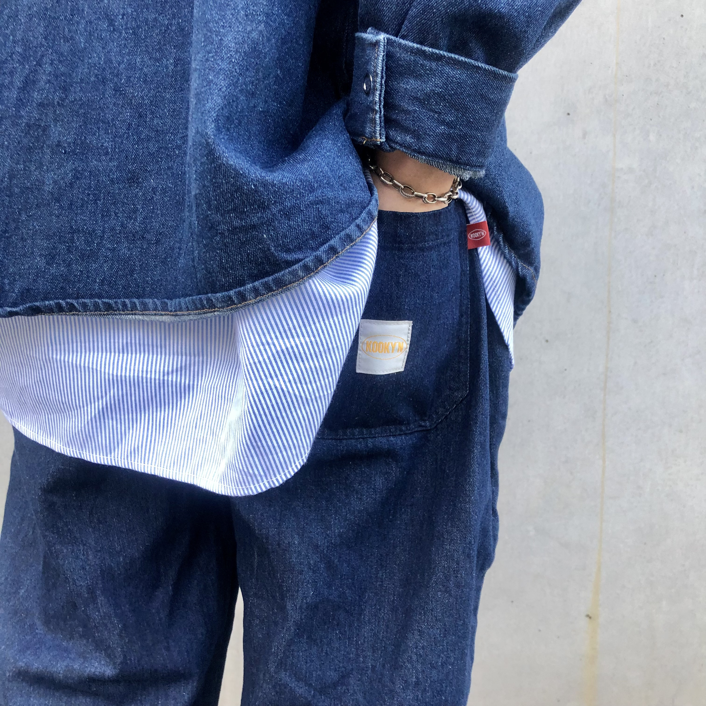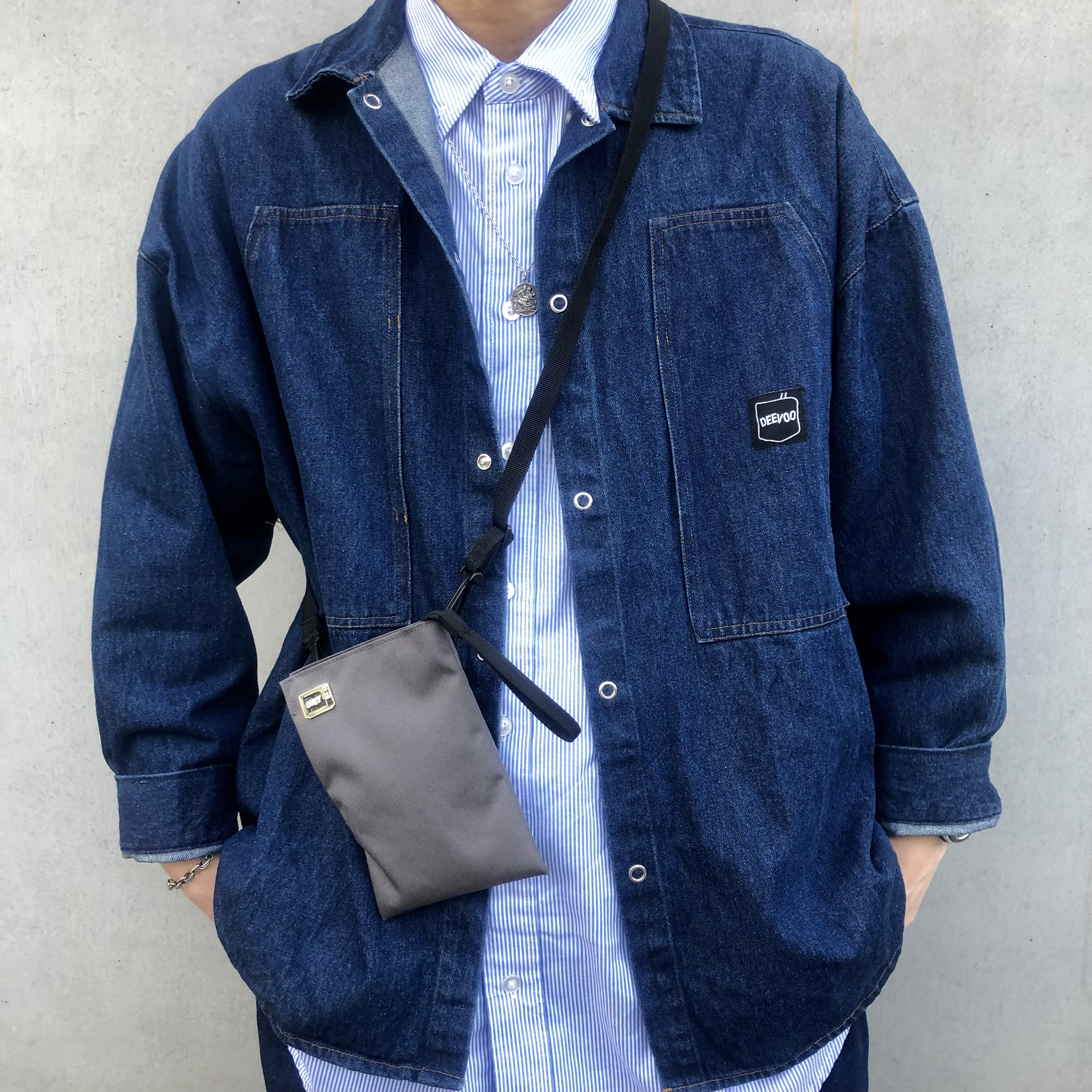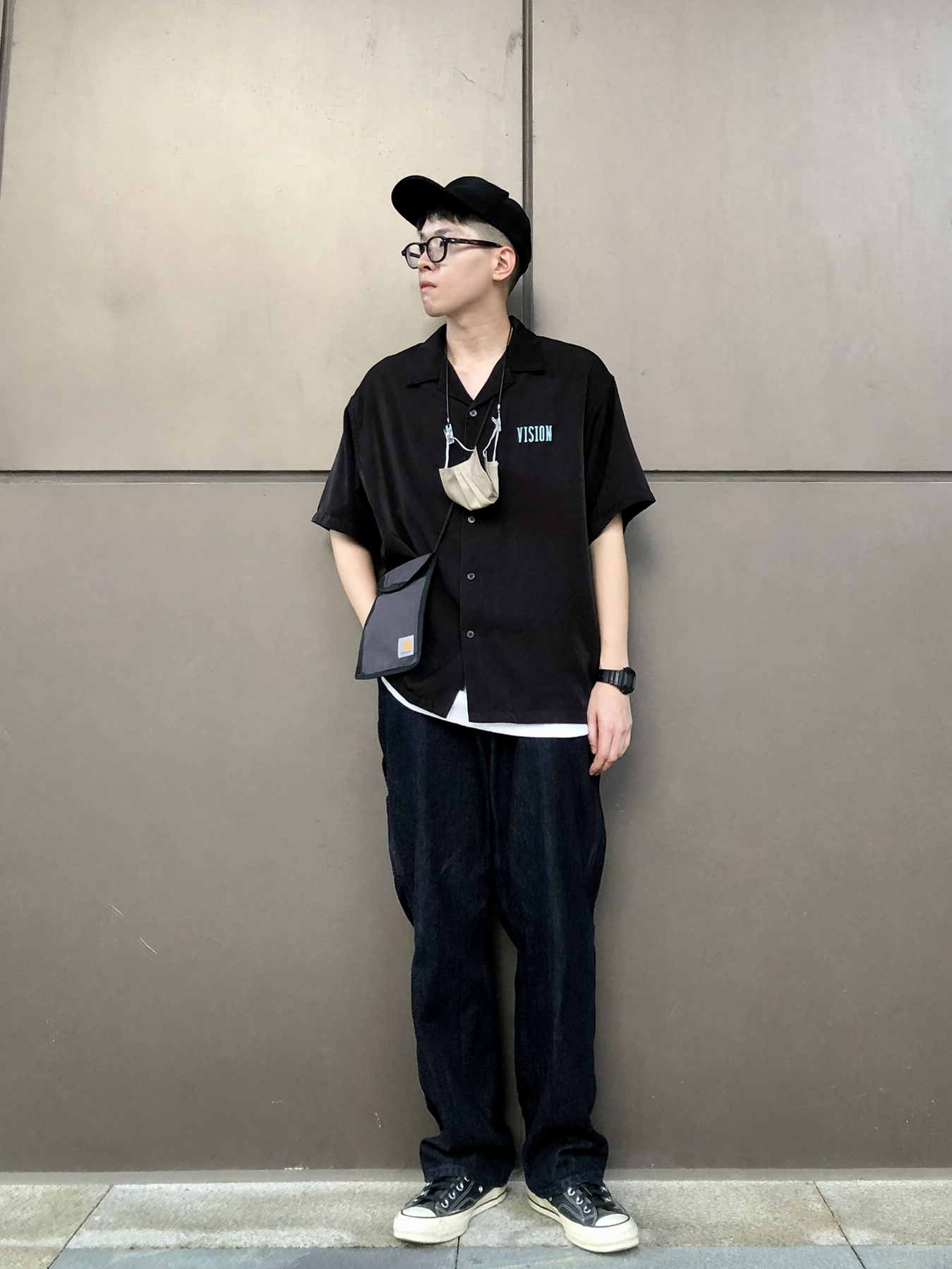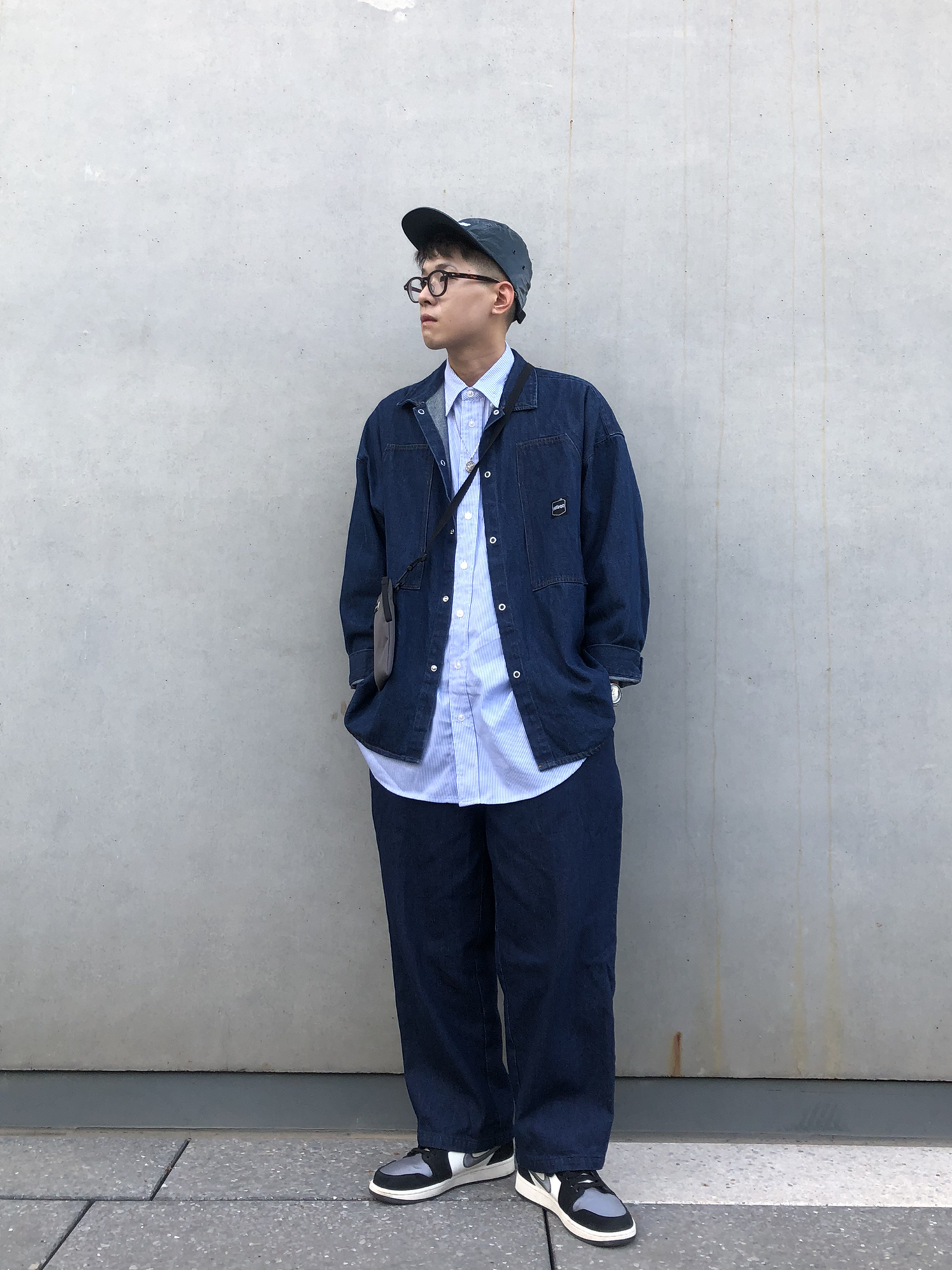 牛仔夹克和牛仔裤一起搭配,但又不想全身大面积全是牛仔元素这样会有点偏向深沉的机车风格。于是加入同样是大廓形的条纹衬衫作为内搭不扣纽扣露出衬衫圆弧下摆,增加了休闲随性的感觉以及视觉上的层次感。 直接穿上同样宽松的牛仔裤,裤脚够宽且长度刚好可以盖住中邦AJ1的一半,这样搭配AJ1非常合适,再配上五片帽,小挎包,街头的味道就有了。