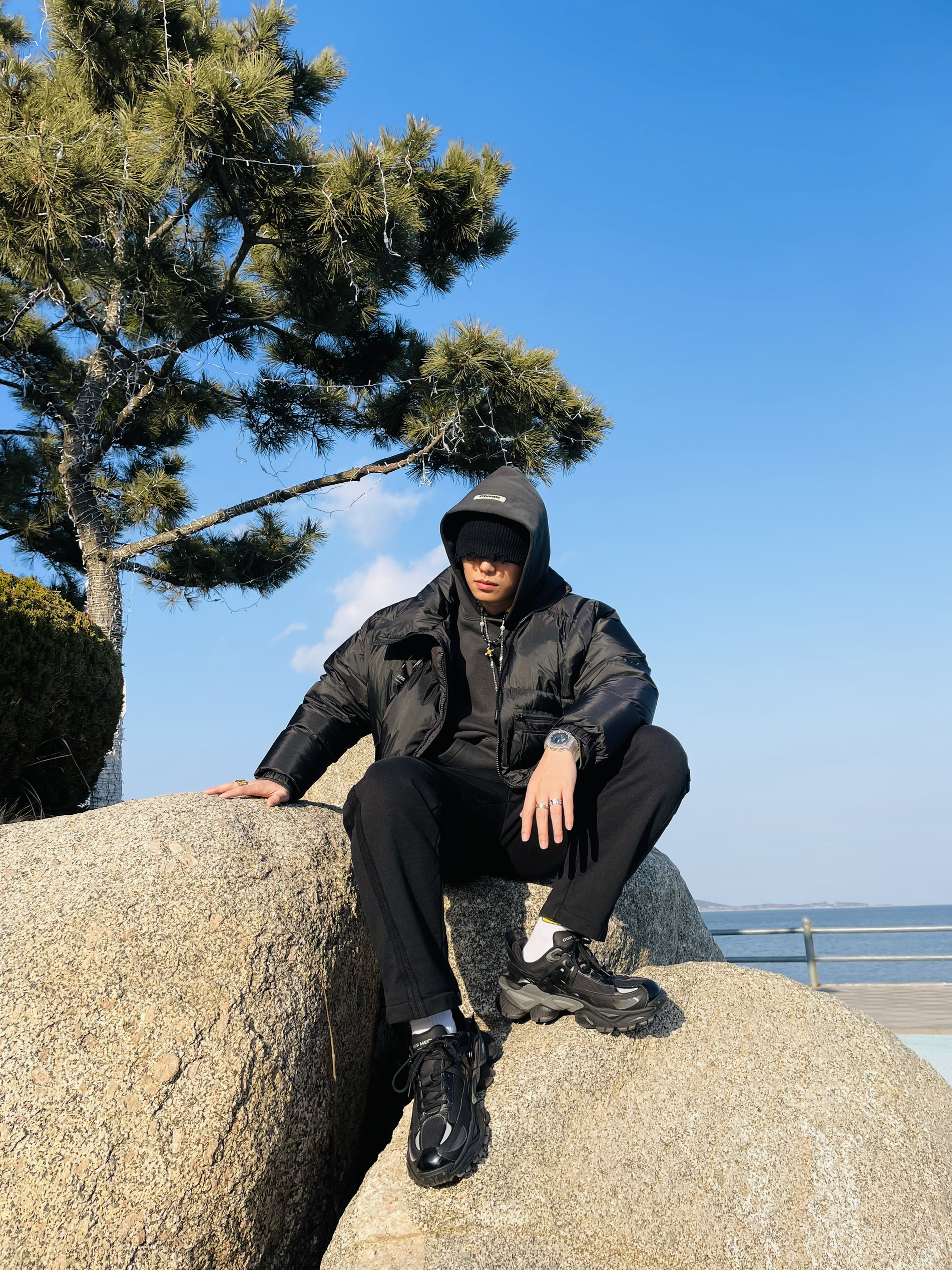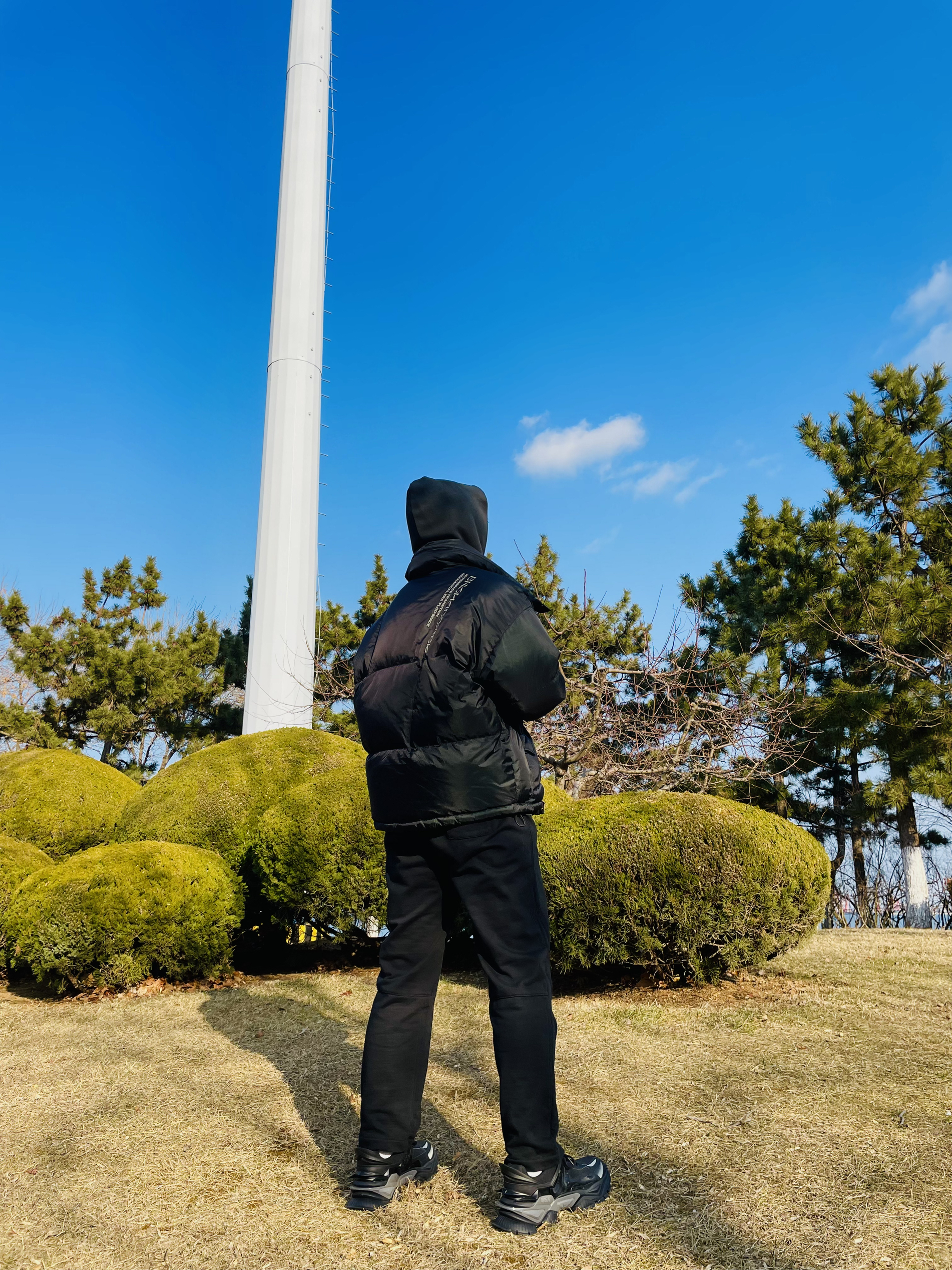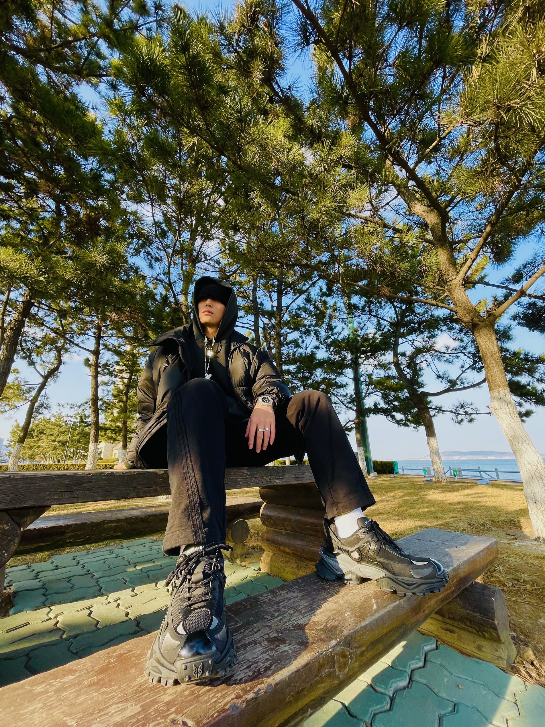 强烈建议大家不要买Canada Goose! 因为他太 保 暖 啦! 北纬37度穿着他简直像夏天 我还是老老实实选个薄外套吧 OOTD TIPS 抛开Canada Goose今天这套海边穿搭走一波vibe风 🌒整体上都是选择宽松的款式,ESSENTIAL的卫衣和毛圈直筒长裤完美融合; 🌓鞋子就要霸道一点,机甲风的设计也很容易在一身黑中凸显出来; 🌔配饰方面就应景一下...