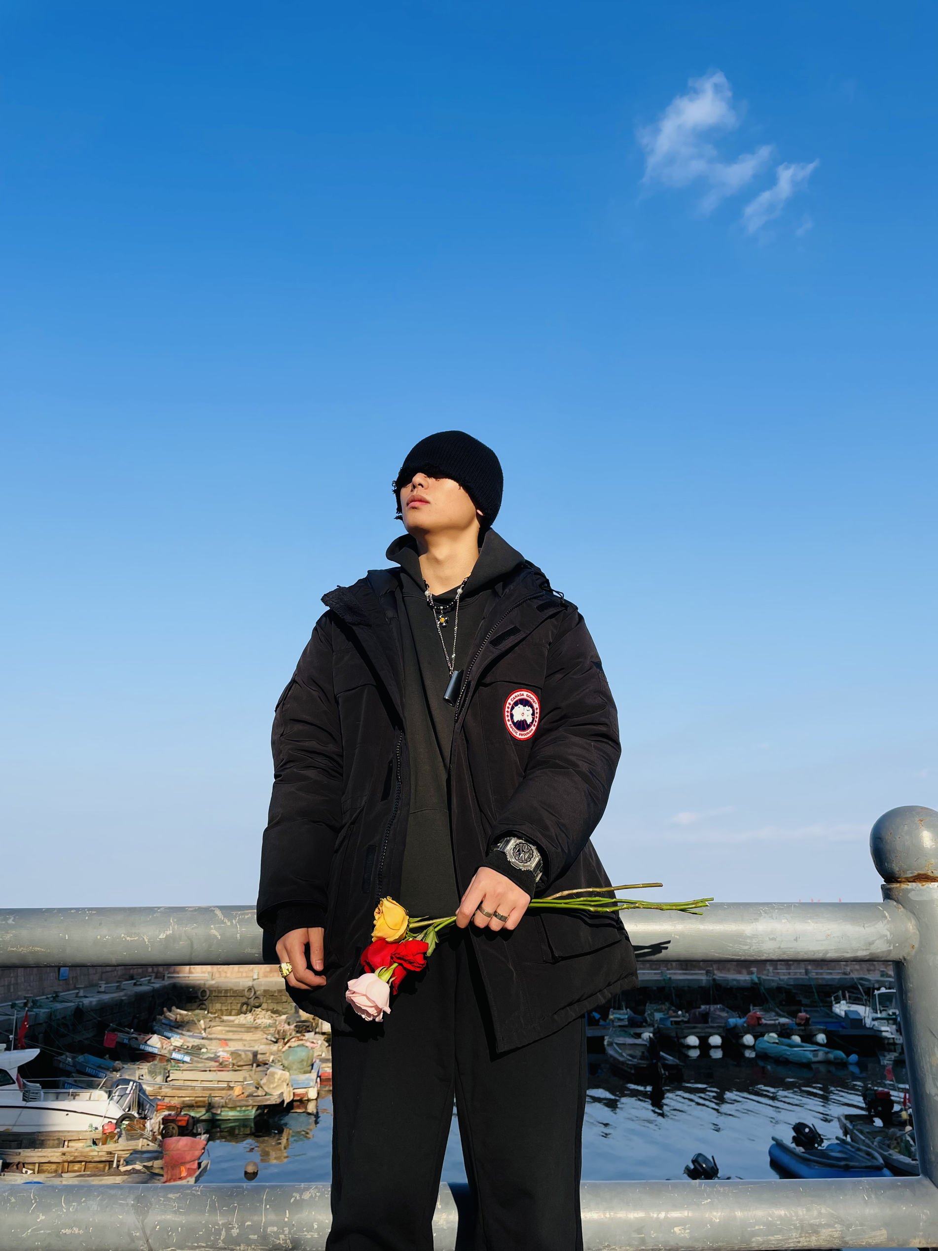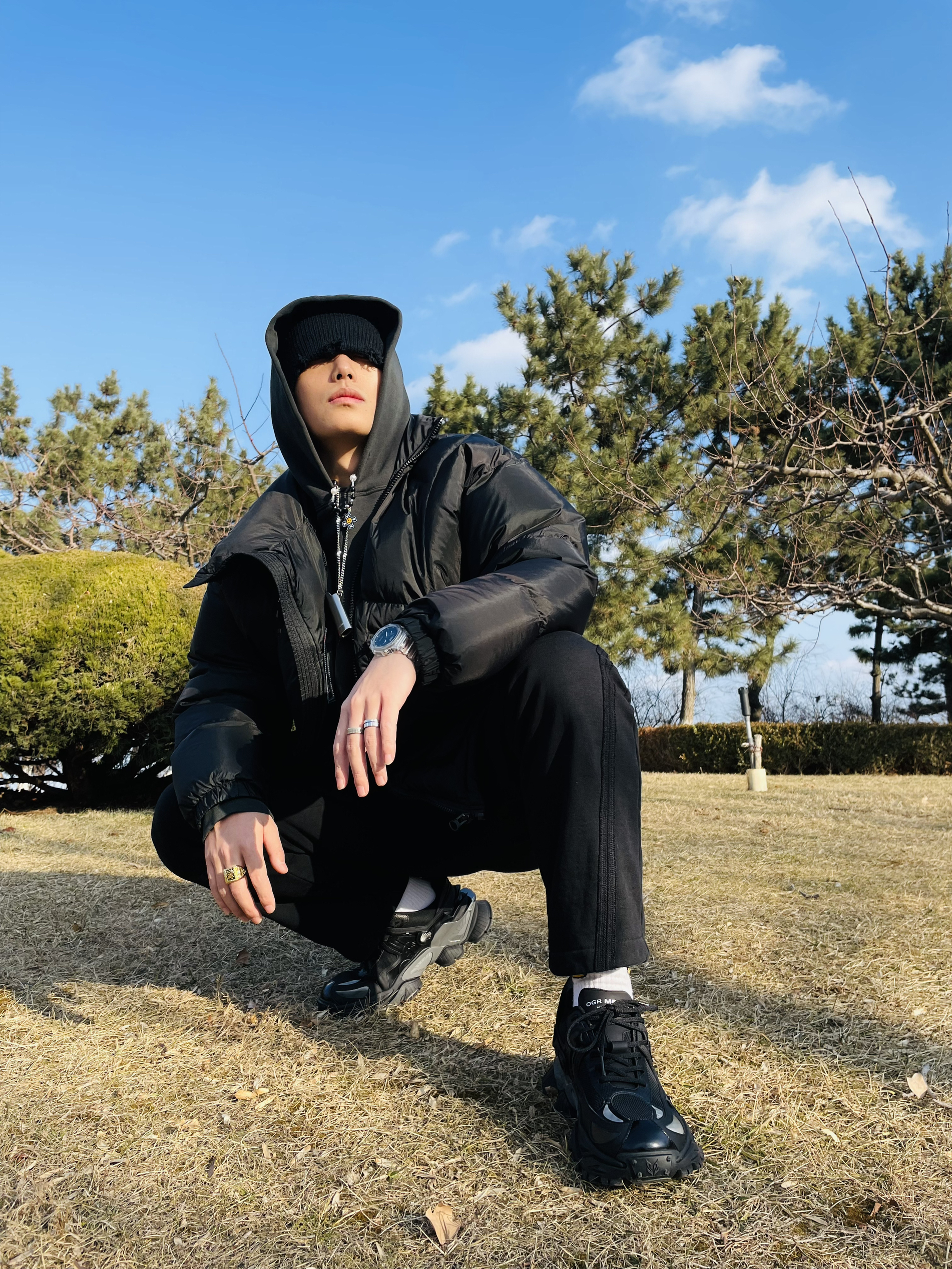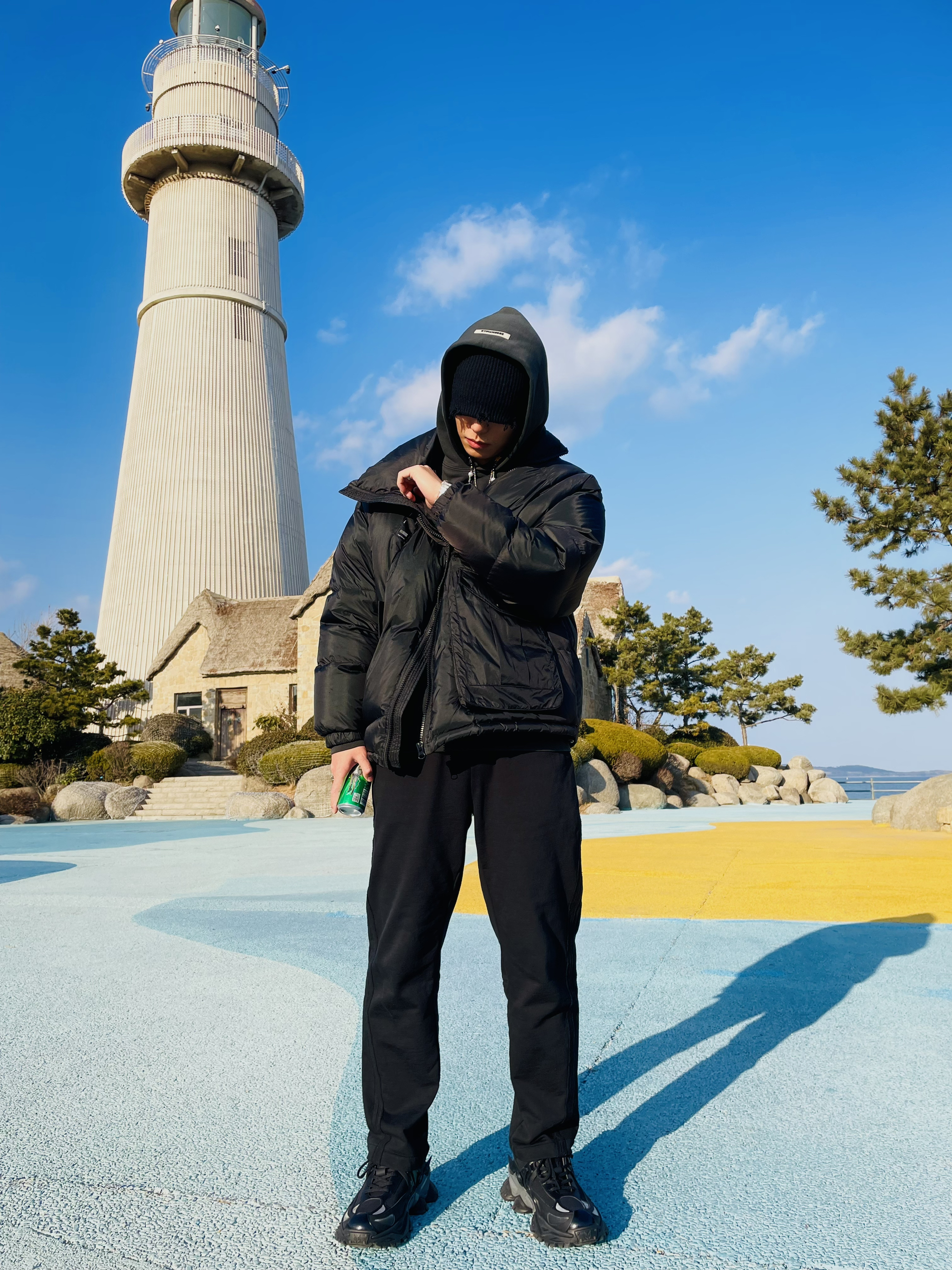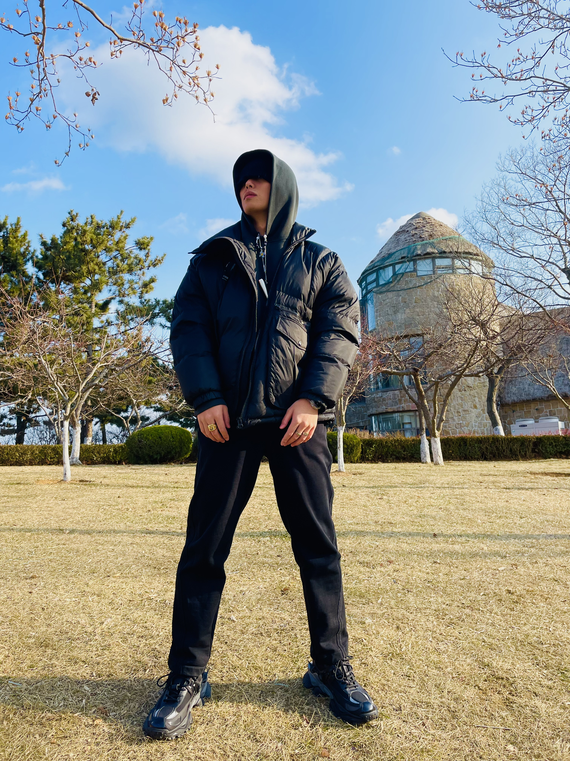 强烈建议大家不要买Canada Goose! 因为他太 保 暖 啦! 北纬37度穿着他简直像夏天 我还是老老实实选个薄外套吧 OOTD TIPS 抛开Canada Goose今天这套海边穿搭走一波vibe风 🌒整体上都是选择宽松的款式,ESSENTIAL的卫衣和毛圈直筒长裤完美融合; 🌓鞋子就要霸道一点,机甲风的设计也很容易在一身黑中凸显出来; 🌔配饰方面就应景一下...