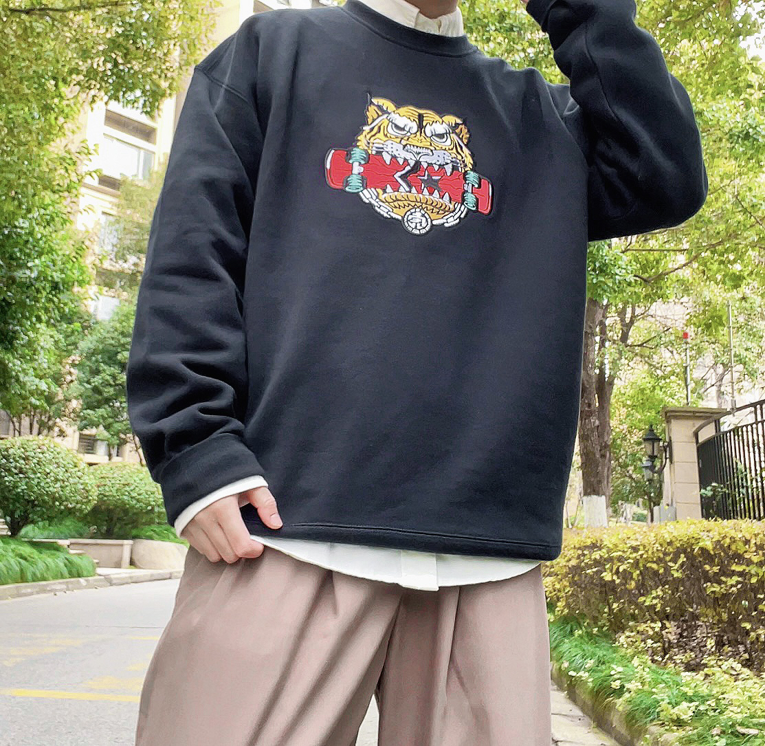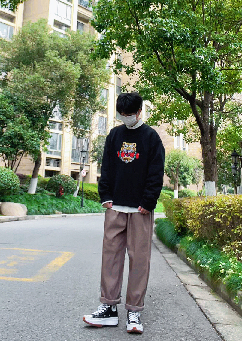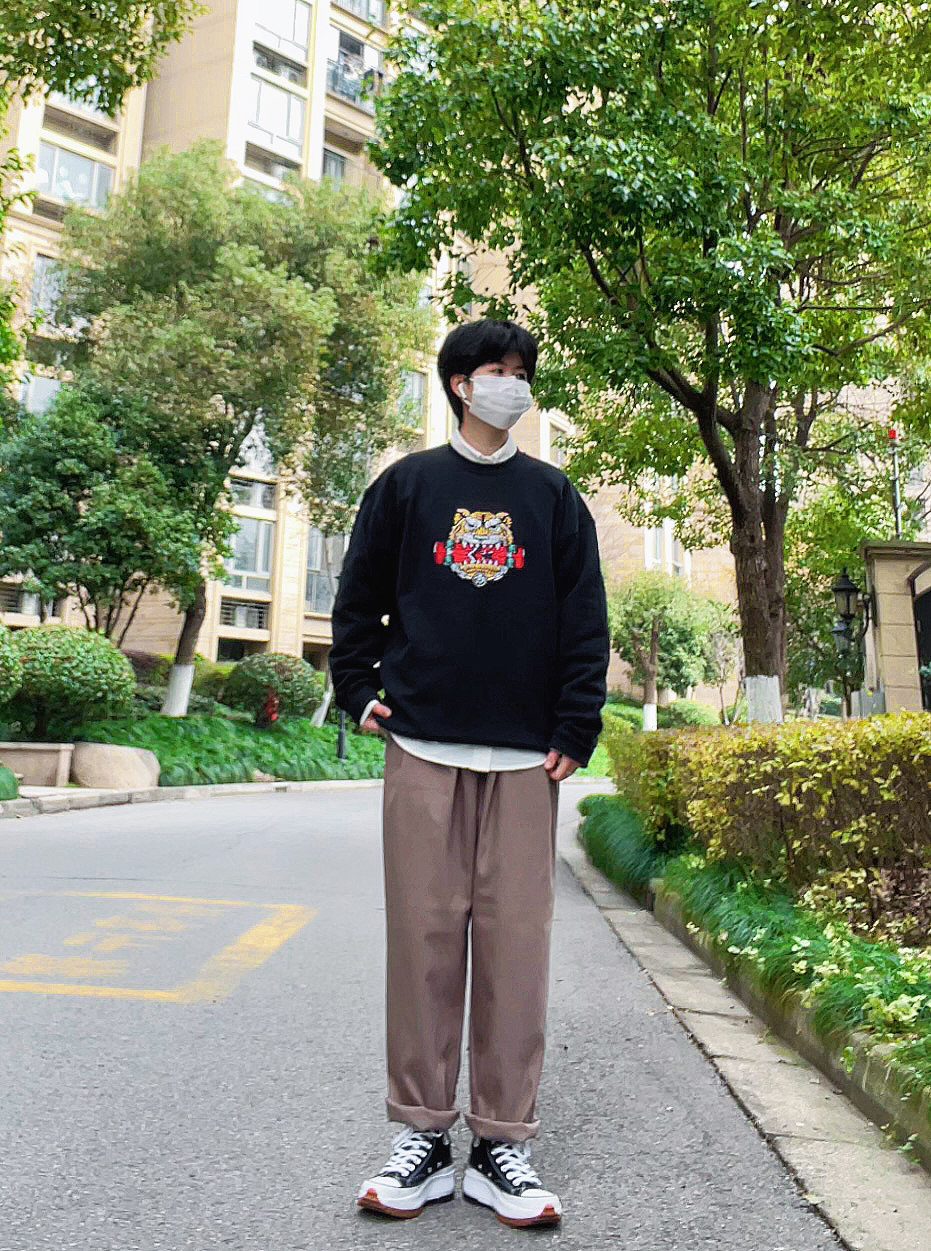 今年是虎年看看我为自己准备了什么礼物吧 在匡威🍑新入手的黑色虎头卫衣很有质感 图案设计很有个性 一眼就看中了 加绒的内里也很保暖 黑色也是很百搭的色系 和棕色裤子搭配是很休闲的一套 冬天的话再套一件厚的外套就可以 很nice的单品 穿上效果简直美呆了,我妈看了直夸我 情侣👫同款 无性别穿搭