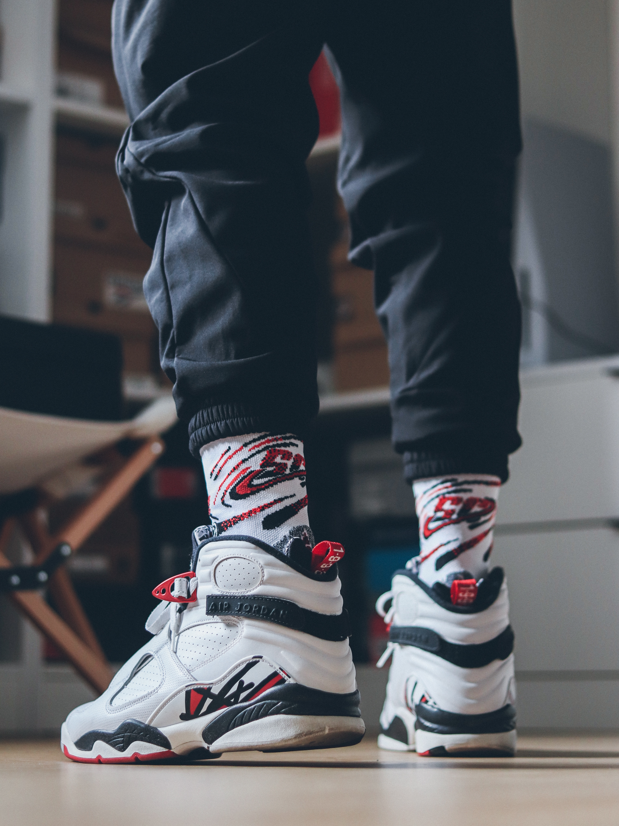 再过几个多礼拜就过年啦,又到了每年穿红色儿最名正言顺的时候。白红色可能是我脚上出现的最多的配色了,干干净净经典又不会太张扬。这双AJ8就像他的名字一样,其实是那双兔八哥的另一个备选方案。相比那双原色拿走了灰色,而更多使用黑色,这不正合我的胃口哈哈。过年走亲戚就这么穿了!