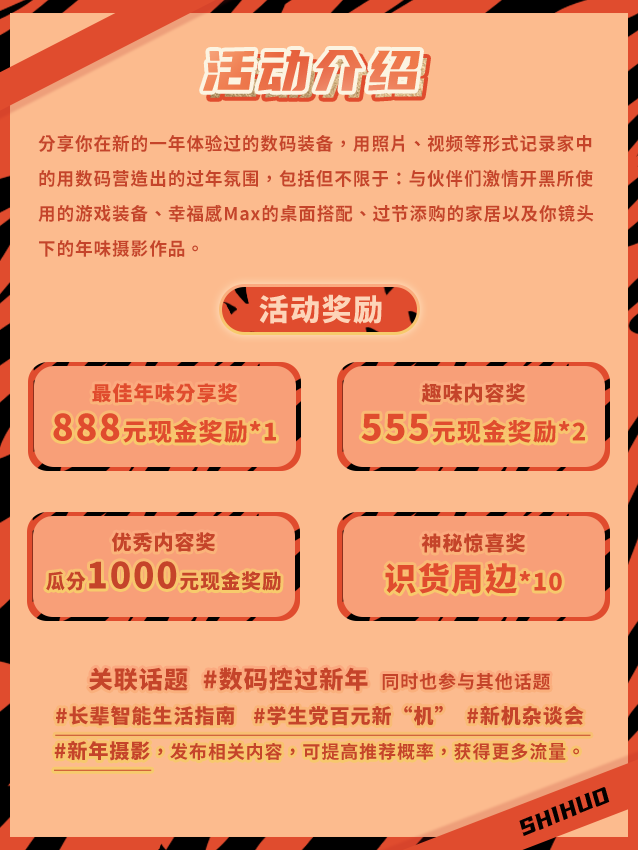分享你在新的一年体验过的数码装备,用照片、视频等形式记录家中的用数码营造出的过年氛围,包括但不限于:与伙伴们激情开黑所使用的游戏装备、幸福感Max的桌面搭配、过节添购的家居,以及你镜头下年味摄影作品。 🎁活动奖励 ①最佳年味分享奖:888元现金奖励*1 ②趣味内容奖:555元现金奖励*2 ③优秀内容奖:瓜分1000元现金奖励(点赞评论收藏数据总和TOP20) ④神秘惊喜奖: 👉🏻精选...