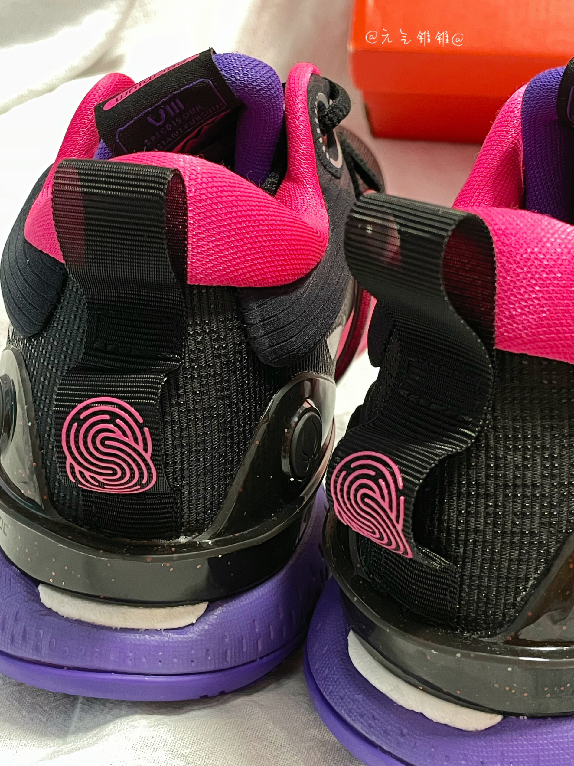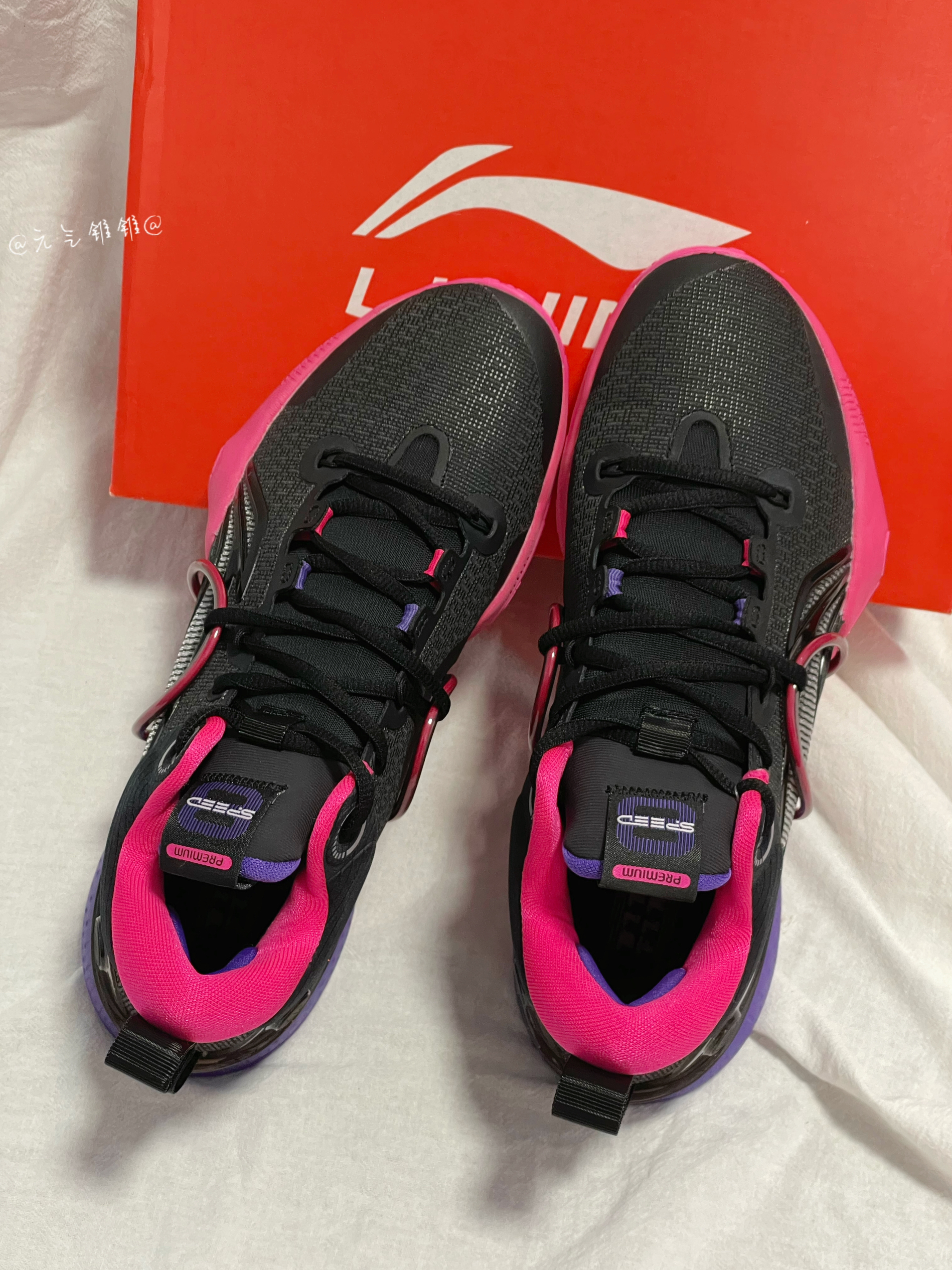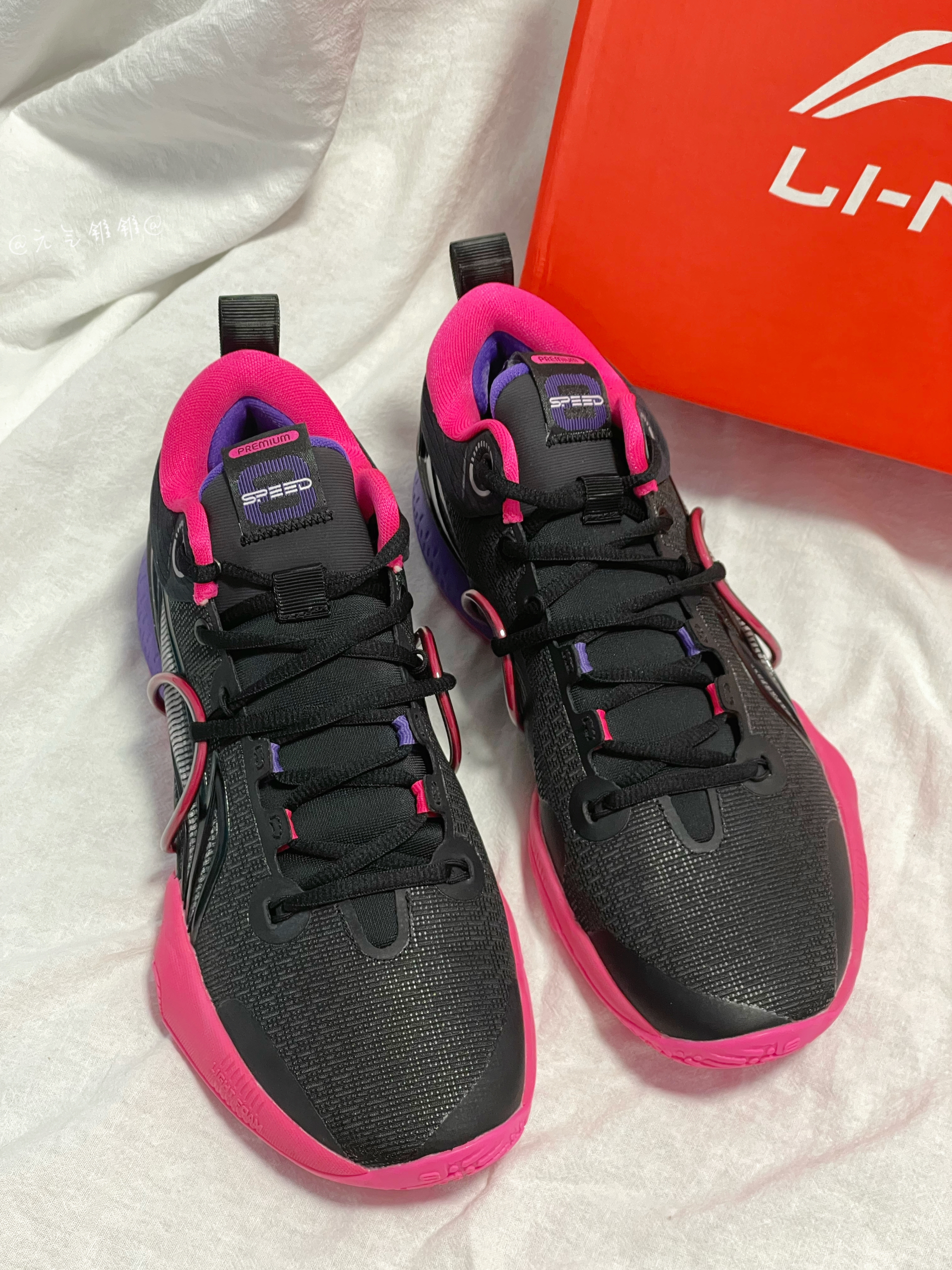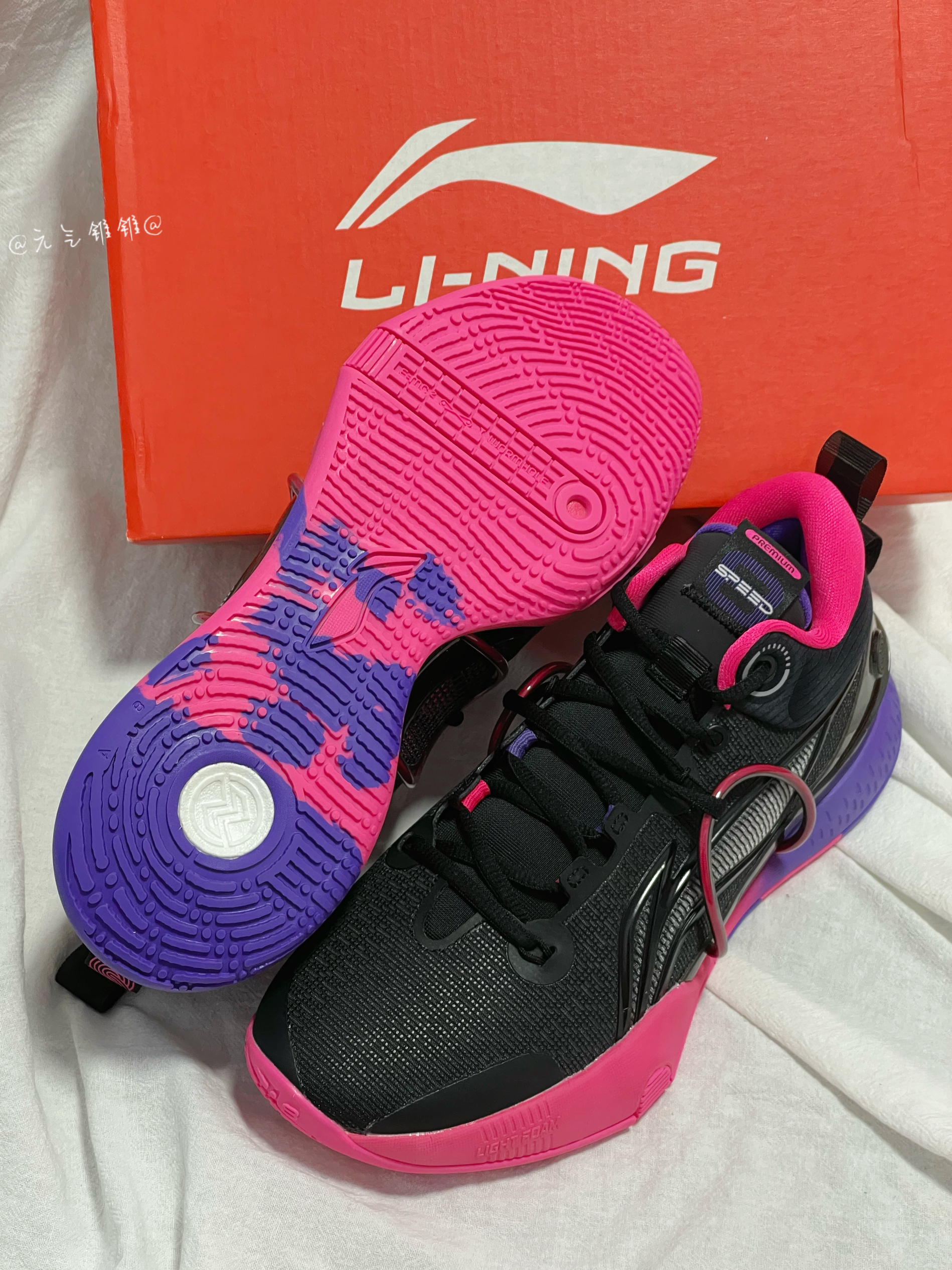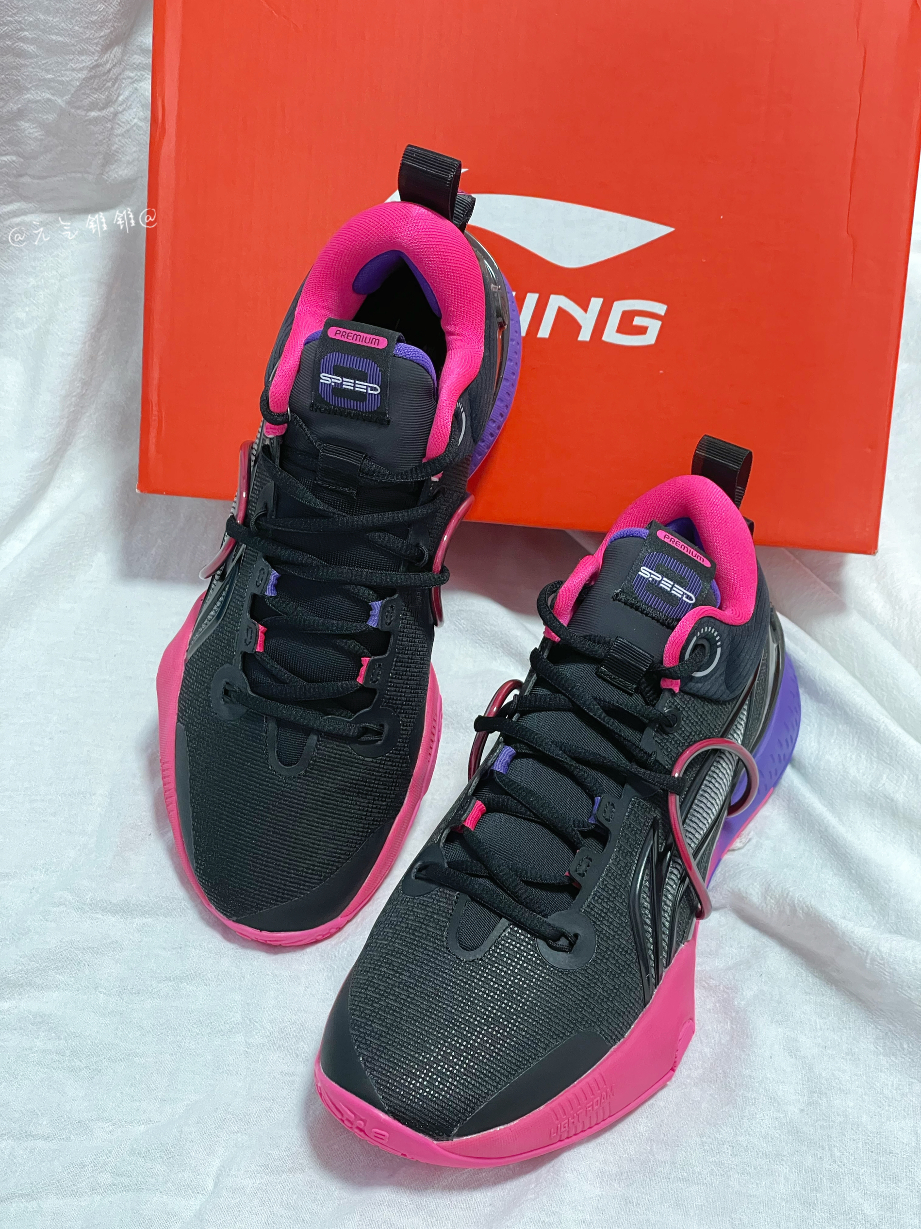 LiNing李宁 闪击8 Premium 䨻科技减震防滑篮球鞋 黑粉 日落 闪击8系列最耐脏的配色,低调好看不用担心打理鞋身采用黑色为主,紫/粉点缀,鞋面织物面料提供好的包裹性,更加稳固,同时保持舒适和安全,,全掌Light Foam缓震科技有效降低中底重量提升稳定性,后掌搭载李宁䨻回弹,优异的回弹和缓震性能,鞋身轻量化,全面释放速度,橡胶大底搭配多纹路设计耐磨,稳定又防滑,做到急跳急停,鞋面多...