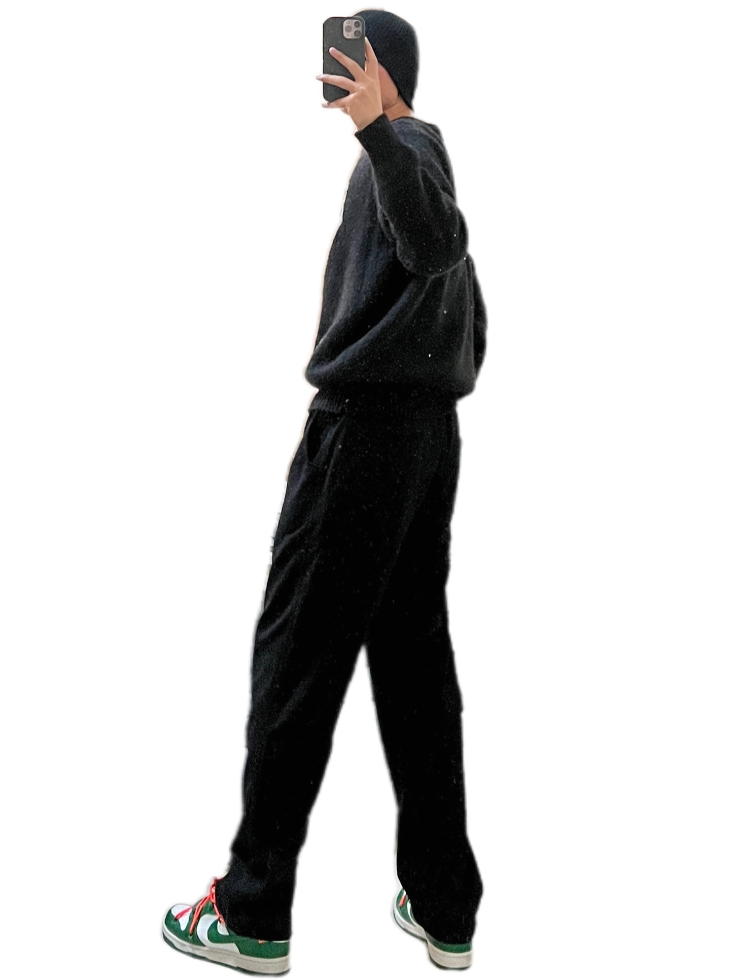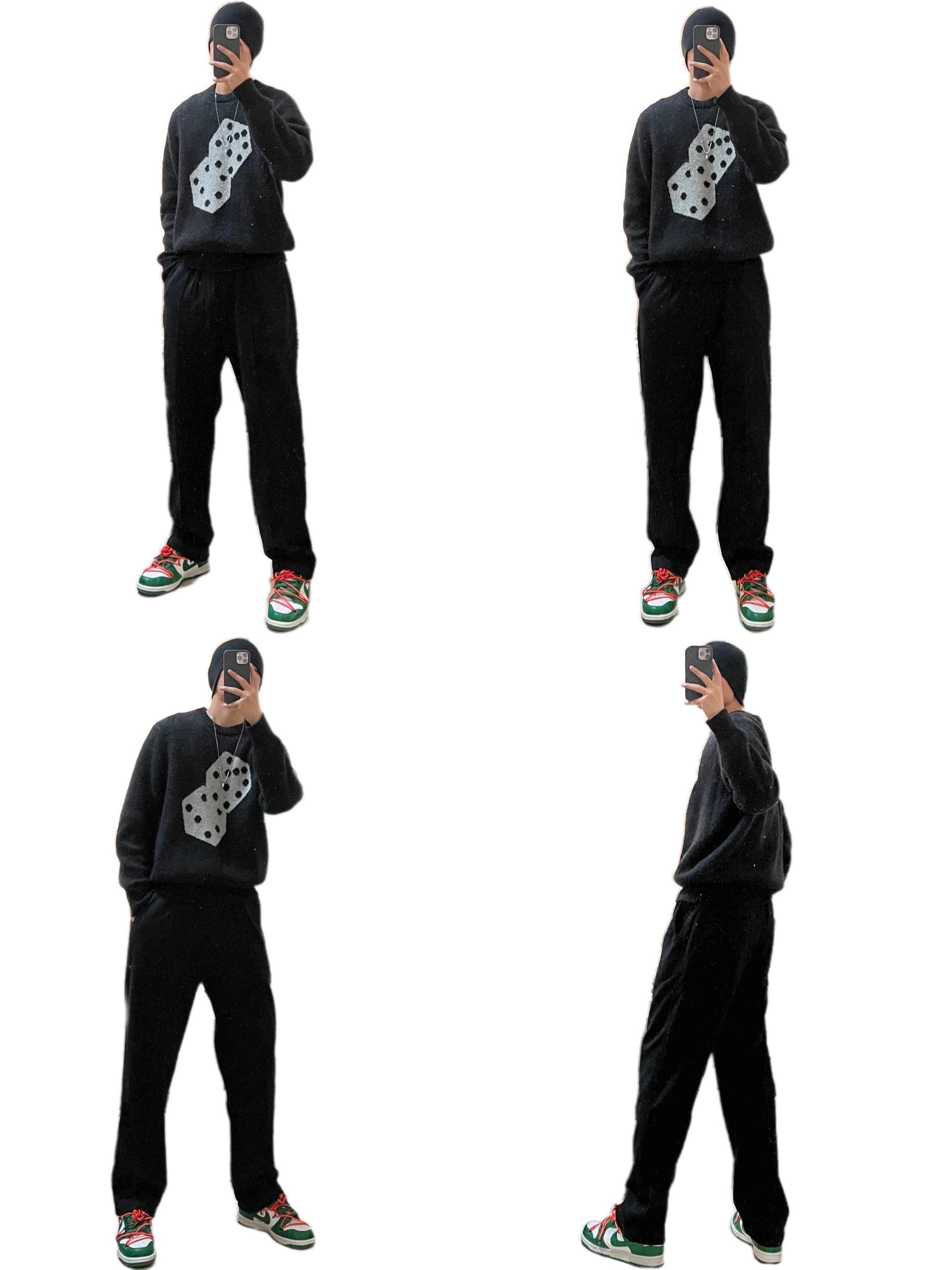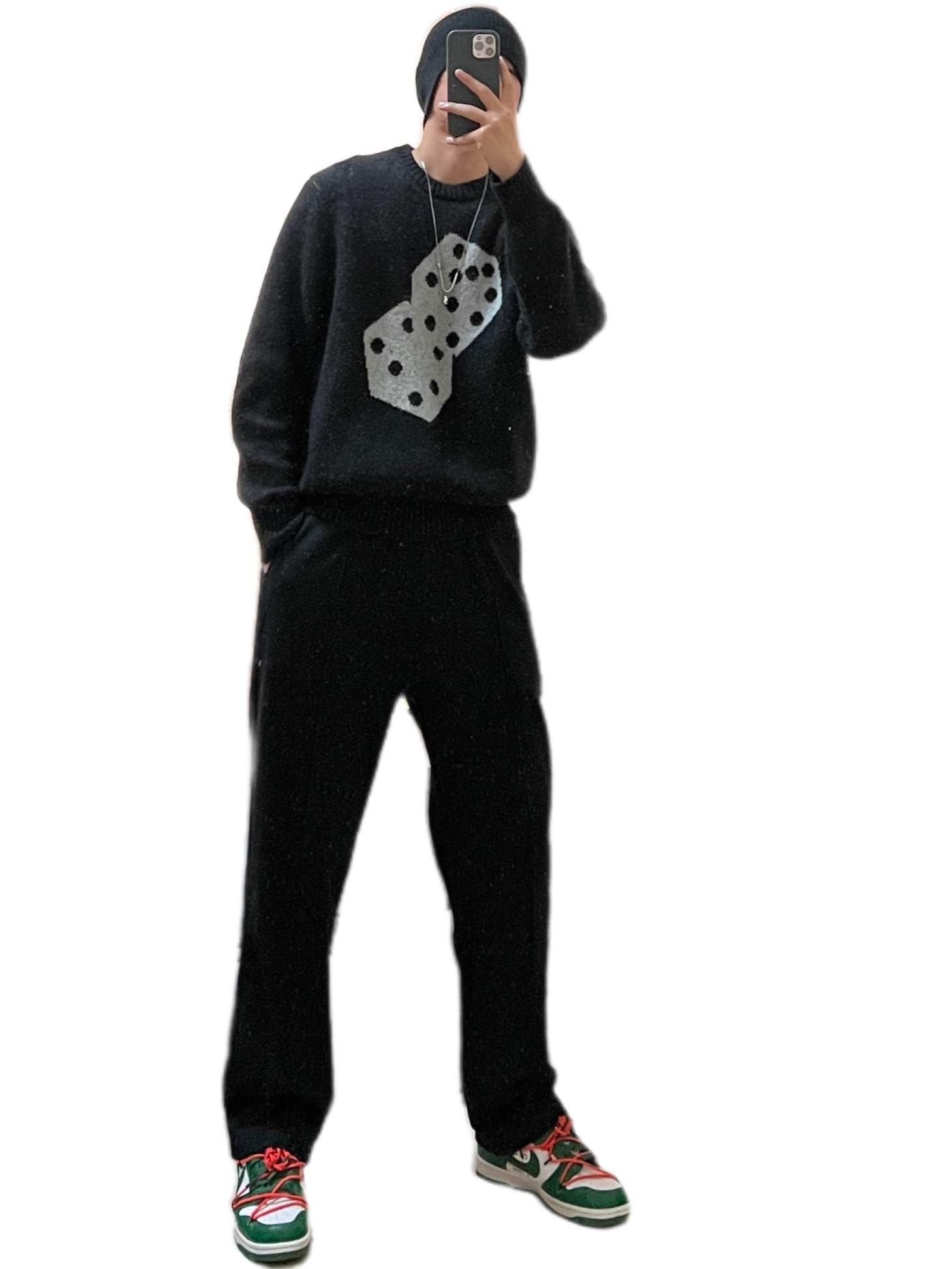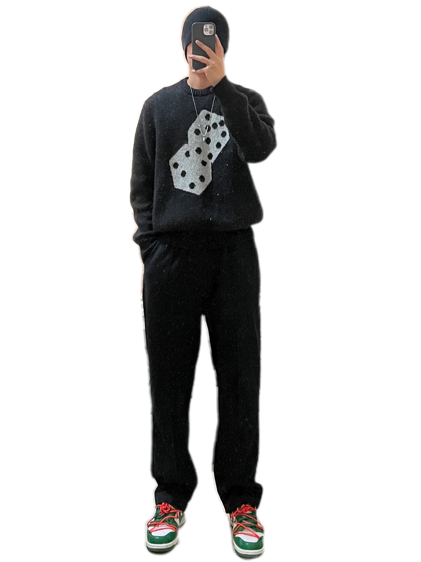 🌟推荐一款上身多次的黑色印花毛衣,超级好看!面料是马海毛的,穿上身一点也不扎,版型也很好看,那种欧美版型,个人是非常喜欢这种os版型的,尝试一下没有错,而且基础黑色,经典骰子印花,yyds! 🧢黑色棉帽 👔Stussy黑色骰子印花马海毛毛衣 👖黑色直筒长裤 👟owdunk白绿