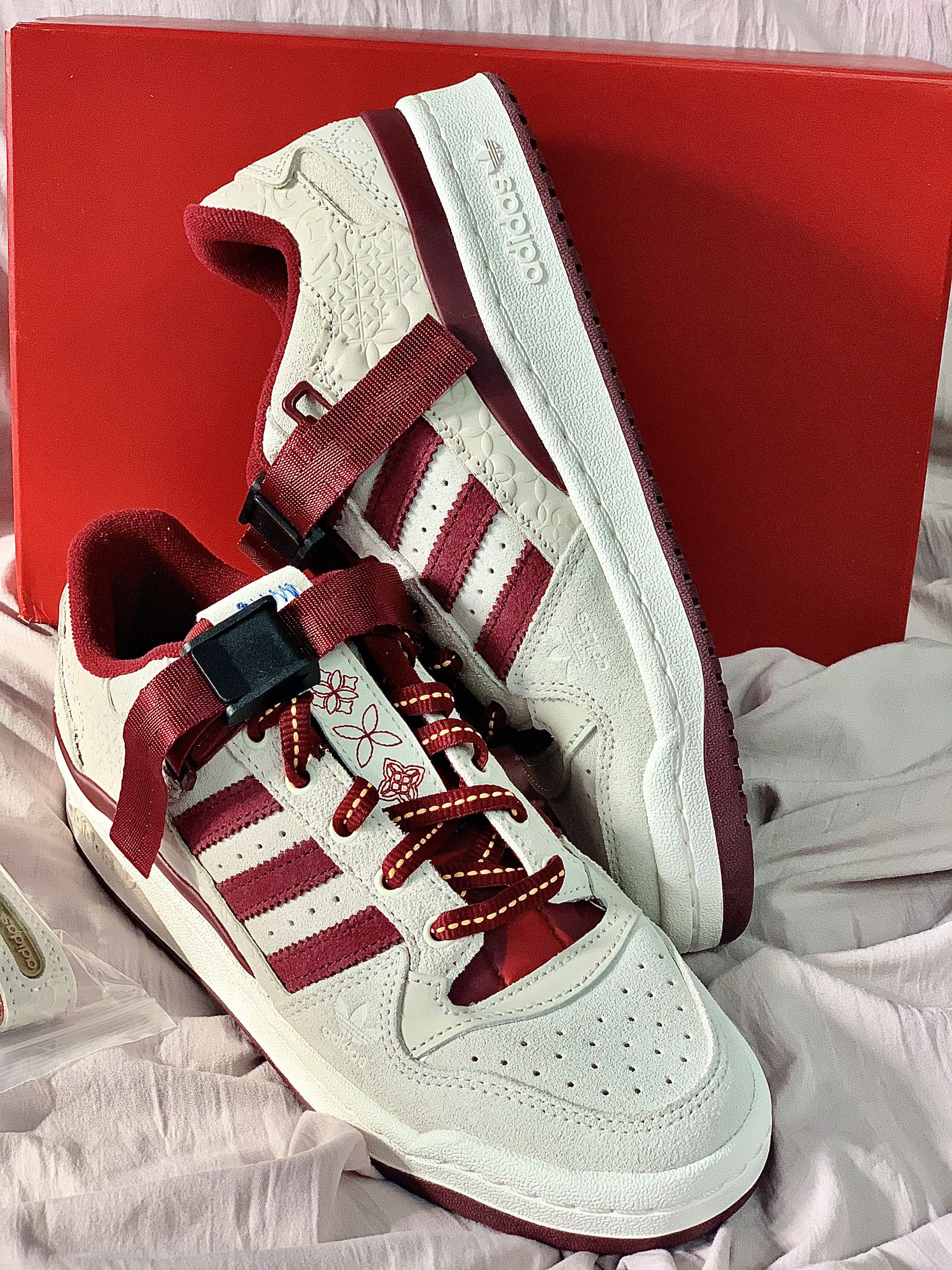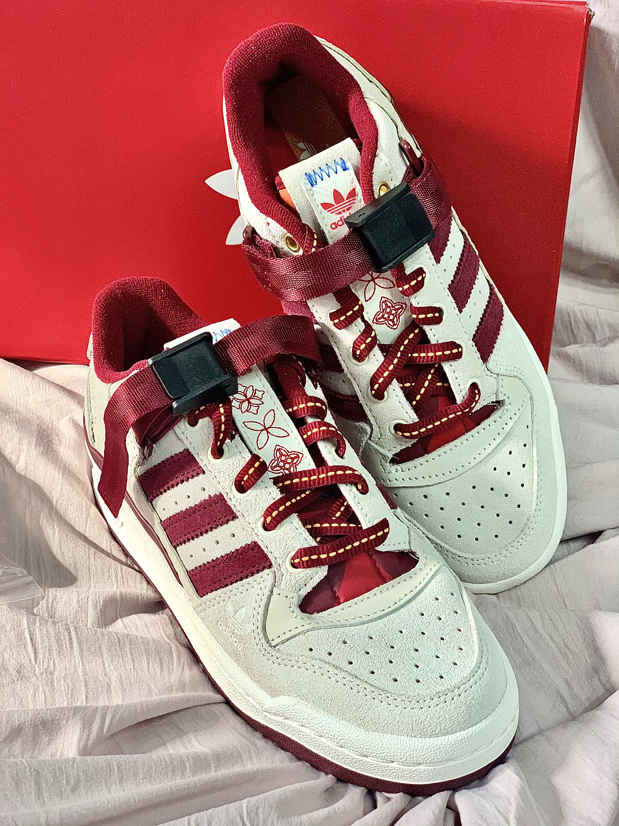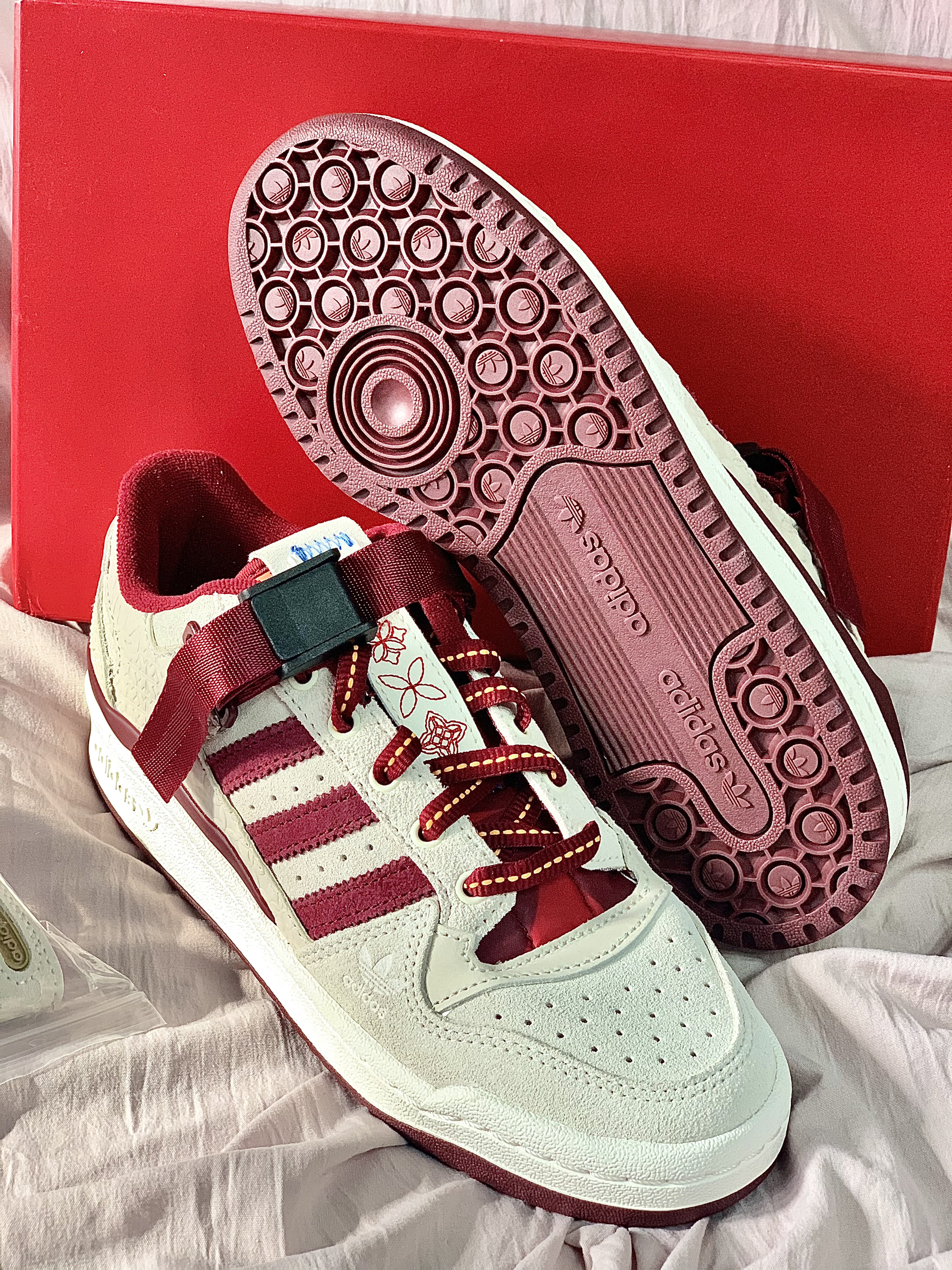 👟鞋款名称 adidas originals Forum Low CNY 舒适耐磨板鞋 米白红 中国年 男女同款 虎年 鞋面是比较复古的米白色主配色,酒红色点缀,过年穿它颜值巅峰!麂皮和皮革的材质,鞋侧不仅有三条杠标志,而且鞋舌部位还加入了中国风元素!按扣绑带的设计更加有效的贴合脚部,橡胶大底防滑耐磨绝对可以 这是一双非常适合过年穿的一款鞋子,特别喜庆百搭 鞋码推荐:正常码数