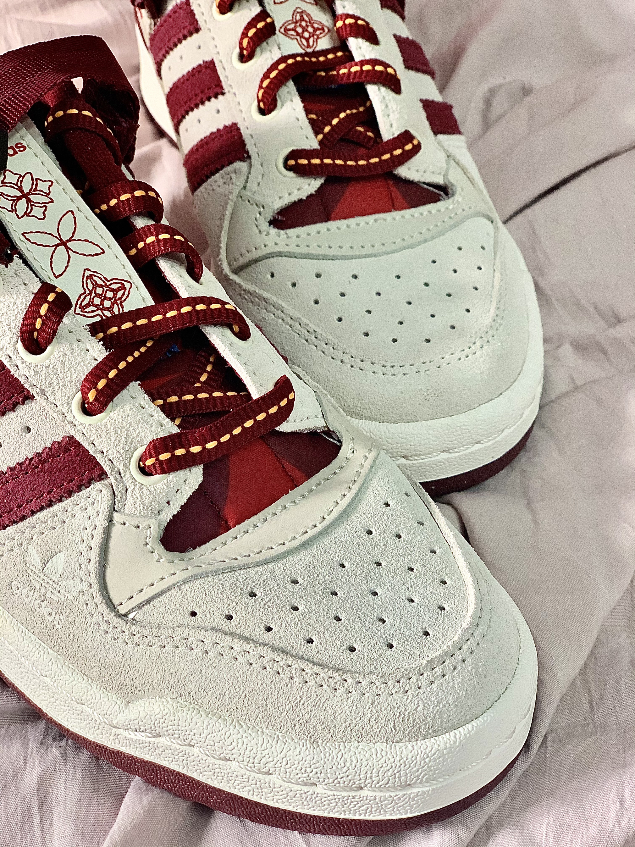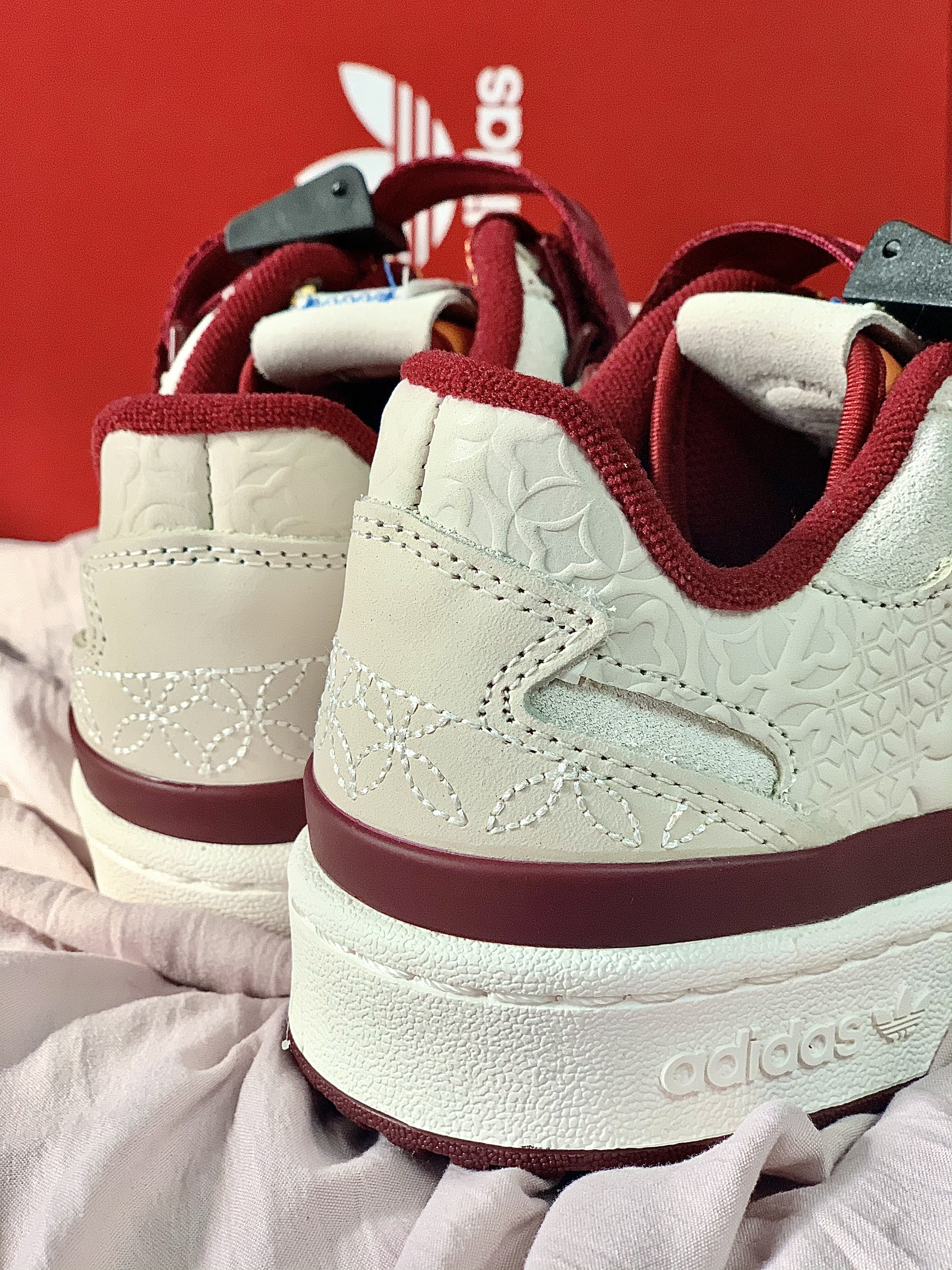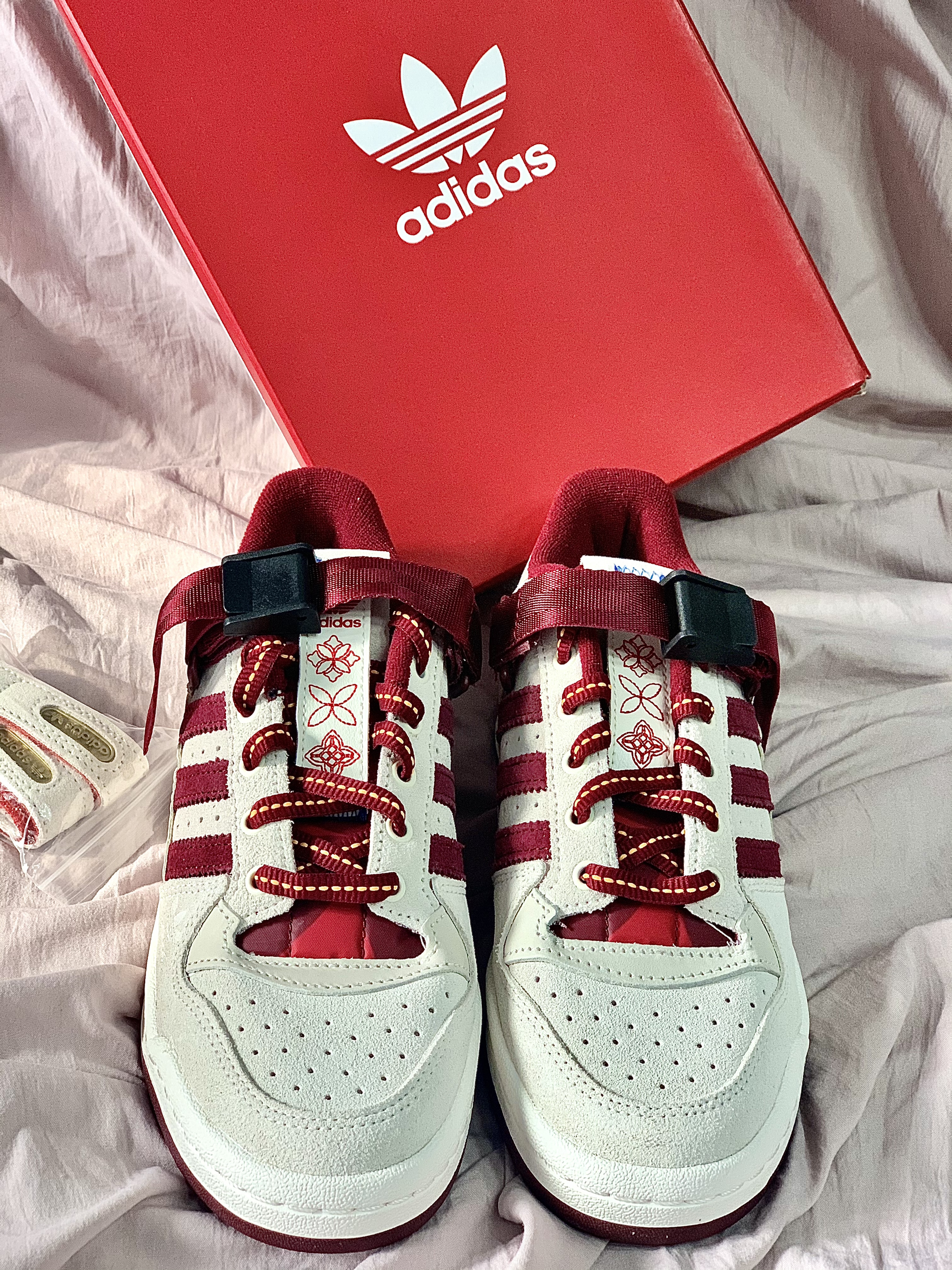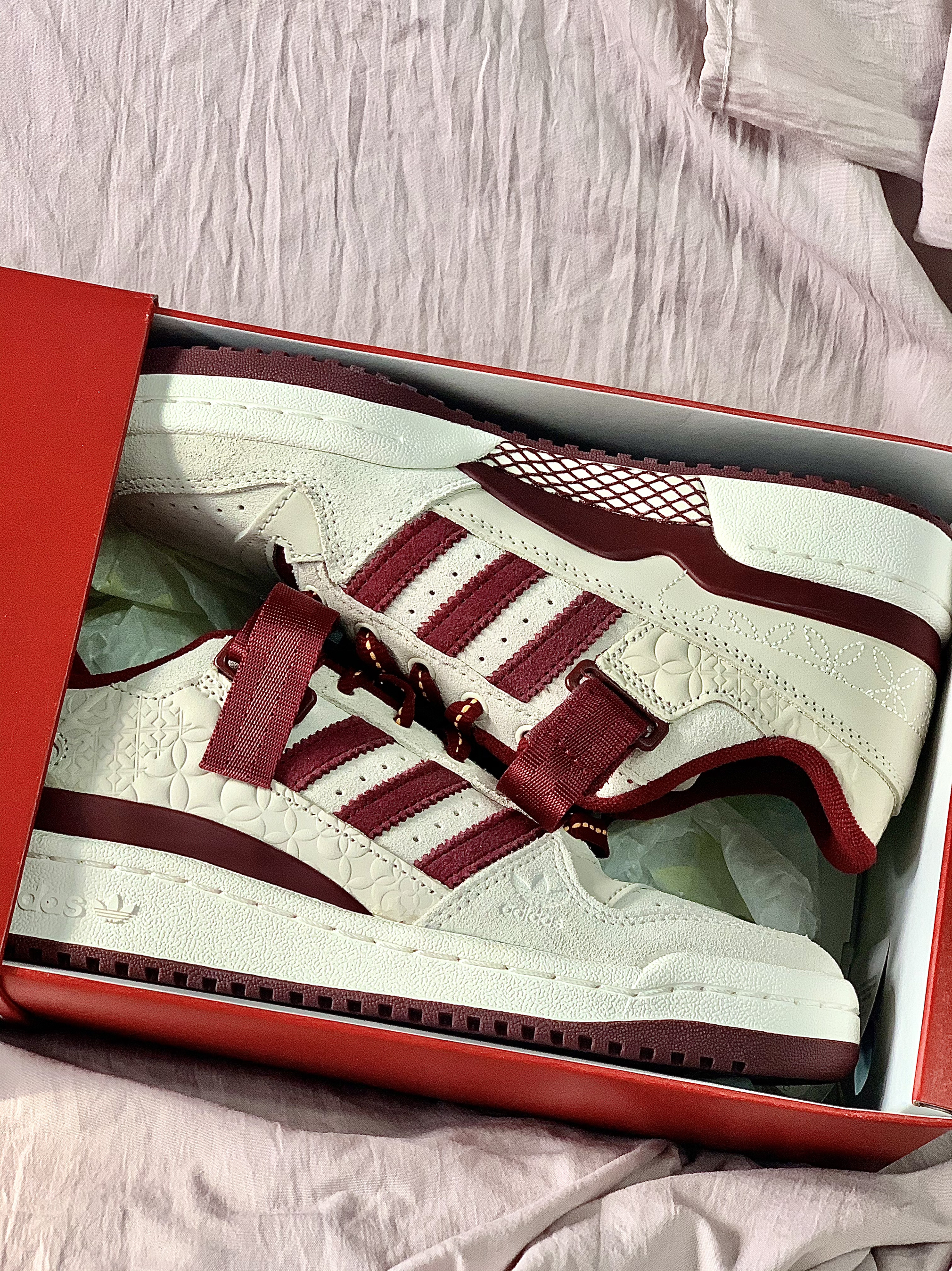 👟鞋款名称 adidas originals Forum Low CNY 舒适耐磨板鞋 米白红 中国年 男女同款 虎年 鞋面是比较复古的米白色主配色,酒红色点缀,过年穿它颜值巅峰!麂皮和皮革的材质,鞋侧不仅有三条杠标志,而且鞋舌部位还加入了中国风元素!按扣绑带的设计更加有效的贴合脚部,橡胶大底防滑耐磨绝对可以 这是一双非常适合过年穿的一款鞋子,特别喜庆百搭 鞋码推荐:正常码数