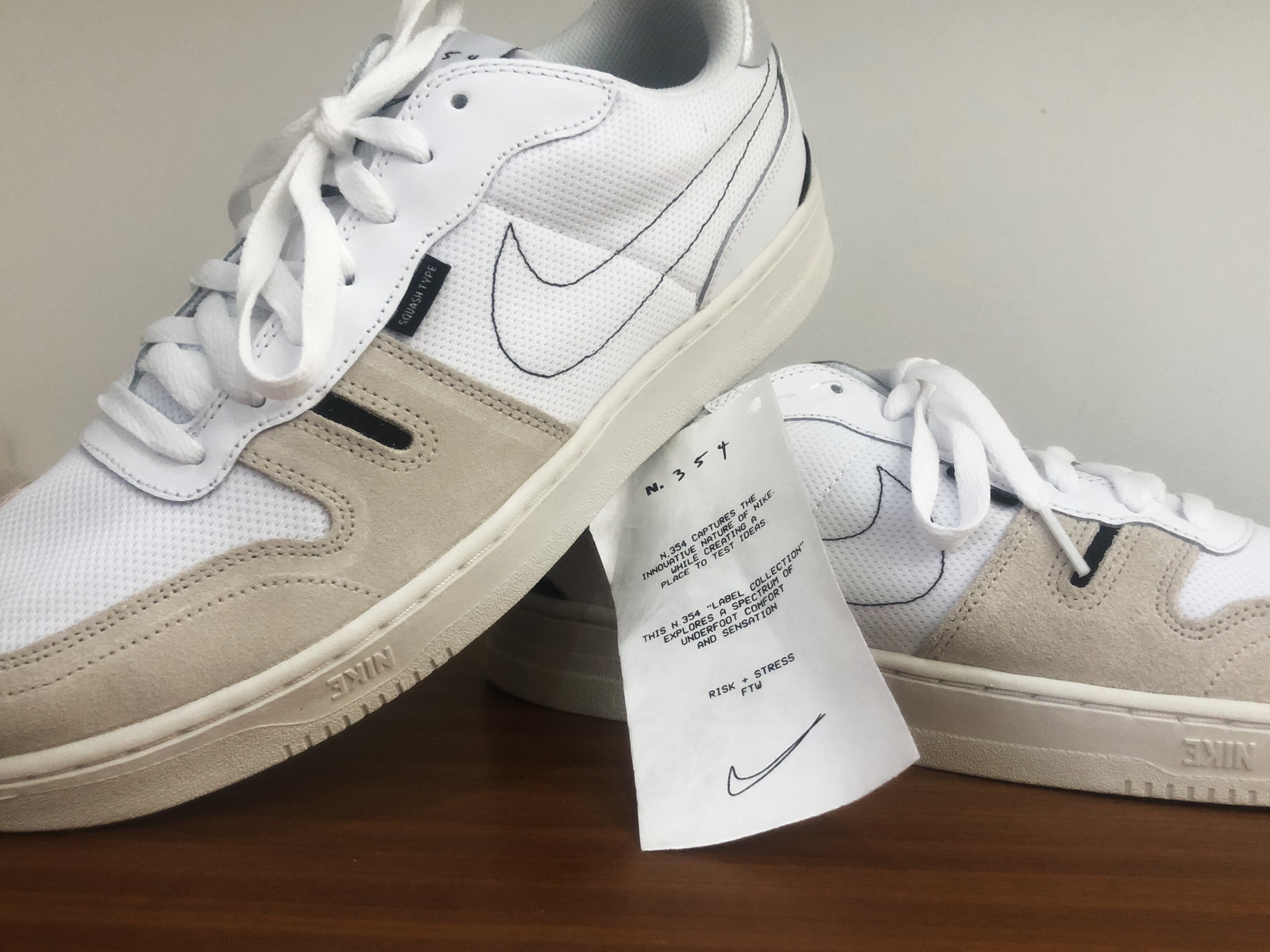 👟球鞋名称:NiKe Squash Type 🔍设计亮点:简约品牌标志,给人整体感觉就是很朴实无华,但是设计却是满满,前舌反光条,后背一小片N.354,鞋底是一个异形拼接的大底,很耐磨,每个鞋面侧下面有一个倒印Nike品牌英文,整体一个拼接加简约的风格。 📃总结一下:鞋子没啥科技,就是一个普通的板鞋,但是设计感让我喜欢上了这双板鞋,还有一个原因就是价格很便宜,适合学生党,搭配党入手,如果喜欢脚感...