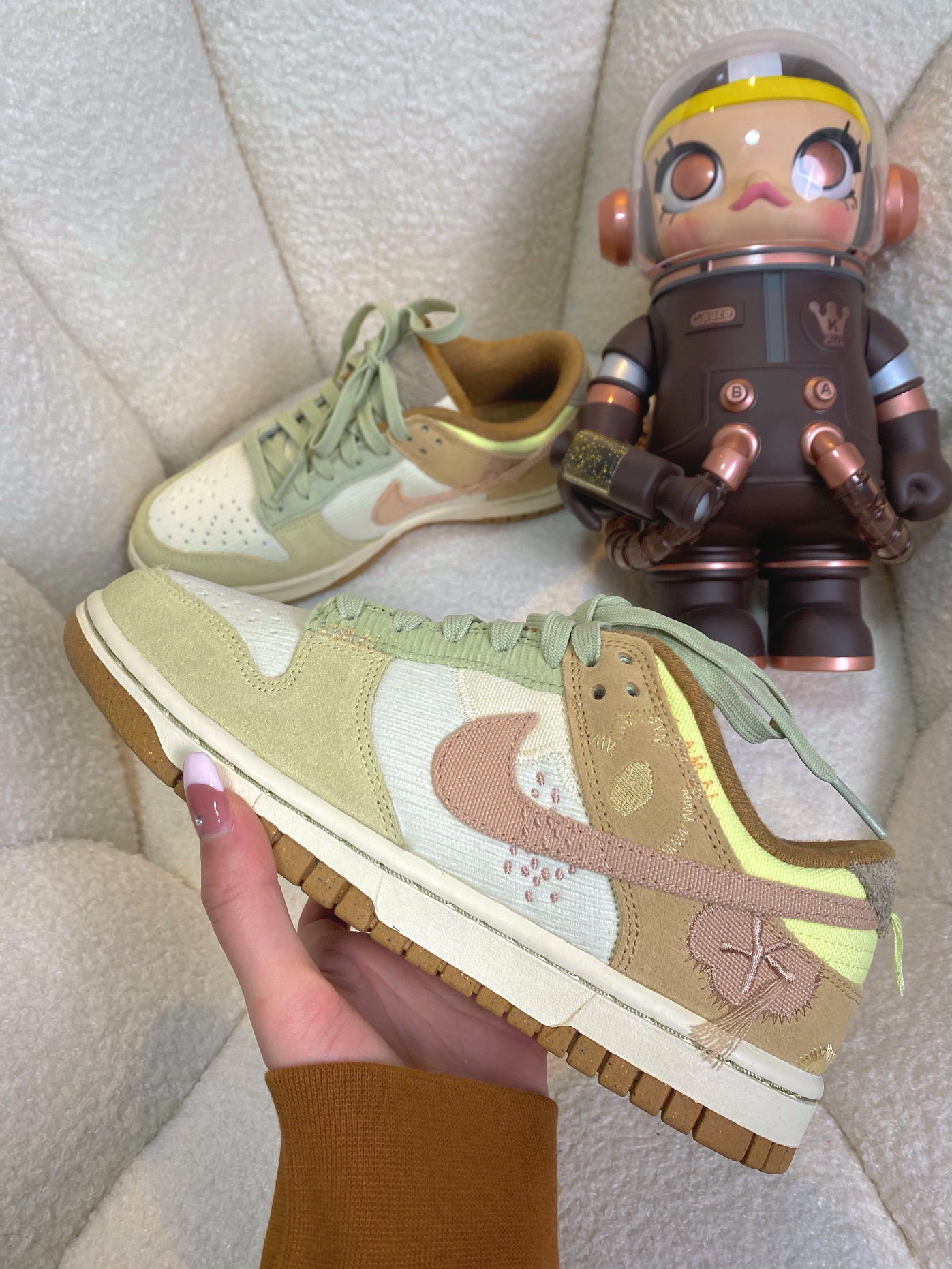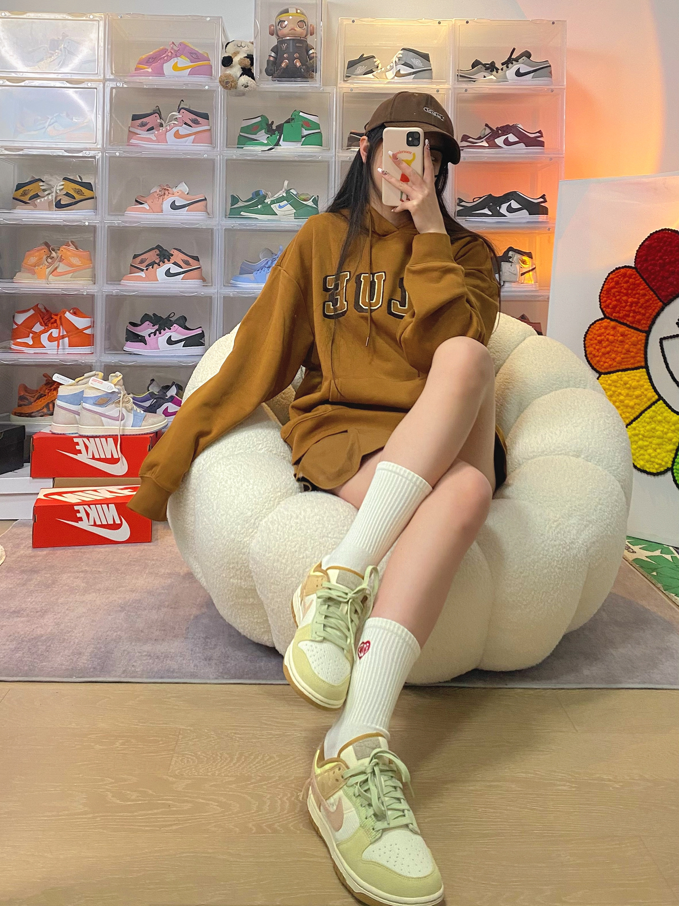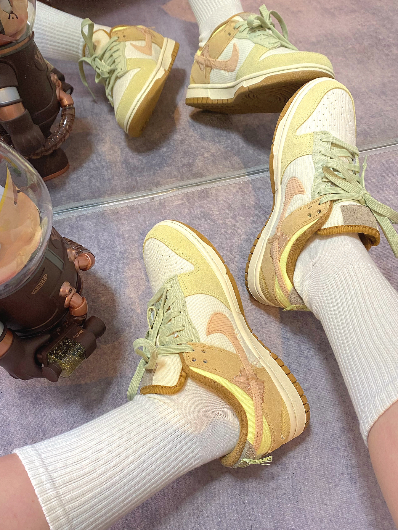 今天刚到货的新鞋子 还热乎着就来给姐妹们分享一下上脚效果 这双dunk的配色可以用可春可秋冬来形容 🍃鞋面是嫩绿色➕卡其色➕嫩黄色 ✔勾子️是藕粉色 🍂鞋底咖啡色 是回收材料 配色也太小清新~ 灯芯绒材质 所以可能不太适合夏天 细节处有很多“线头”点缀 还蛮有意思的 👟:dunk 白绿粉 灯芯绒 🧥:nothomme