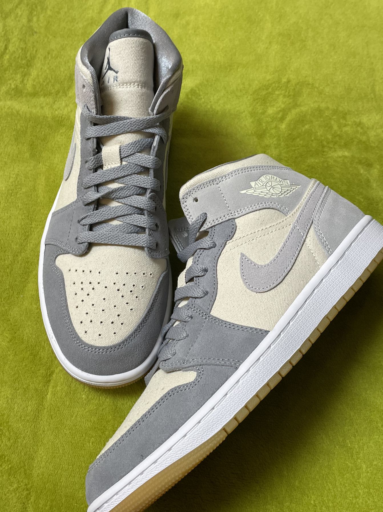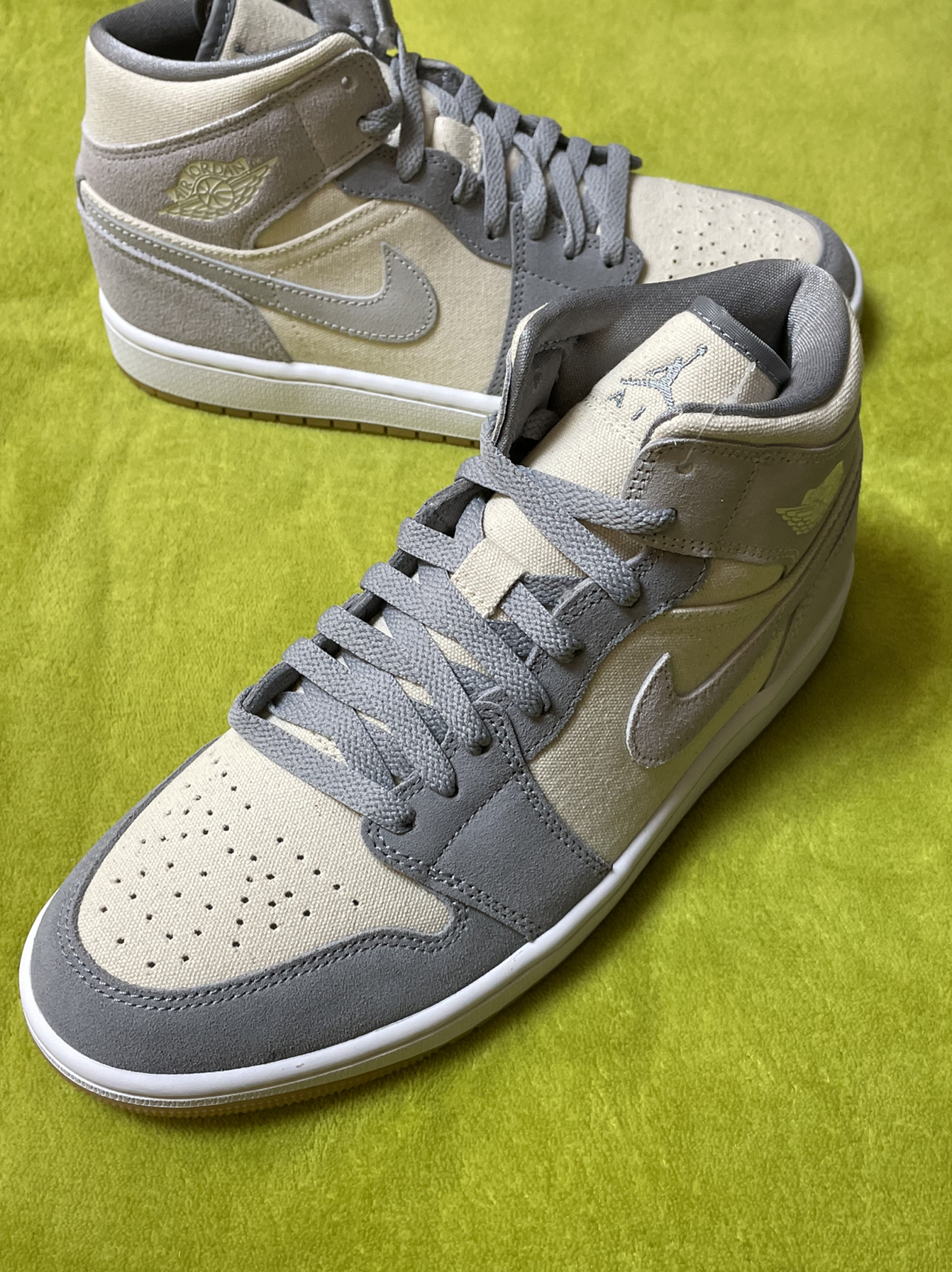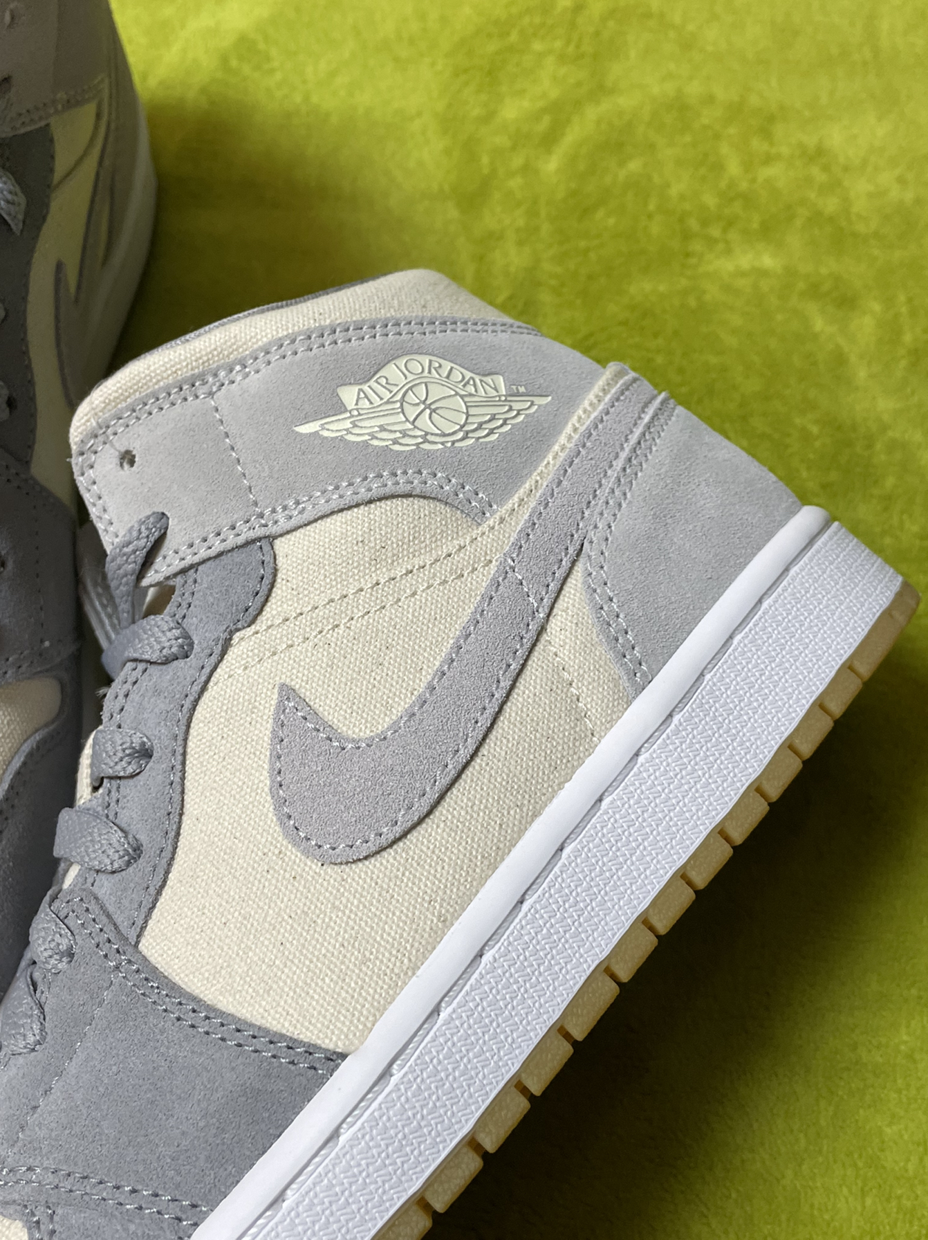 👟:Air Jordan1MidSECoconutMilk”复古篮球鞋米灰色 椰奶 这双鞋子鞋头、鞋带穿孔、Swoosh、后跟、鞋带采用灰色,鞋面、鞋舌、鞋中采用奶油色,中底采用白色,鞋舌鞋垫都有着乔丹飞人Logo,鞋帮飞翼Logo依旧经典,鞋面整体采用细腻绒面革+帆布材质组成,生胶鞋底也很亮眼! 整体而言,鞋子很好搭配衣服,可以说很是百搭!
